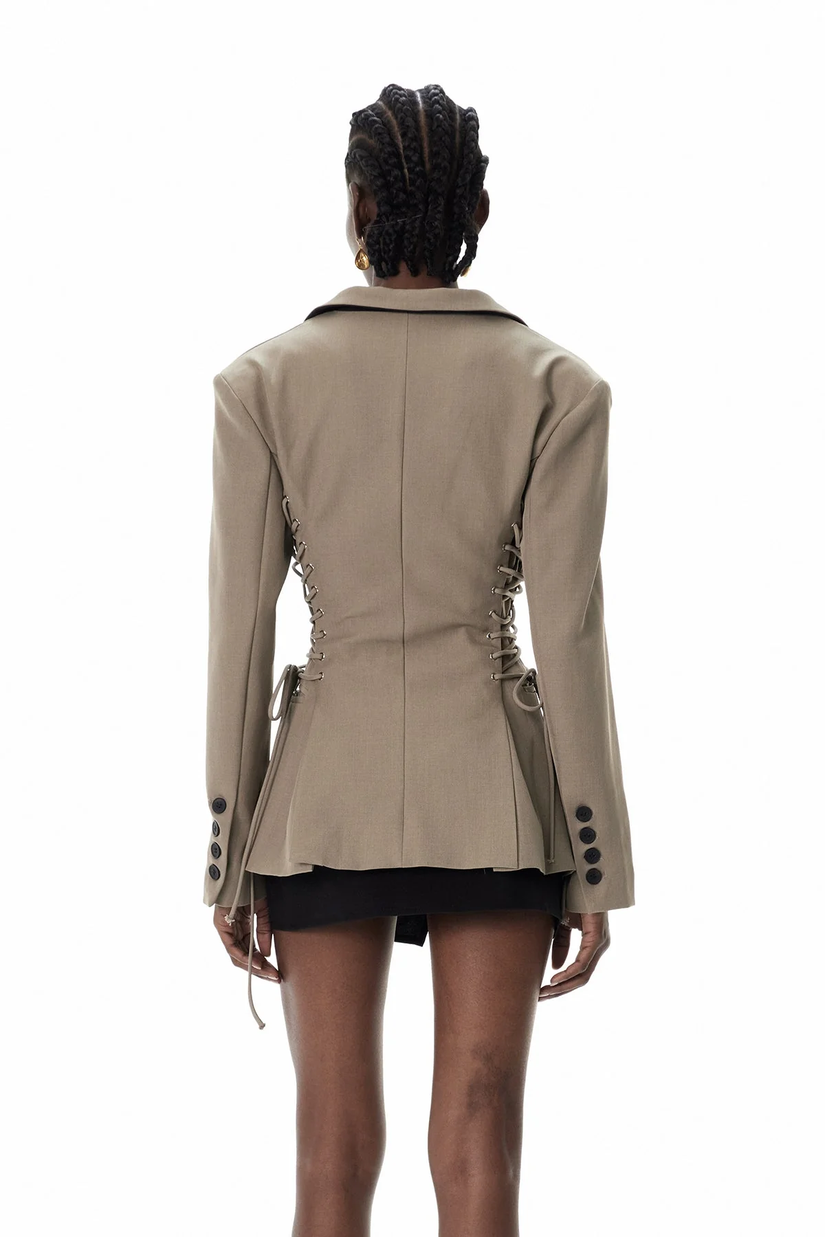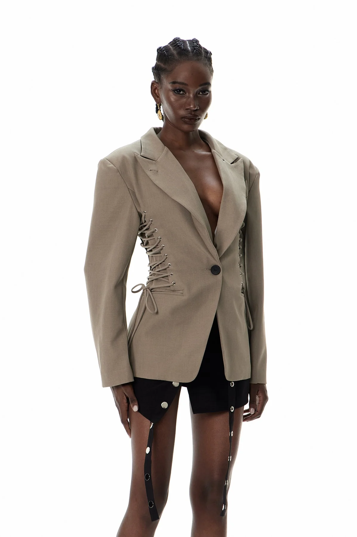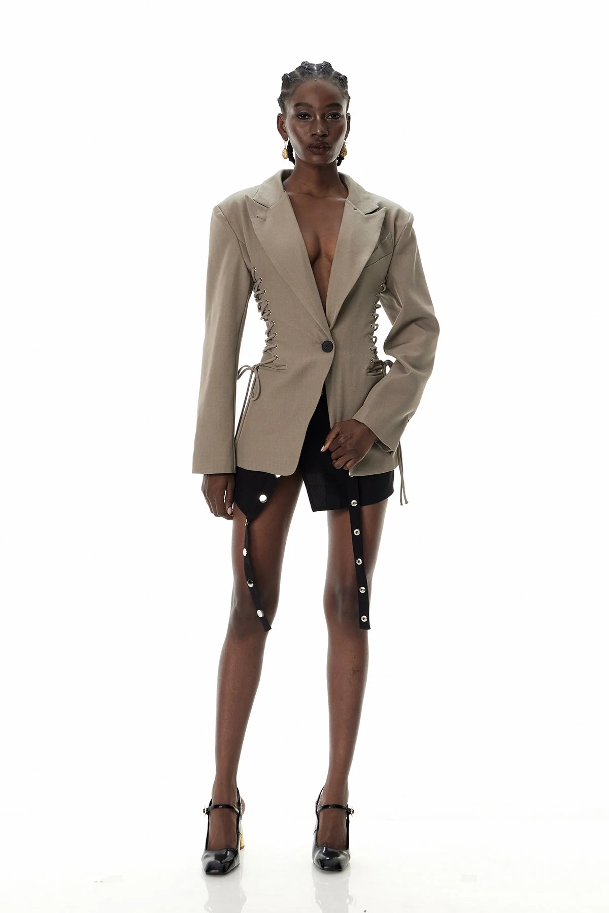 Experience the epitome of elegance with our Crescenzo Lace-Up Blazer. Tailored to perfection, this blazer features a unique lace-up detail on the lapel, adding a touch of originality to your look. Ideal for formal occasions requiring a balance of style and authority, this blazer exudes confidence and refinement. Discover unmatched sophistication today! The blazer is available in three versatile sizes: S, M, L.