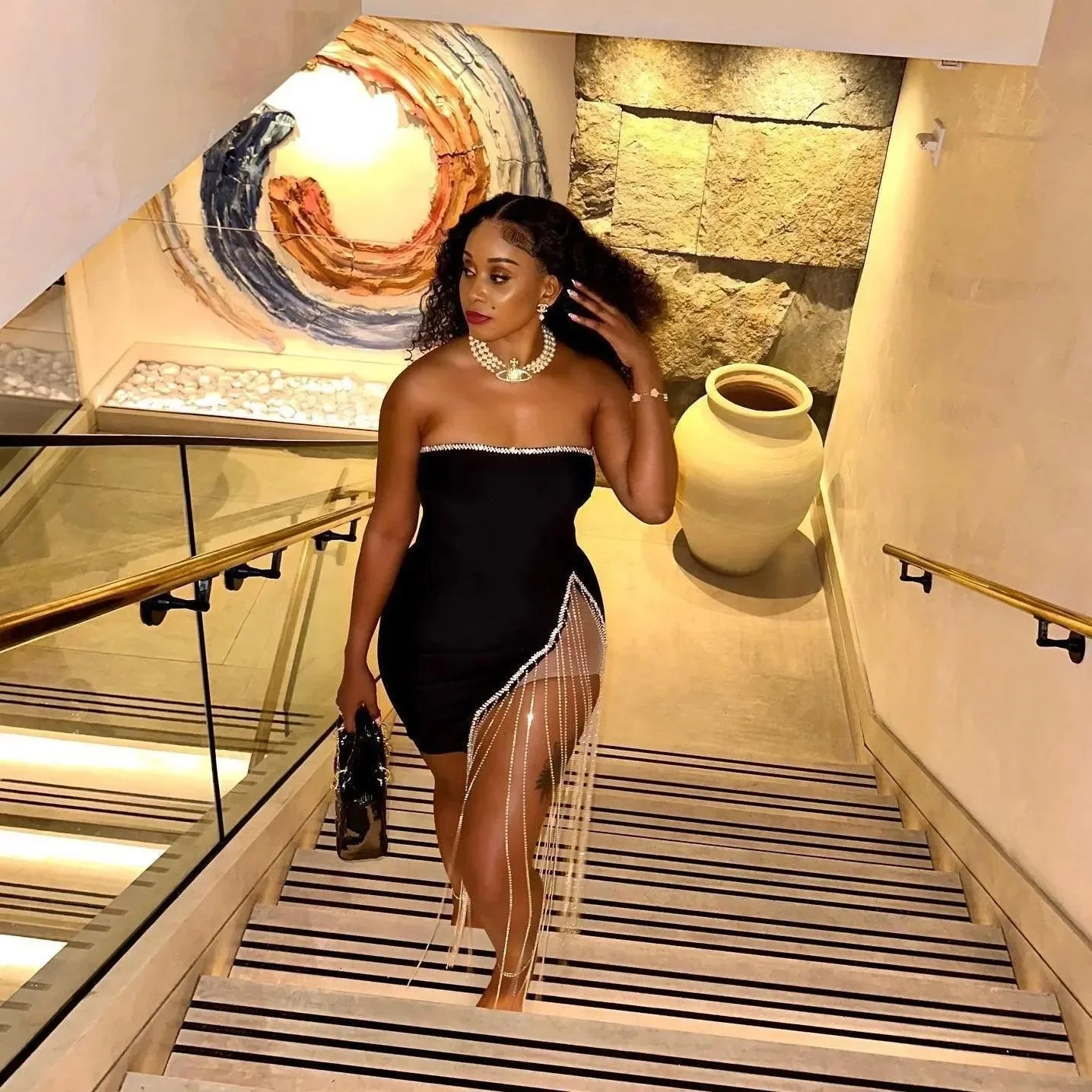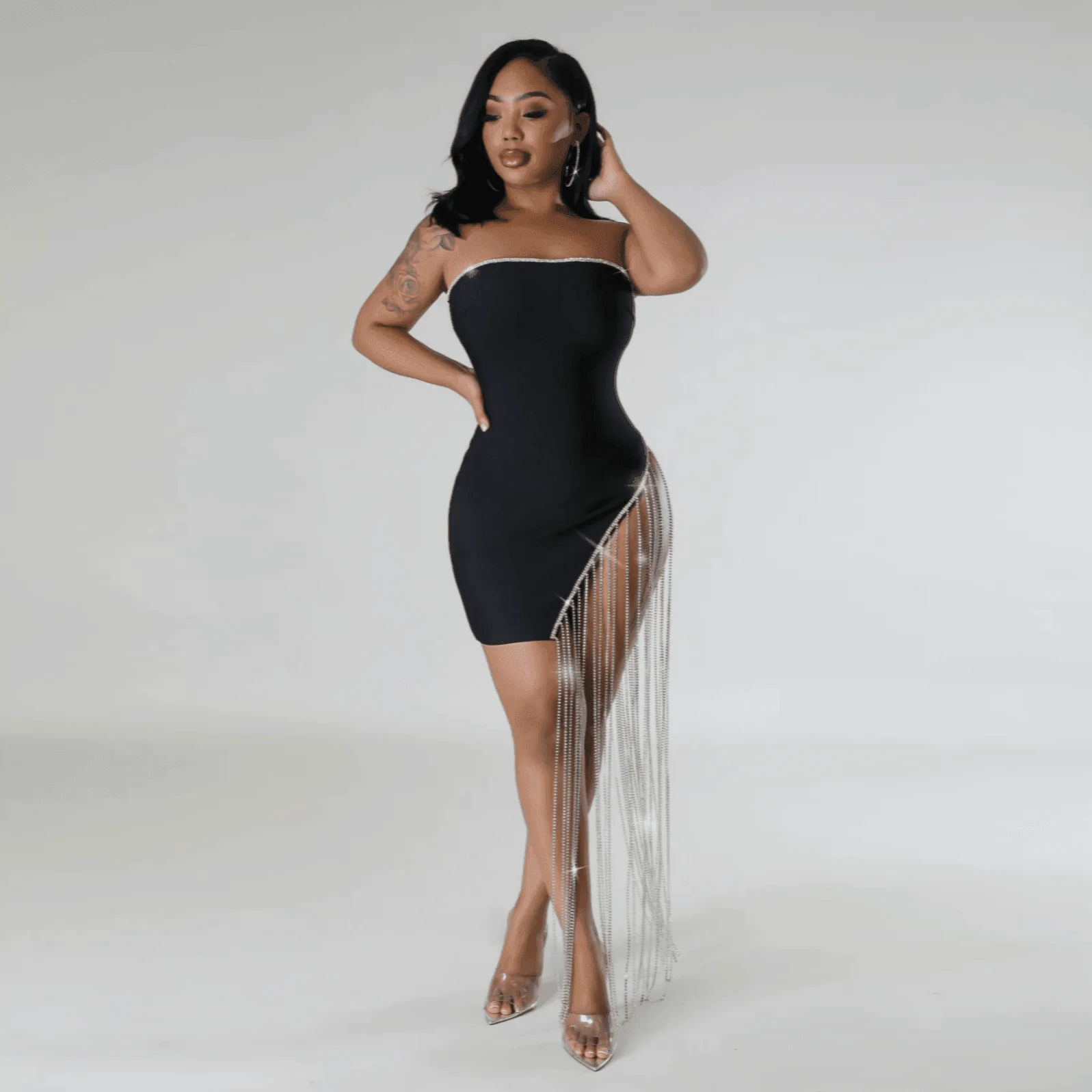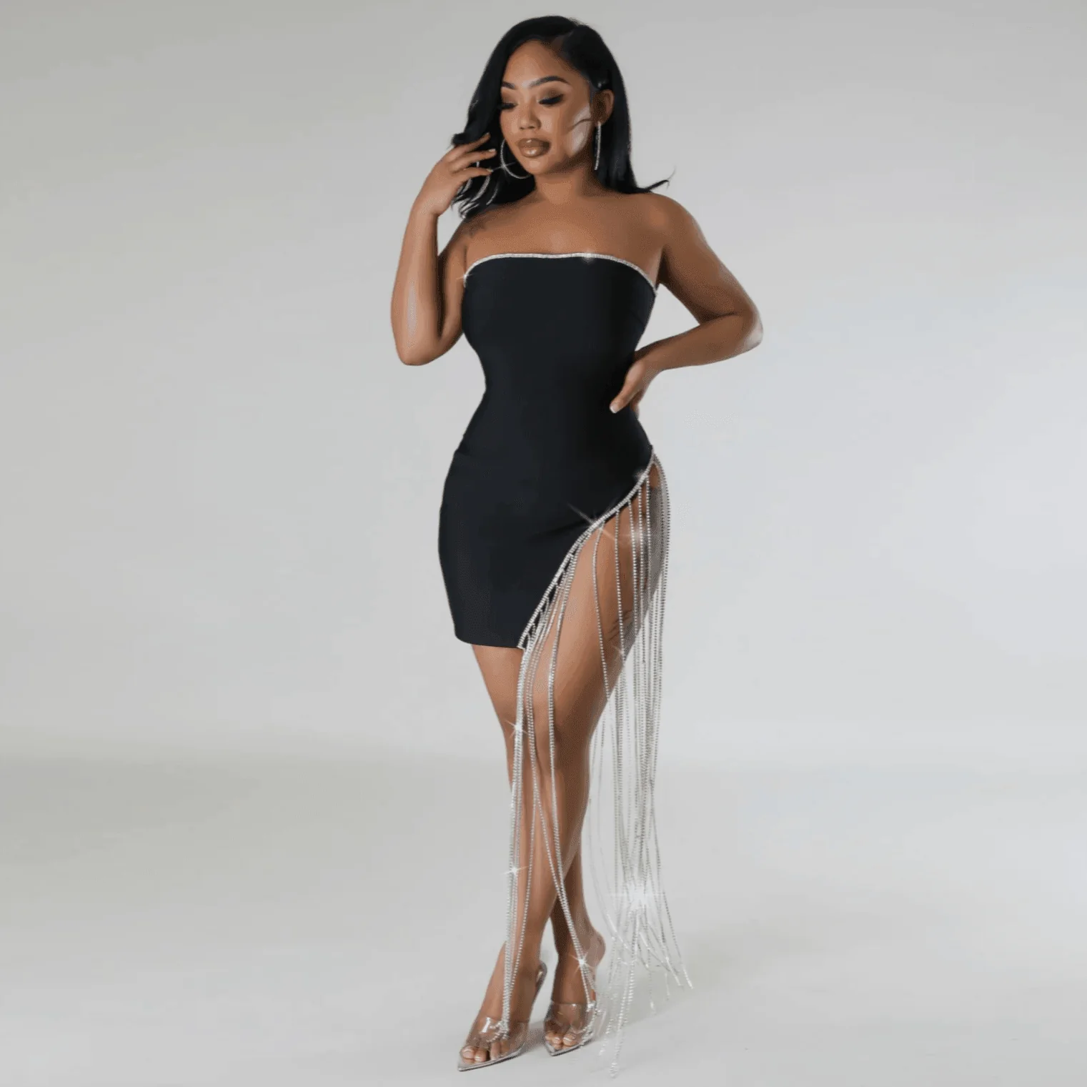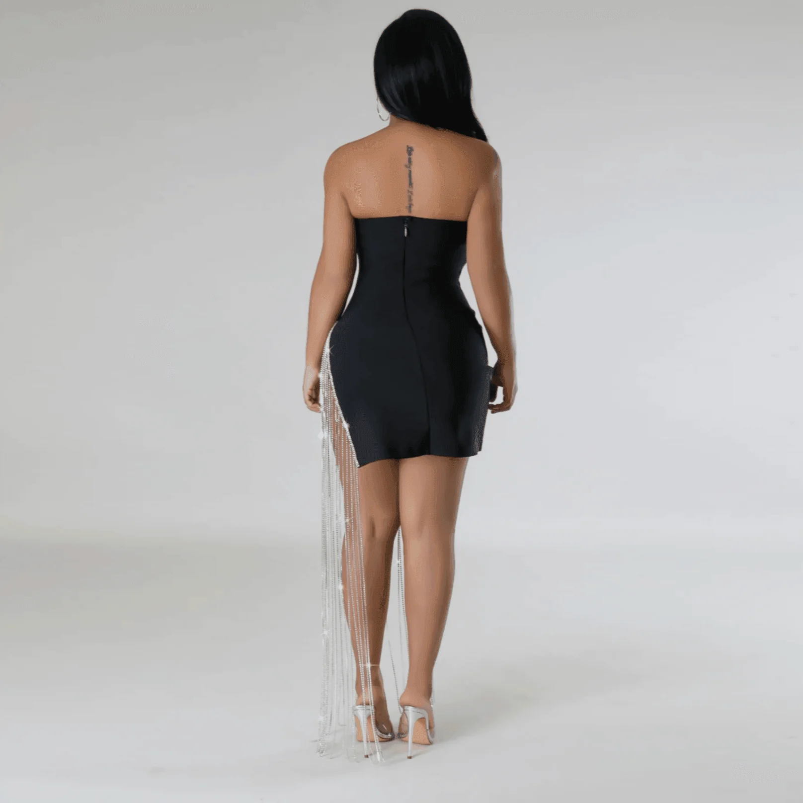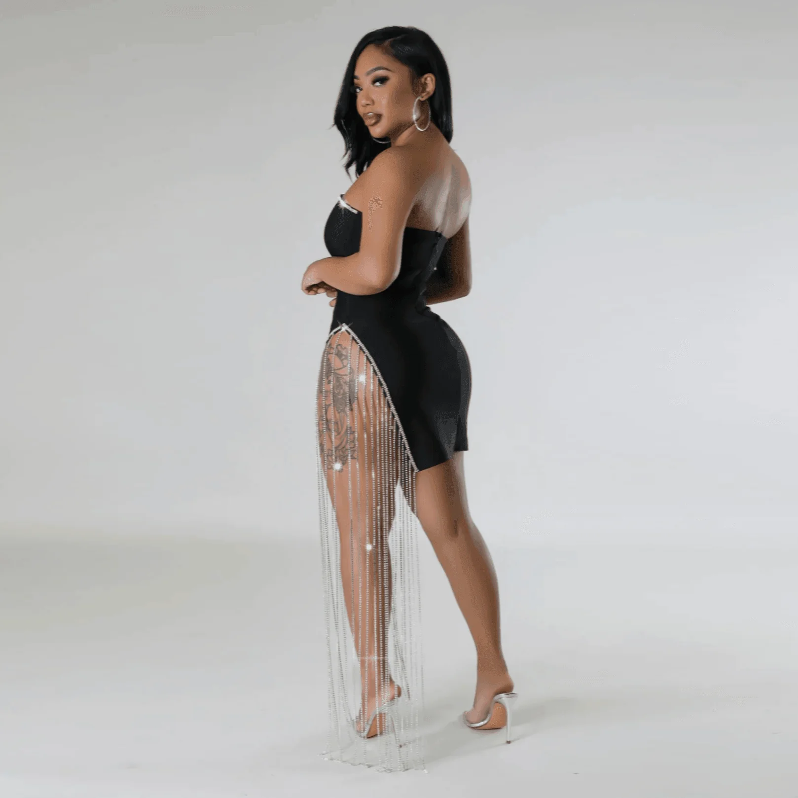 Make a dazzling entrance in our Sparkling Crystal Bodycon Tassel Mini Dress. This dress features exquisite crystal embellishments that shimmer luxuriously, perfect for catching the light and turning heads wherever you go. The bodycon silhouette is designed to accentuate your curves elegantly, while the diamond tassel detail adds a touch of glamour and sophistication to your look. Crafted from premium bandage material, this dress offers both comfort and support, ensuring you feel confident all night long. Explore more style ideas on Instagram @mermaid_way. Stand out at any occasion with this striking dress, ideal for parties and special events where you want to make a lasting impression. Enjoy a complimentary exchange if the fit is not perfect. Elevate your wardrobe with our Sparkling Crystal Bodycon Tassel Mini Dress today!