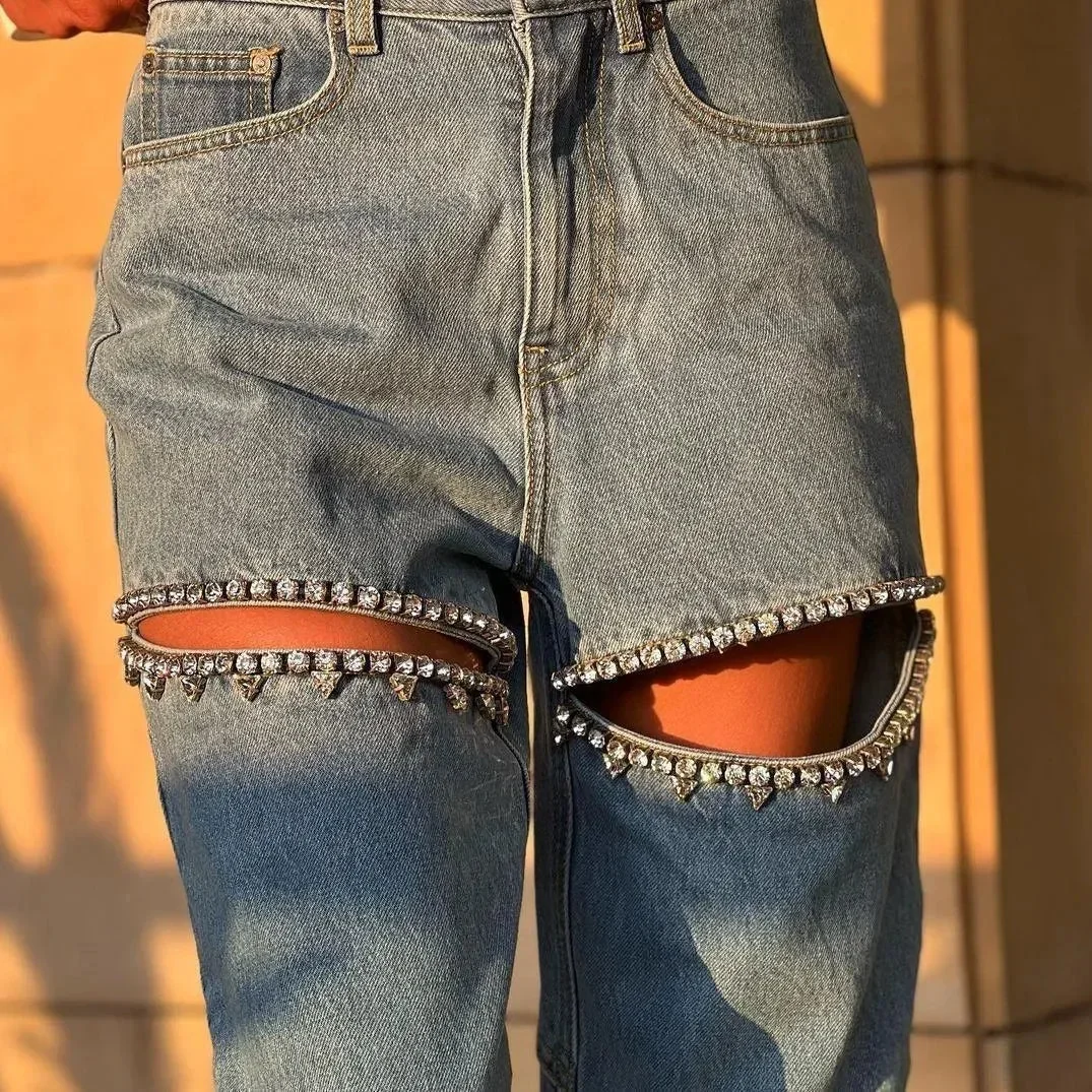 Elevate your style with our Sparkling Embellished High-Rise Denim Jeans. Crafted from premium denim, these jeans feature a chic cutout design with sparkling embellishments for a touch of glam. The high-rise fit ensures comfort and a flattering silhouette all day long. Perfect for making a bold fashion statement, these jeans are versatile and durable. Explore endless outfit possibilities with these unique high-rise jeans. Shop now and add some sparkle to your wardrobe!
