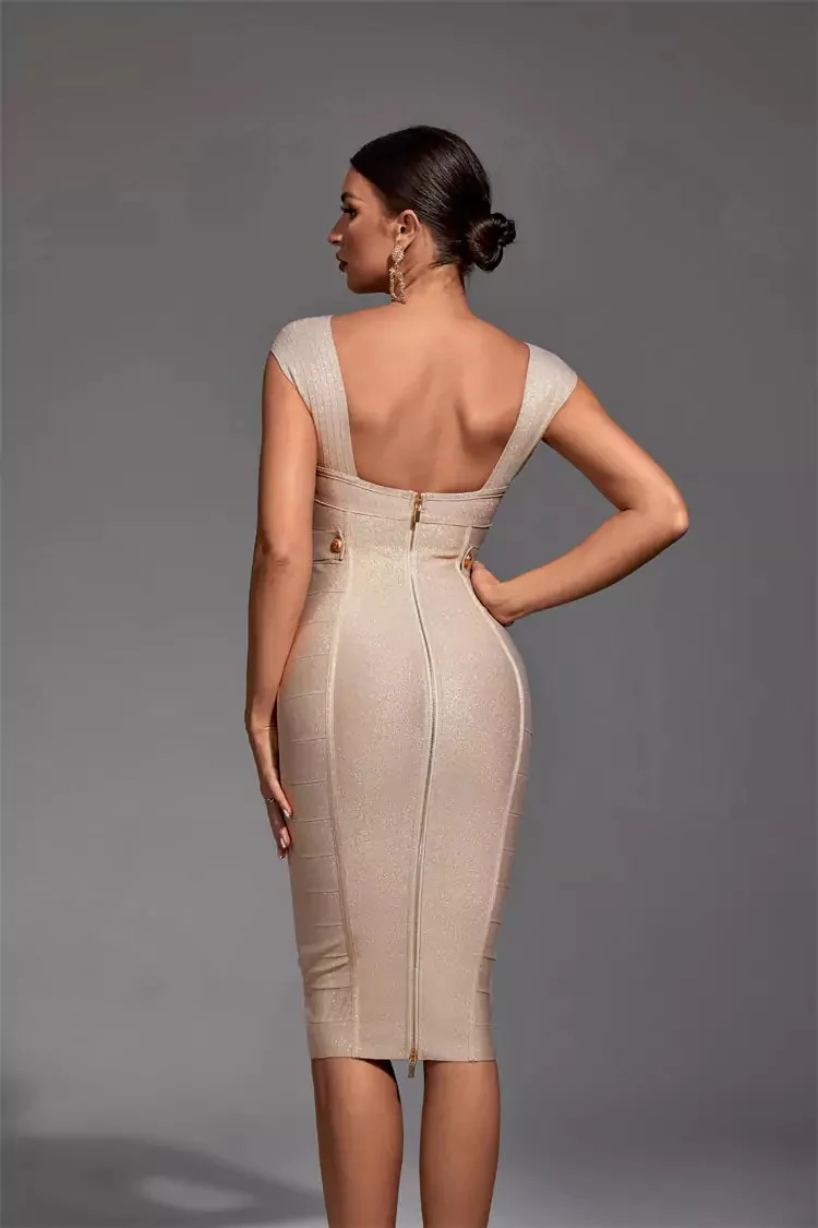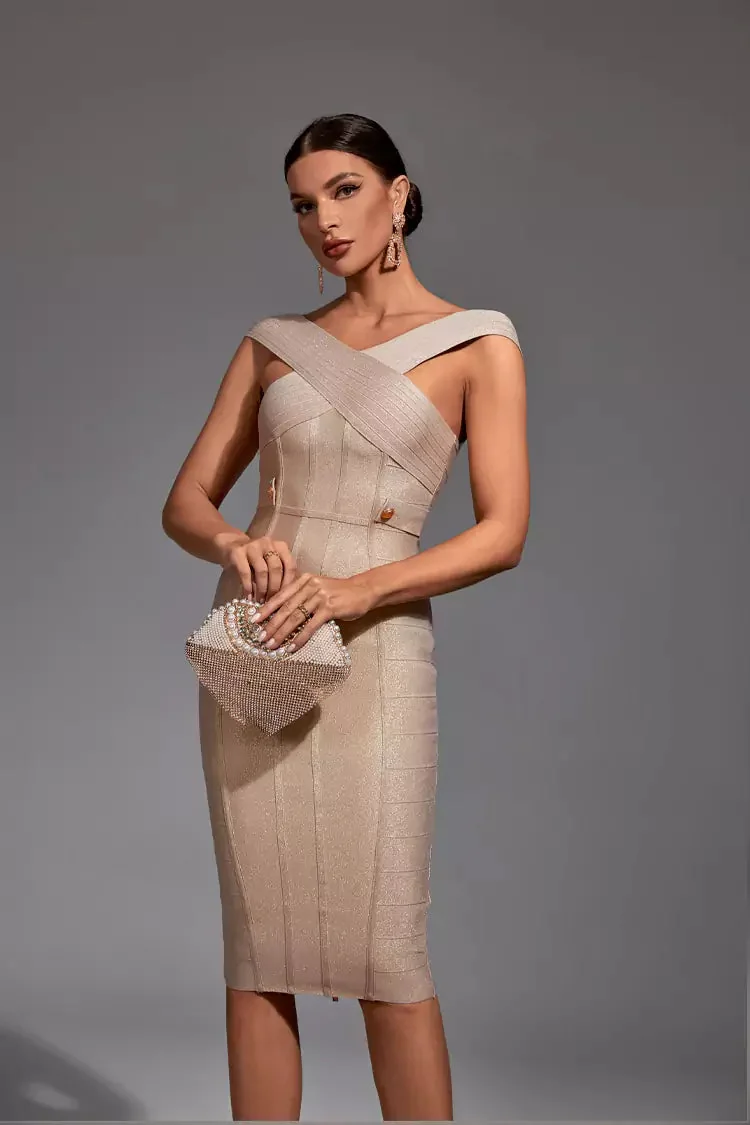 Make a dazzling statement at social events with our Richilde Gold Strapless Sequin Cross Dress. This sophisticated mini dress features a slim mini-length cut, crisscross chest straps, and a shimmering sequin design that will have you sparkling like a disco ball all night long. Elevate your look by pairing it with heeled mules and a clutch for a chic ensemble that is sure to turn heads. Crafted from a bandage material (90% Rayon, 9% Nylon, 1% Spandex) with stretch for comfort. Includes gentle dry clean care instructions. Model height: 5 ft 7 in. Dress length approximately 104cm. Please refer to the size chart for the best fit.