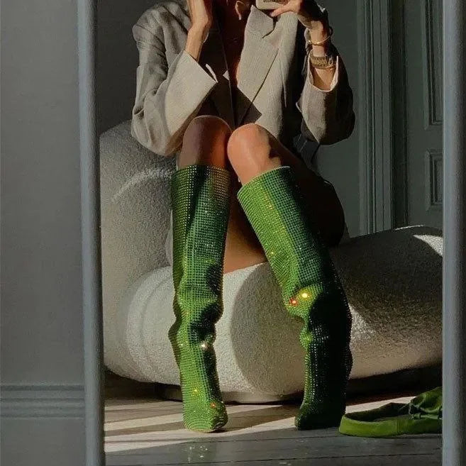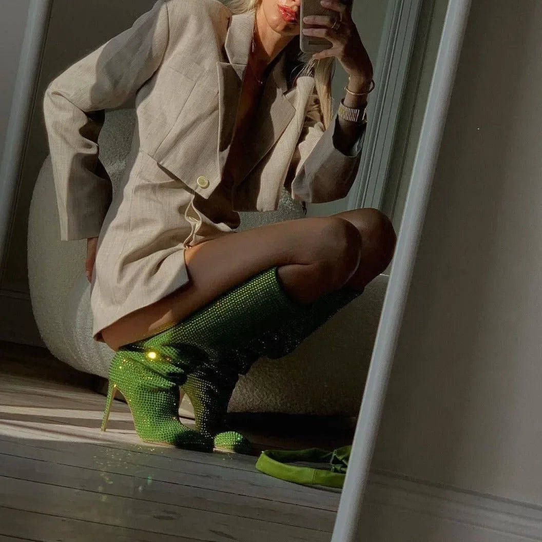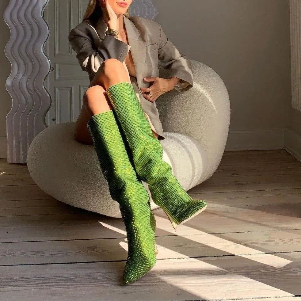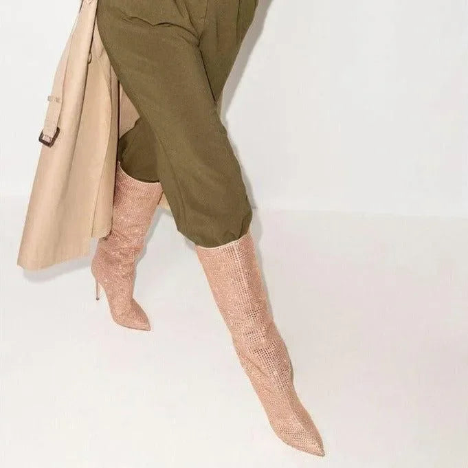 Elevate your style with our Sparkling Rhinestone Knee-High Stilettos Boots. These eye-catching boots feature dazzling rhinestones and a chic pointed toe design, perfect for glamorous events and bold fashion statements. Designed for comfort and style, these stilettos seamlessly transition from day to night. The glittering accents and sleek silhouette guarantee you stand out wherever you go. A wardrobe essential, these boots combine style and sparkle to add glamour to any outfit. Find your perfect match for the next special occasion! For more style inspiration, visit our Instagram @mermaid_way. Make a statement with these must-have Stilettos Boots!