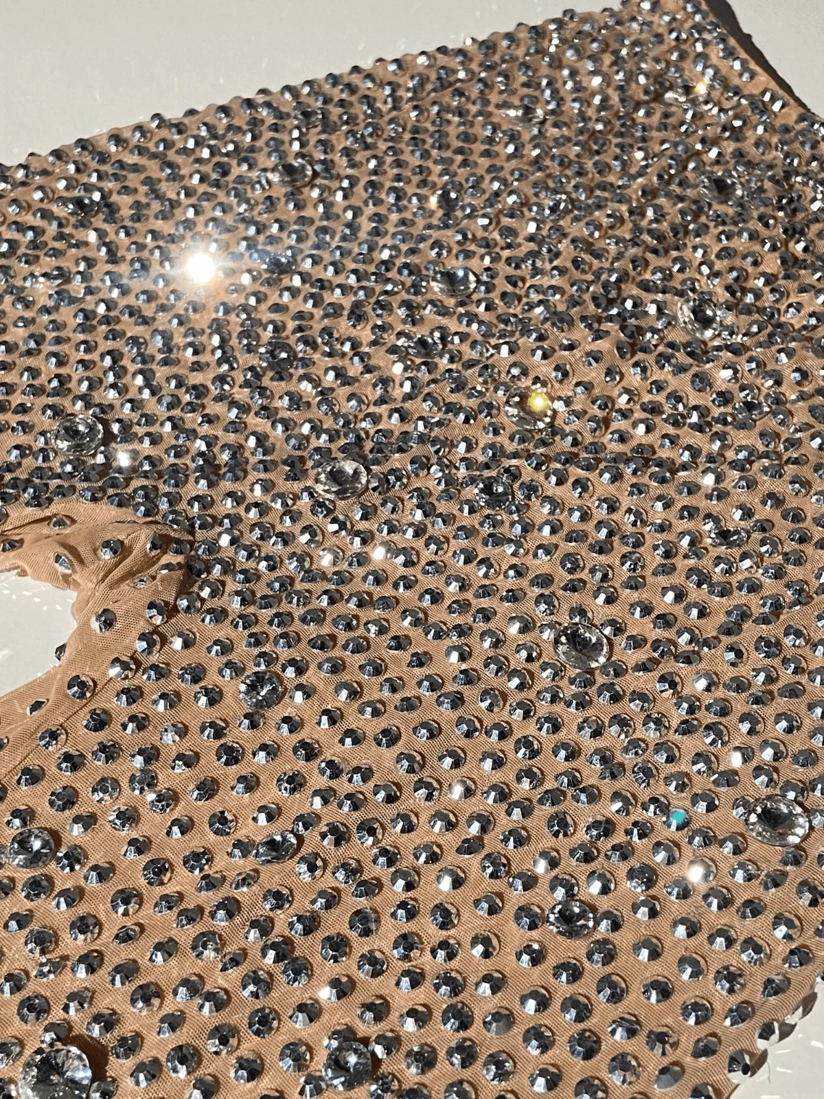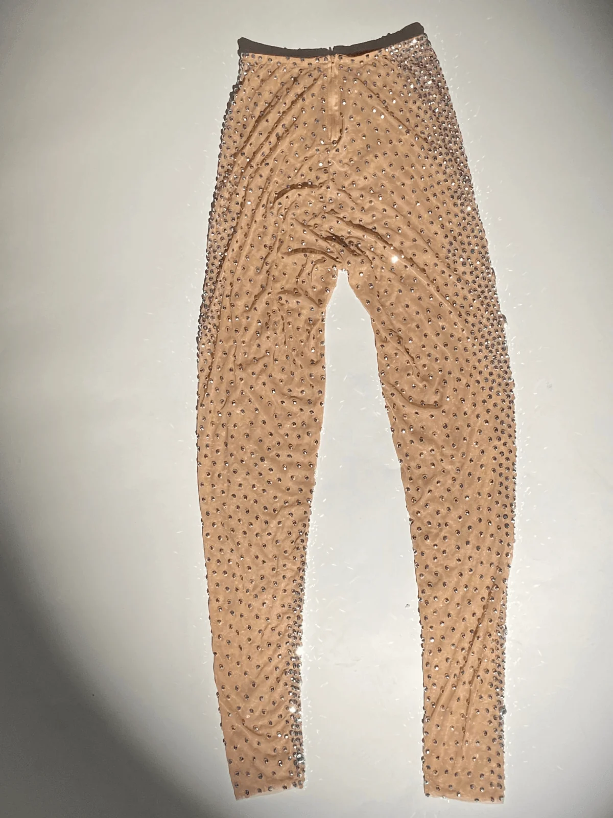 Elevate your look with these stunning rhinestone mesh pants in light nude. Crafted from 100% polyester, these pants shimmer with elegance and style. The invisible zipper at the back ensures a seamless fit. Perfect for special occasions, these pants add a touch of glamour to your outfit. They offer a slight stretch for comfort and are to be dry cleaned only. Please note that the color may vary slightly due to lighting. Feel radiant in these pants that pair perfectly with the matching bodysuit (sold separately).