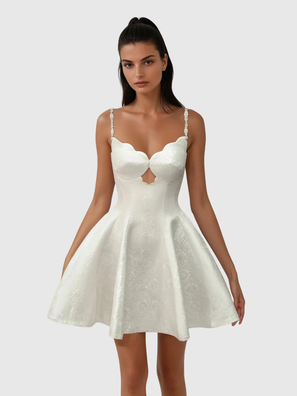 Elevate your style with our Sparkling Rhinestone Sleeveless Mini Dress. Effortlessly turning heads, this chic dress features delicate spaghetti straps and shimmering rhinestone embellishments that beautifully catch the light. Ideal for unforgettable nights out or special occasions, this mini-length dress combines sophistication with a flirty edge. Experience charming elegance and dazzling style all in one versatile dress. Crafted from 100% polyester material. Dry clean only recommended. Please note, color may vary due to lighting in images. Model showcased is wearing size S.