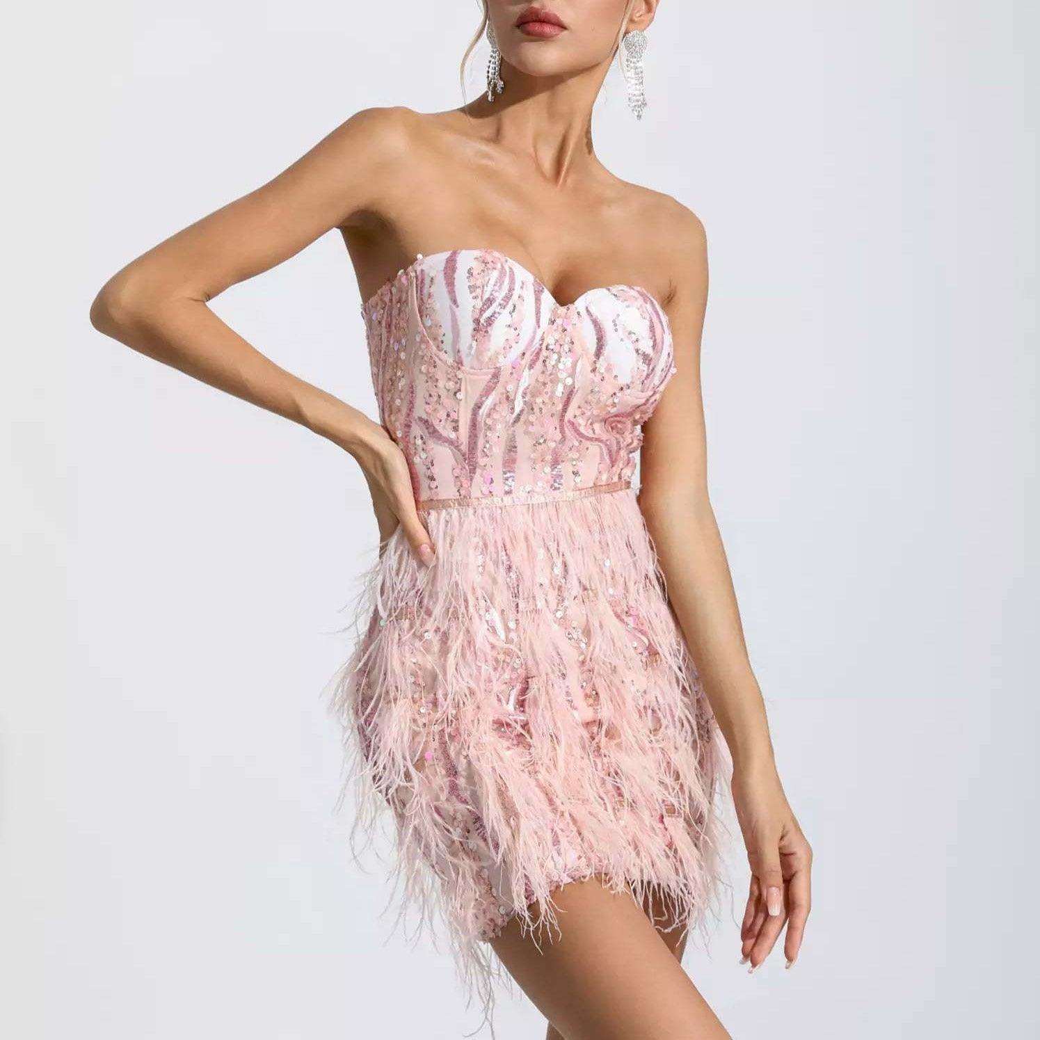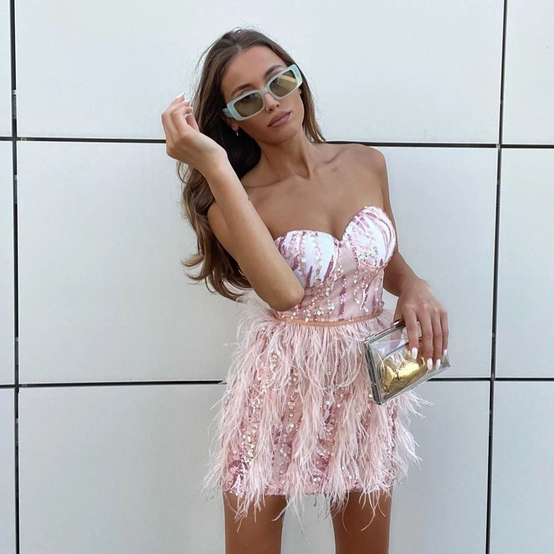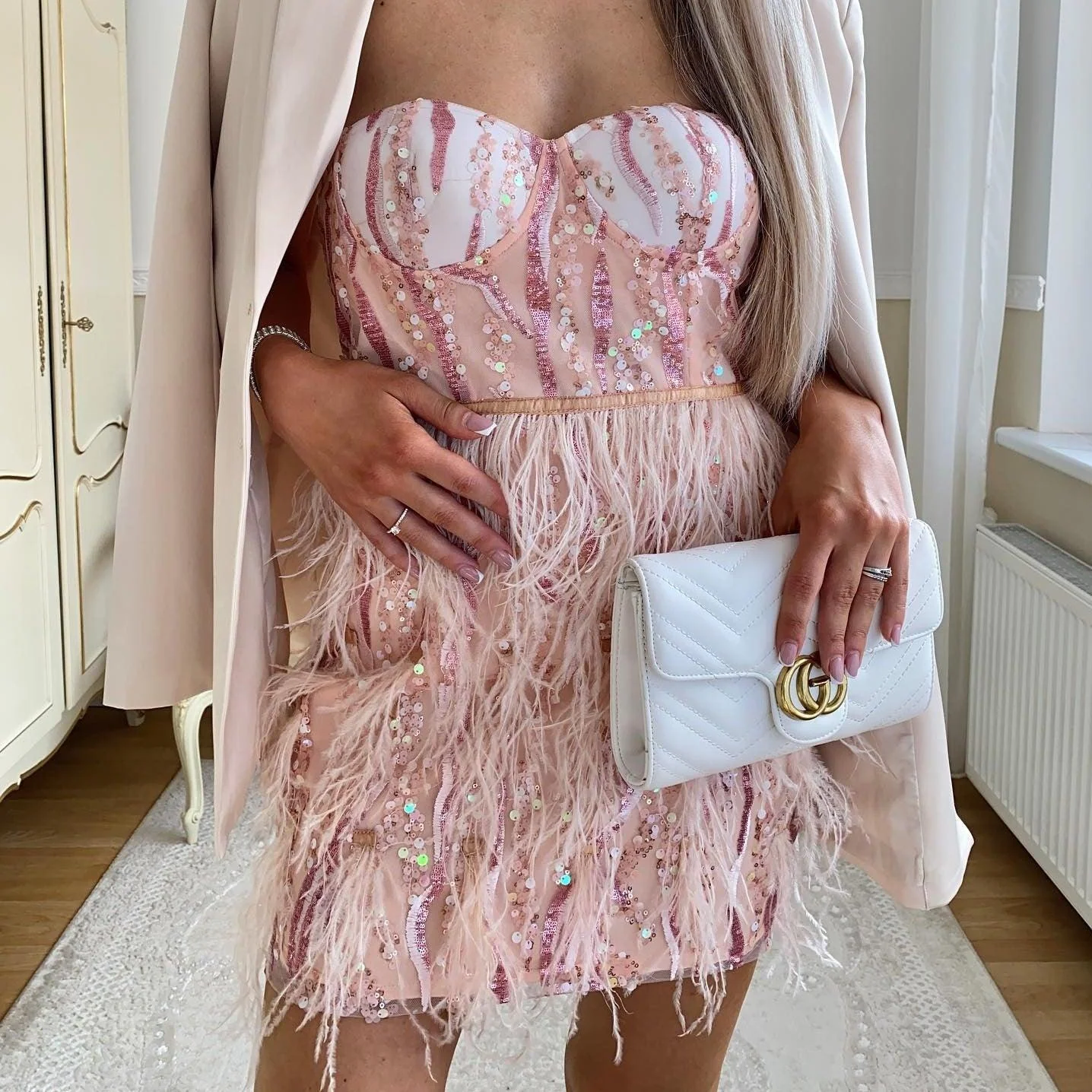 Elevate your look with our Sequin Mini Dress, designed to make a bold statement. This dazzling dress showcases intricate sequin embellishments and playful feather accents for added glamour and elegance. The slim fit ensures a chic and confident appearance at any occasion. Ideal for parties, weddings, or special events, this sequin mini dress effortlessly combines style and sophistication. Get ready to shine at your next gathering with this unforgettable and glamorous attire. Bring a sparkle of elegance to every special moment! Follow us on Instagram @mermaid_way for more style inspirations and trends. FEATURES: – Low Stretch – Gentle hand wash – Invisible zipper at the back. MATERIAL: Crafted from 100% polyester with a 95% polyester and 5% spandex lining. Enjoy a complimentary size exchange if the fit is not perfect.