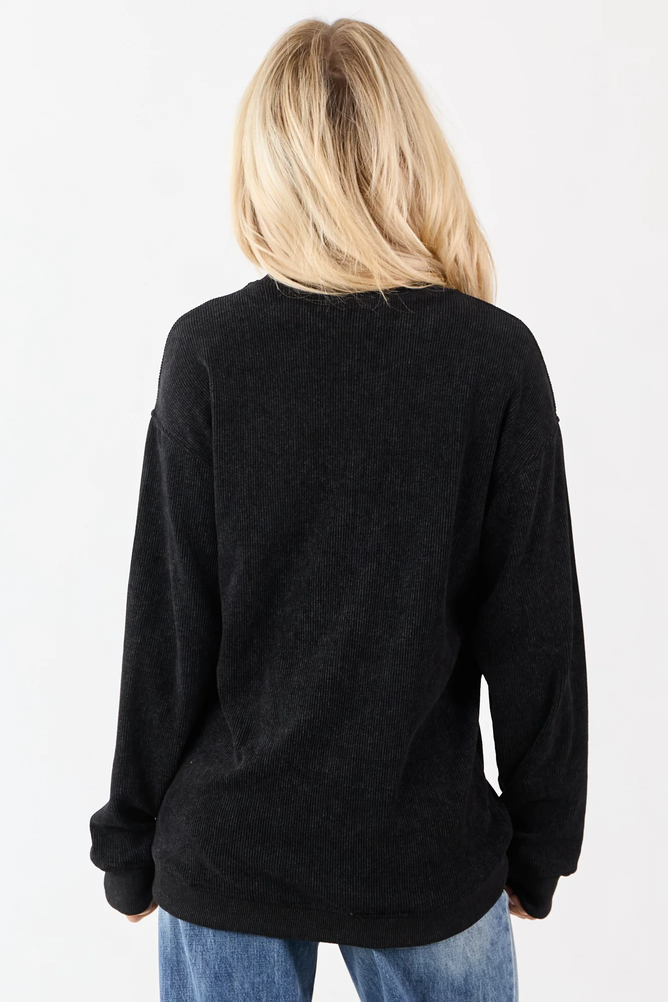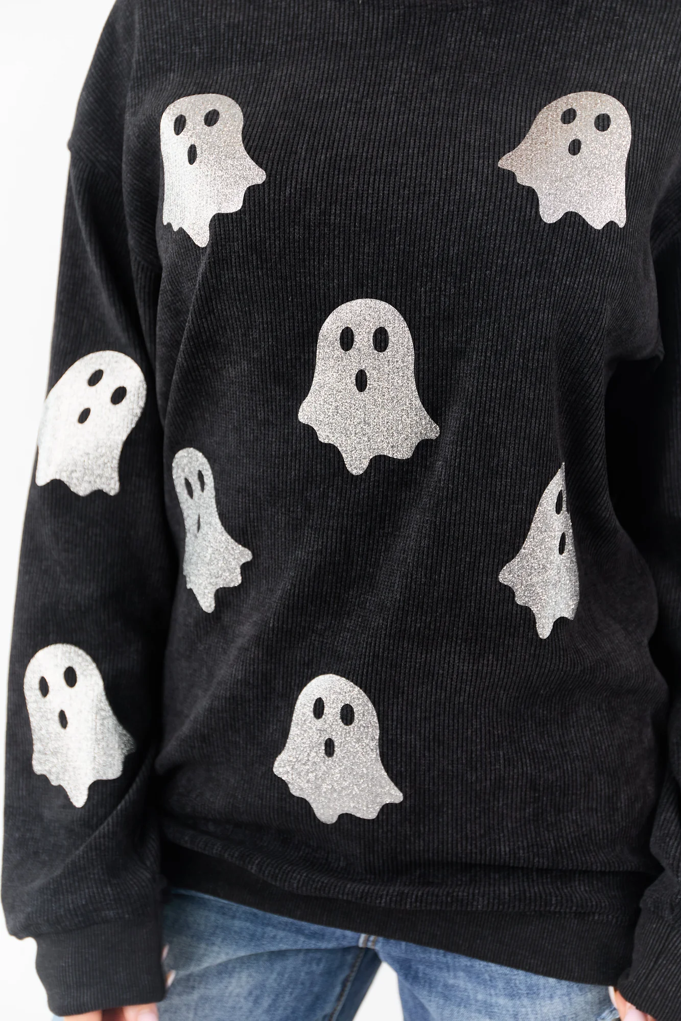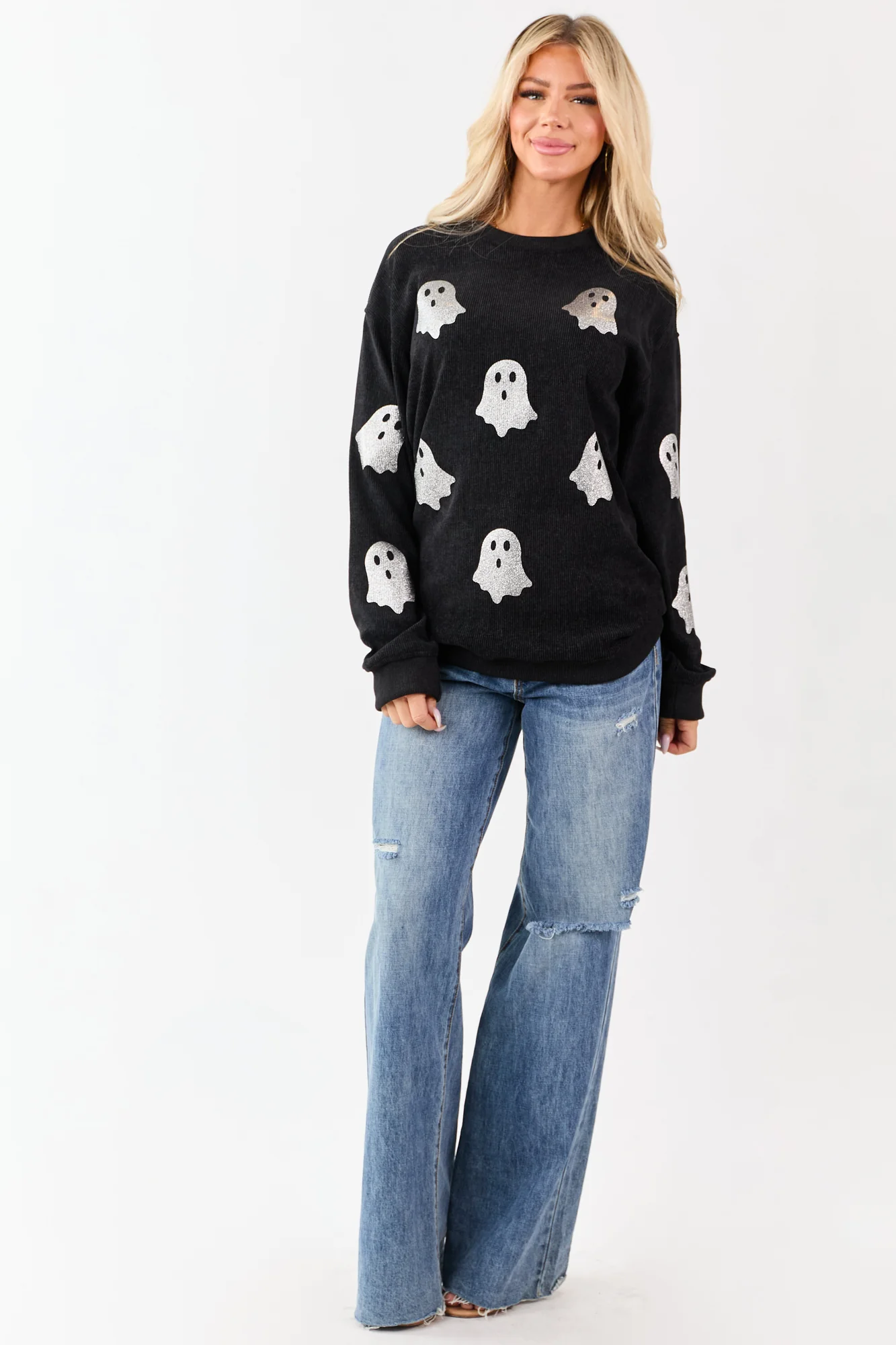 Experience the perfect blend of fun and comfort with this black rib knit sweatshirt featuring a sparkly ghost graphic. Ideal for fall vibes and Halloween style, this relaxed-fit sweatshirt is made of stretchy rib knit fabric with drop shoulder design. Crafted from 100% polyester, this sweatshirt is versatile and stylish. Available in sizes S, M, and L. Bust: 44-46 inches, Length: 29-30 inches, Sleeve Length: 25-29 inches. Imported.