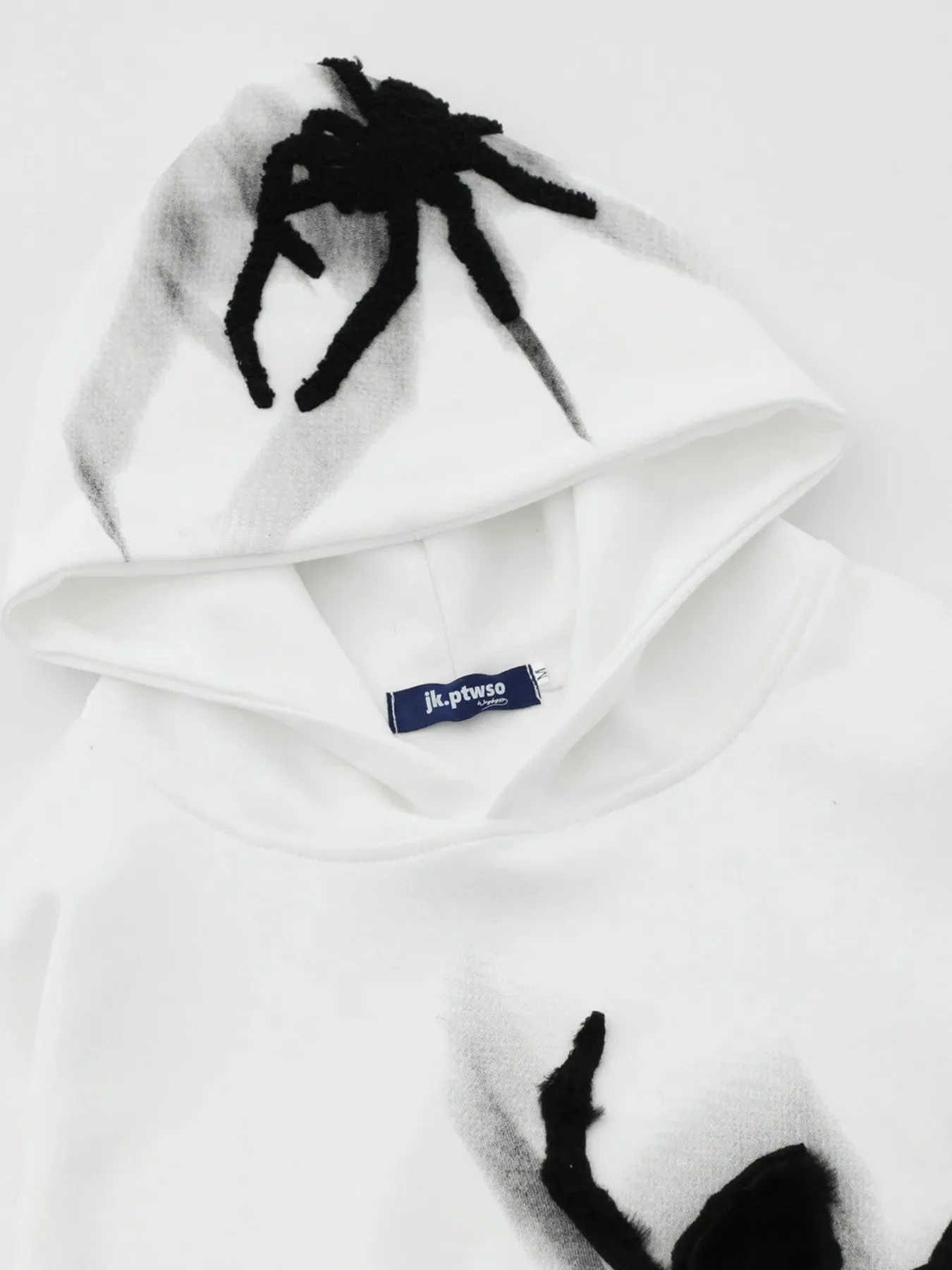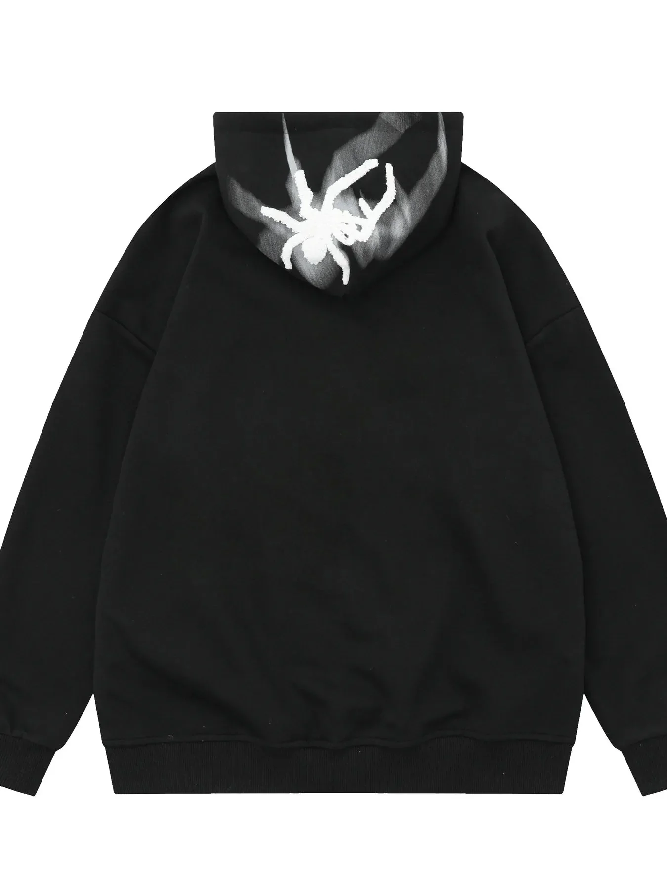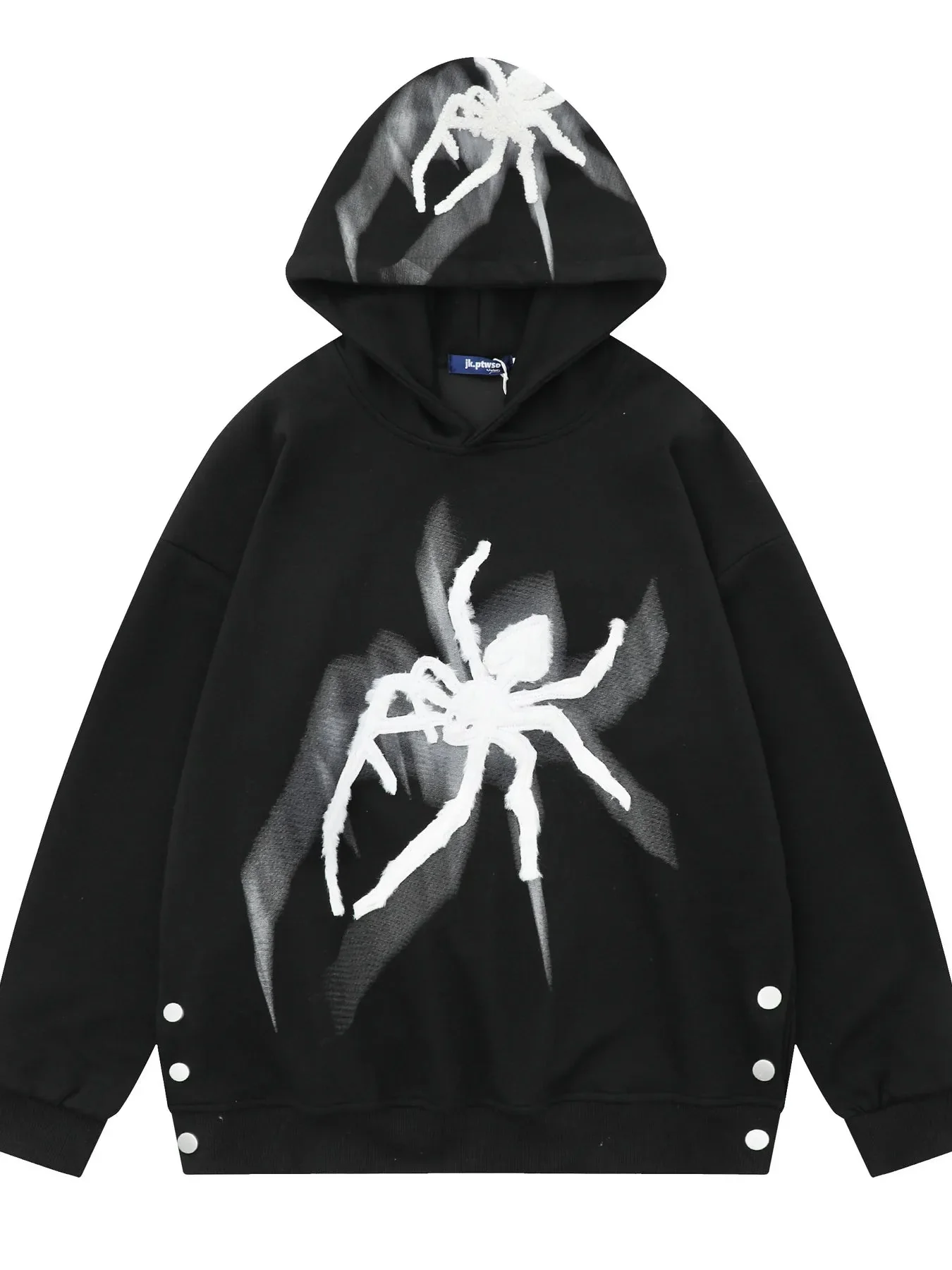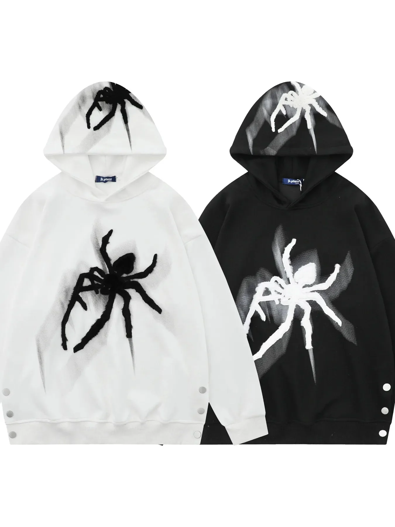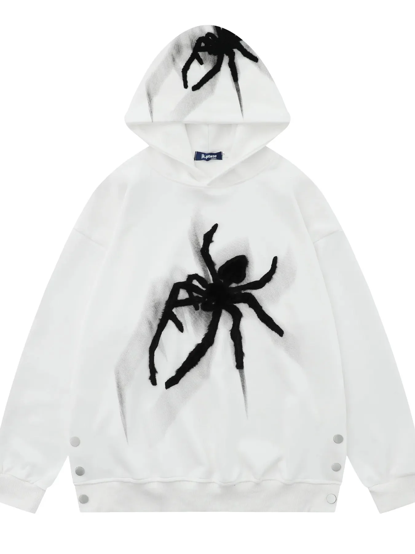Experience ultimate comfort and style with our Spider Graphic Oversized Hoodie featuring side button details. This hoodie offers a basic style with a pocket for convenience. Made from a blend of 65% cotton and 35% polyester, it provides a slight stretch for a perfect fit. Care Instructions: Machine wash cold, tumble dry low. Imported. Available in Black and White colors and sizes S to XXL.
