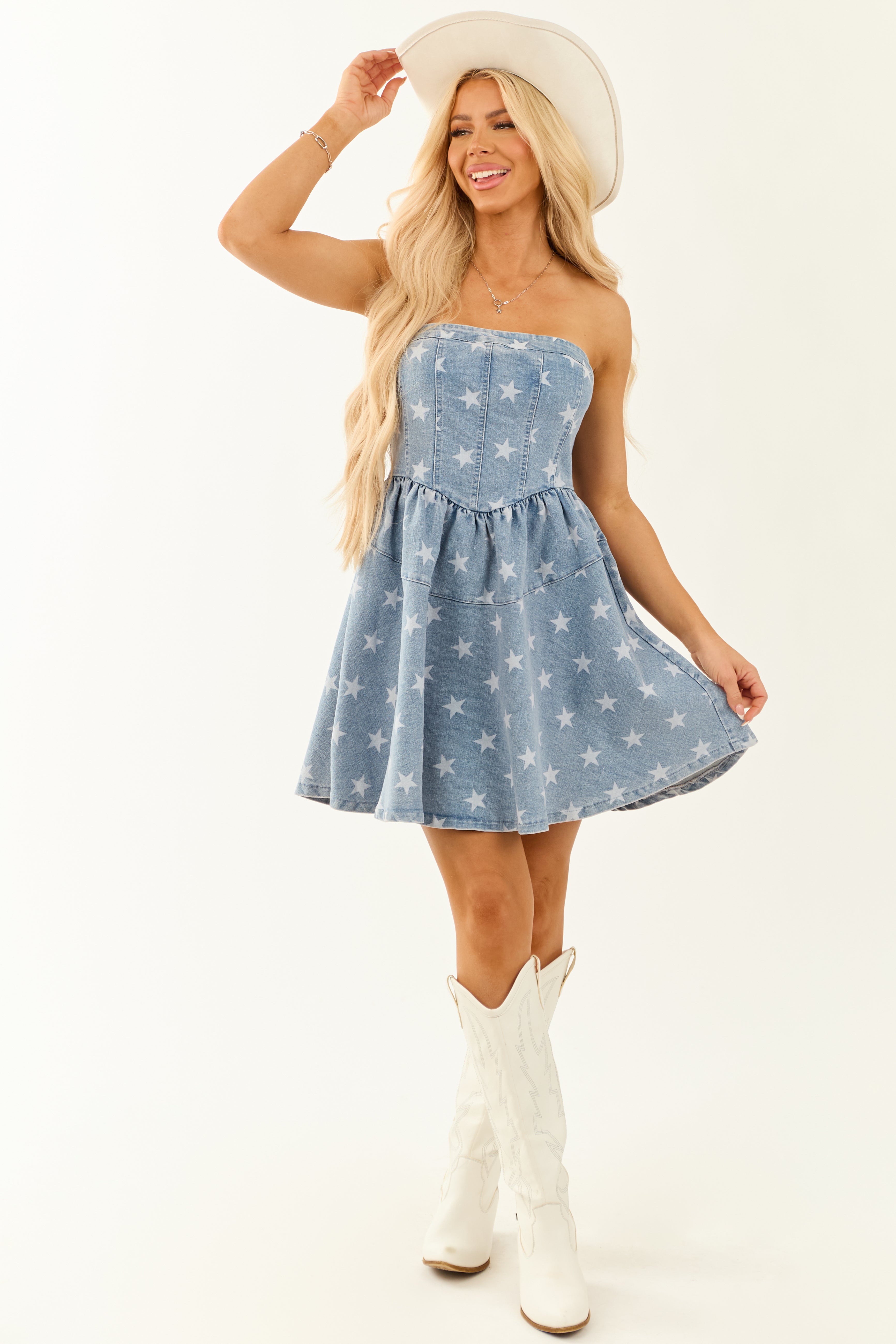 Channel your patriotic spirit with this fun star-patterned denim dress! This dress perfectly fits sizes S, M, L with smocked elastic back for comfort and style. Featuring stars in shades of Faded Ivory, strapless design with silicone lining on bust to prevent slippage. Enjoy the stretchy and tiered design made of 97% Cotton, 3% Spandex for a comfortable and trendy look. This dress is unlined and ideal for spring and summer. Imported , each piece may vary slightly due to the unique fabric print, cutting, and sewing process. Model pictured is 57″ tall, size 1, wearing size Small with Bust 34″, Waist 26″.
