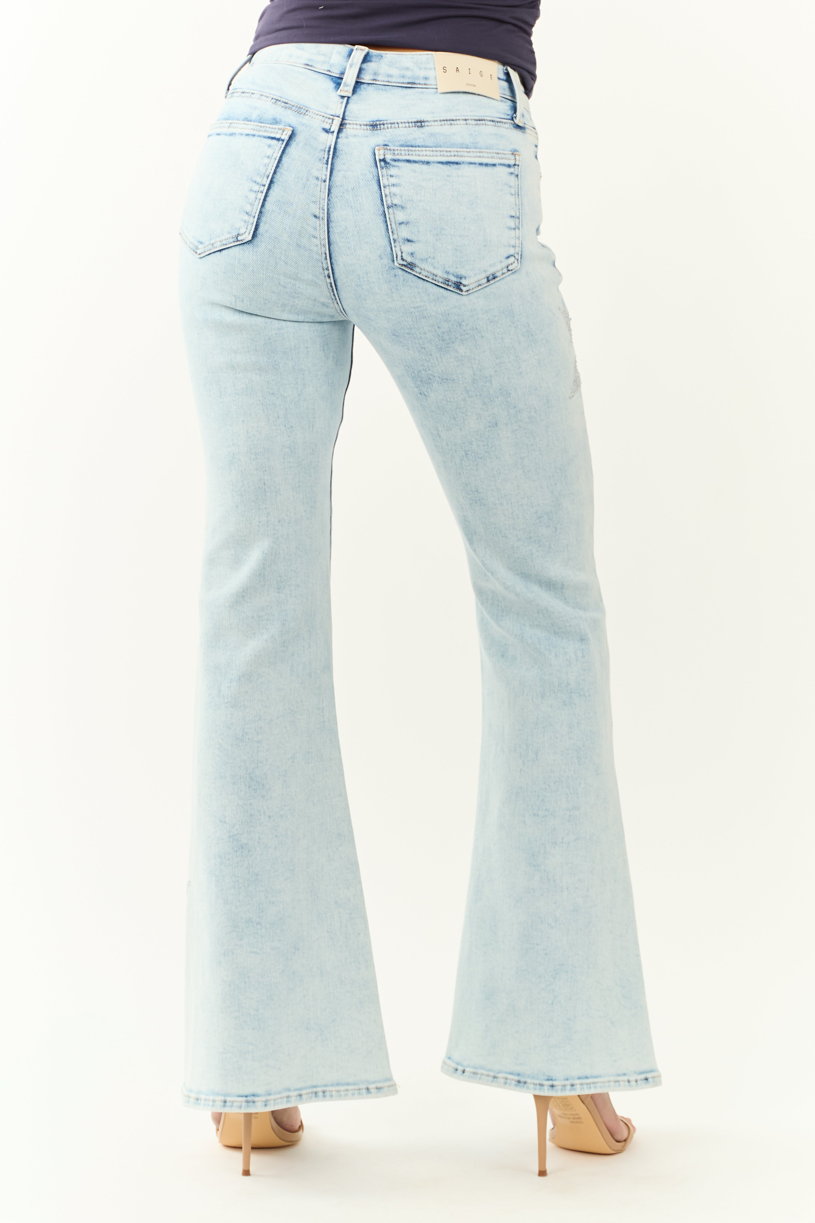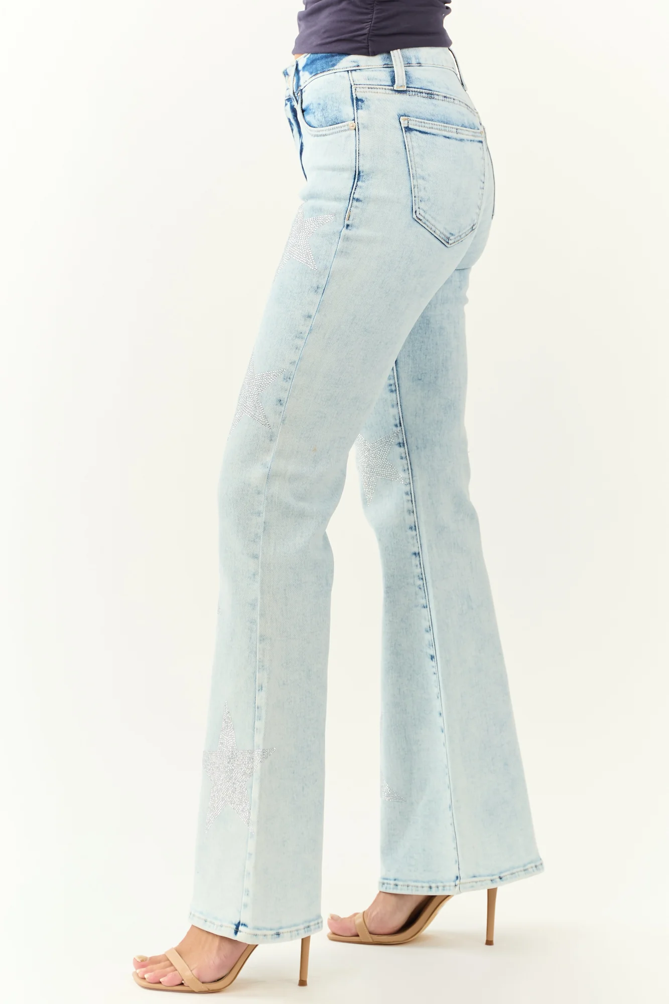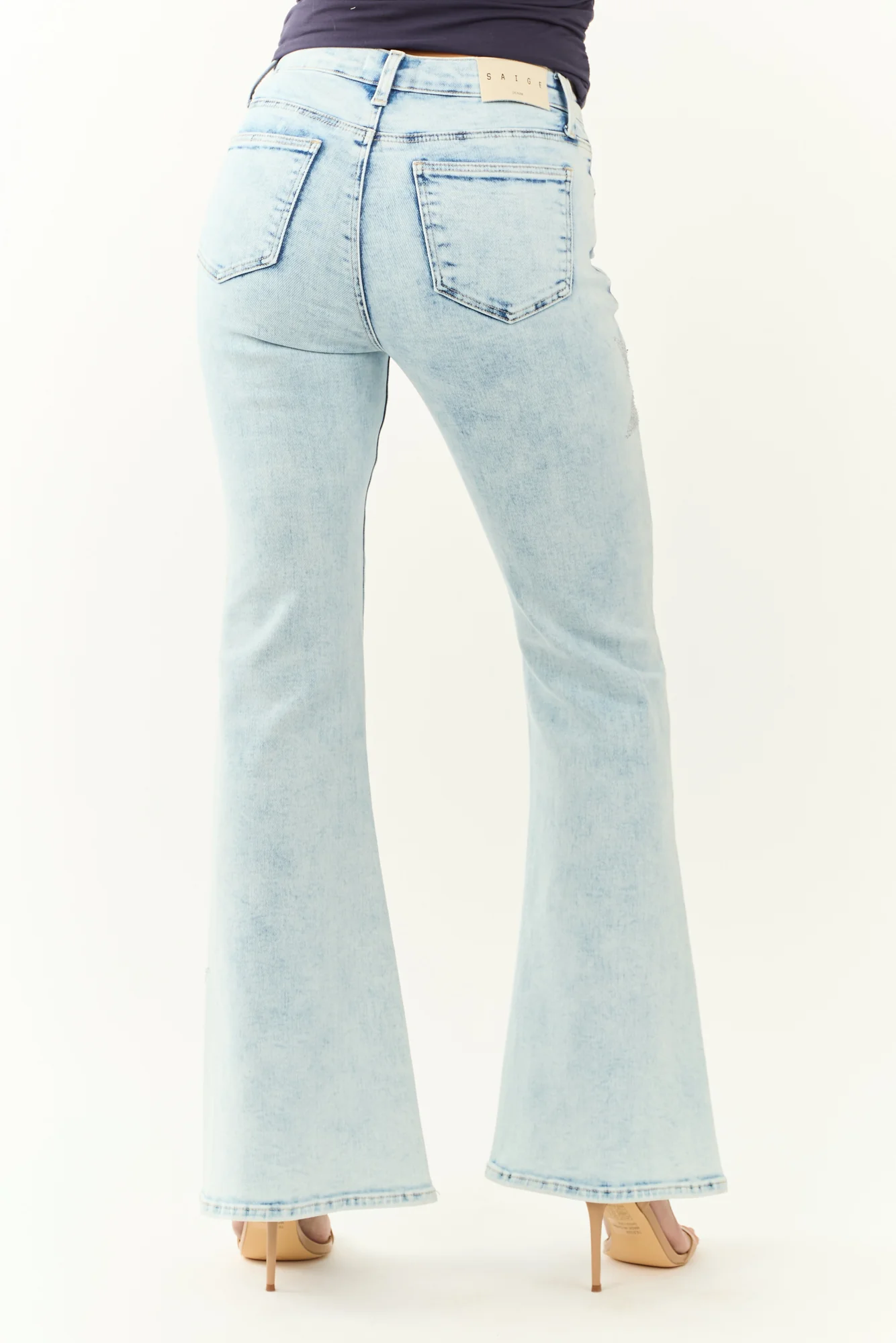 Experience the perfect blend of style and comfort with our Star Pattern Light Wash Flare Jeans designed to flatter your silhouette. These power flares feature a semi-stretchy denim construction with a patriotic star embellishment in Silver. Embrace the mid-rise fit, 5-pocket styling, and zipper fly with button closure. Made of 93.7% Cotton, 5.4% Polyester, and 0.9% Spandex for a luxurious feel and lasting quality. Elevate your denim game with our versatile and trendy Saige Light Tummy Control Jeans!