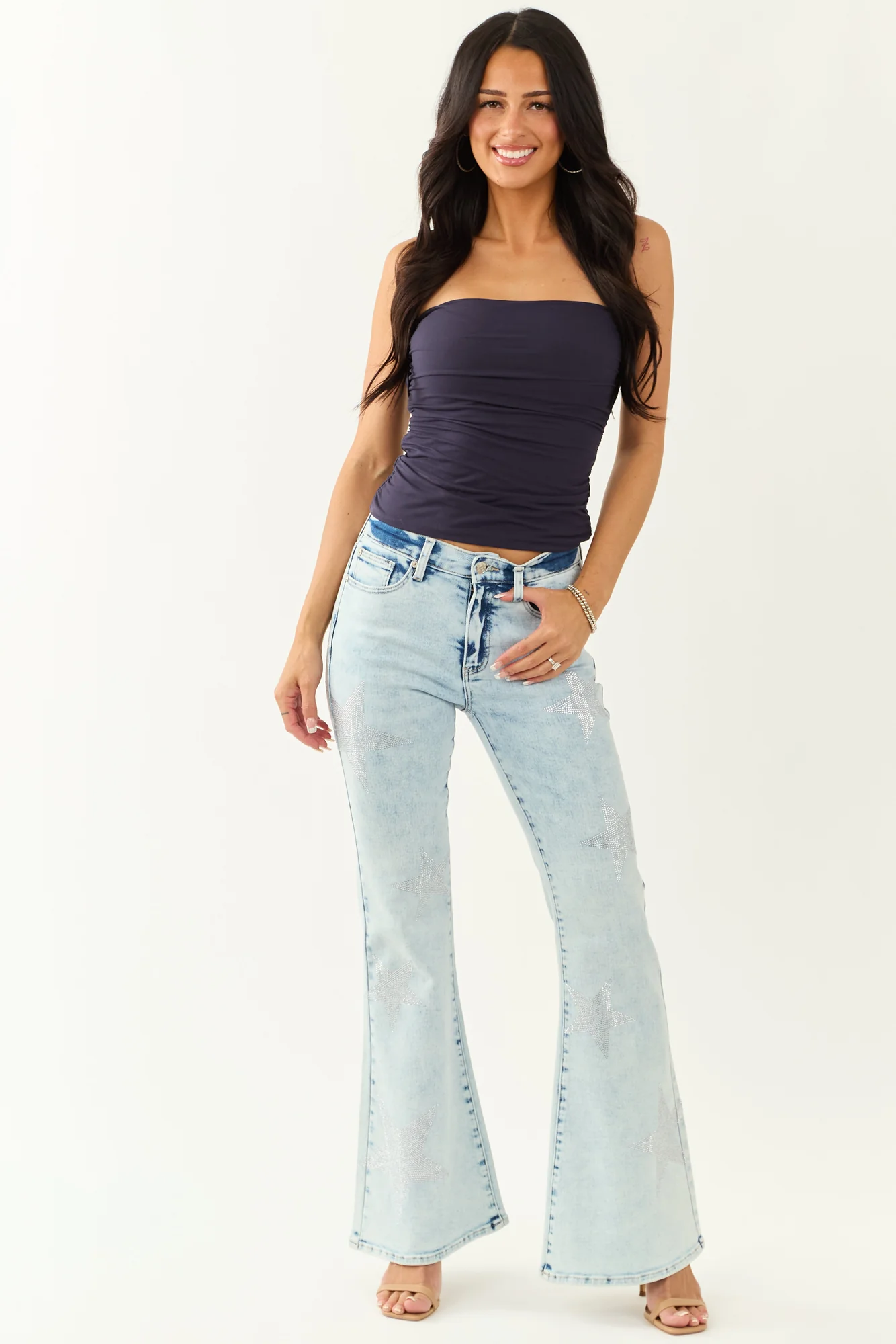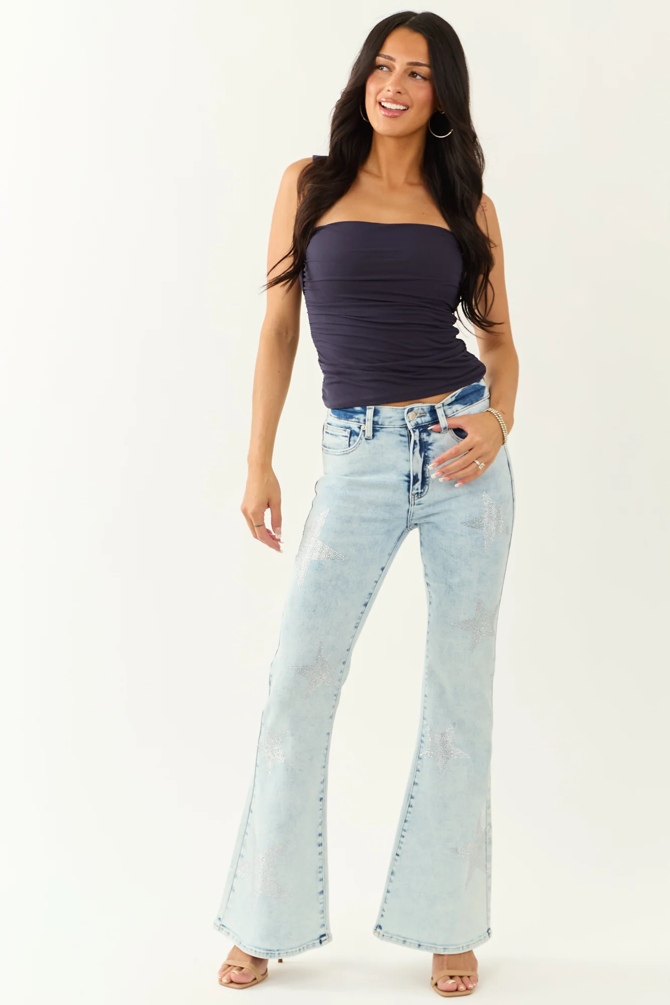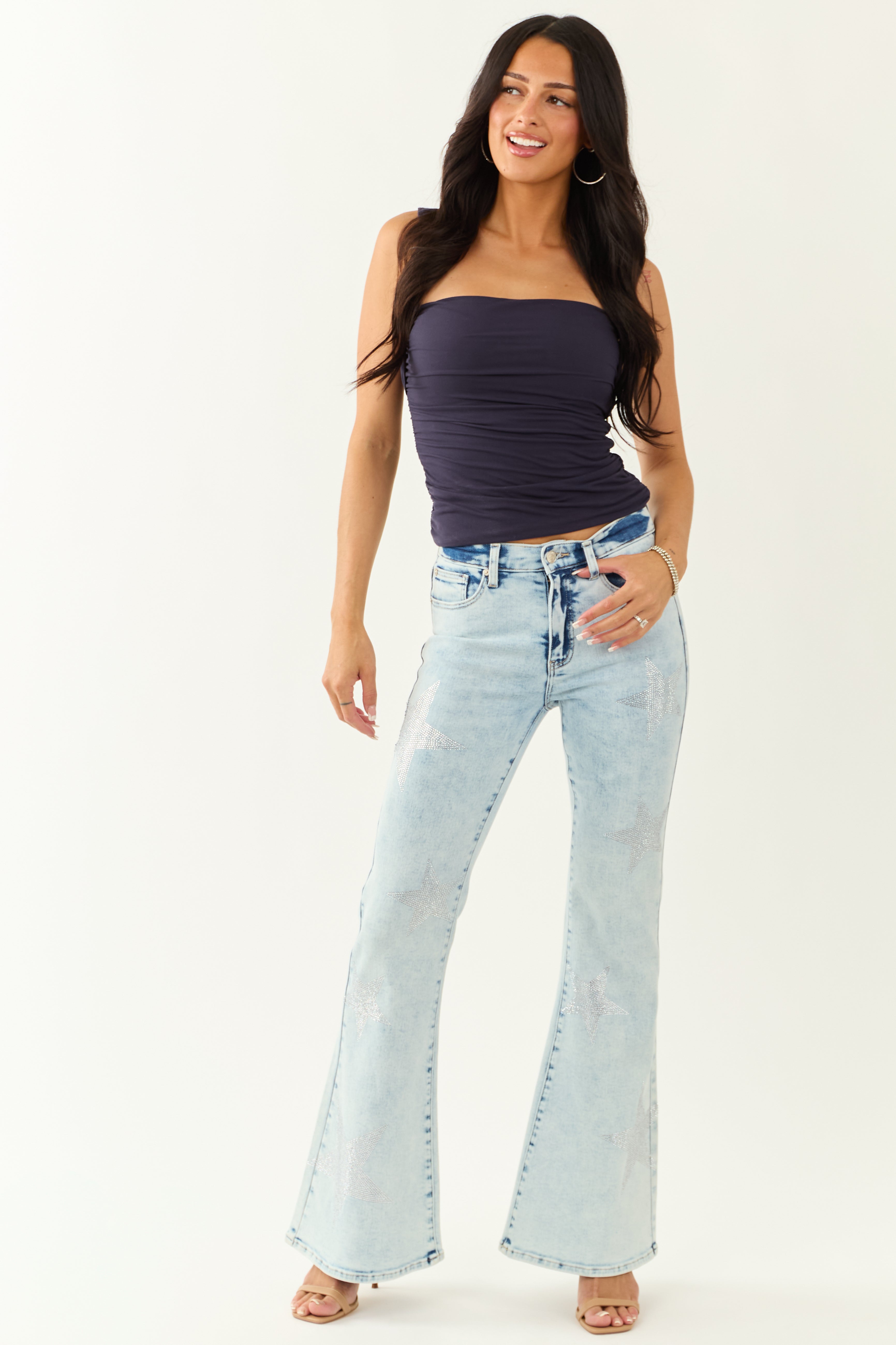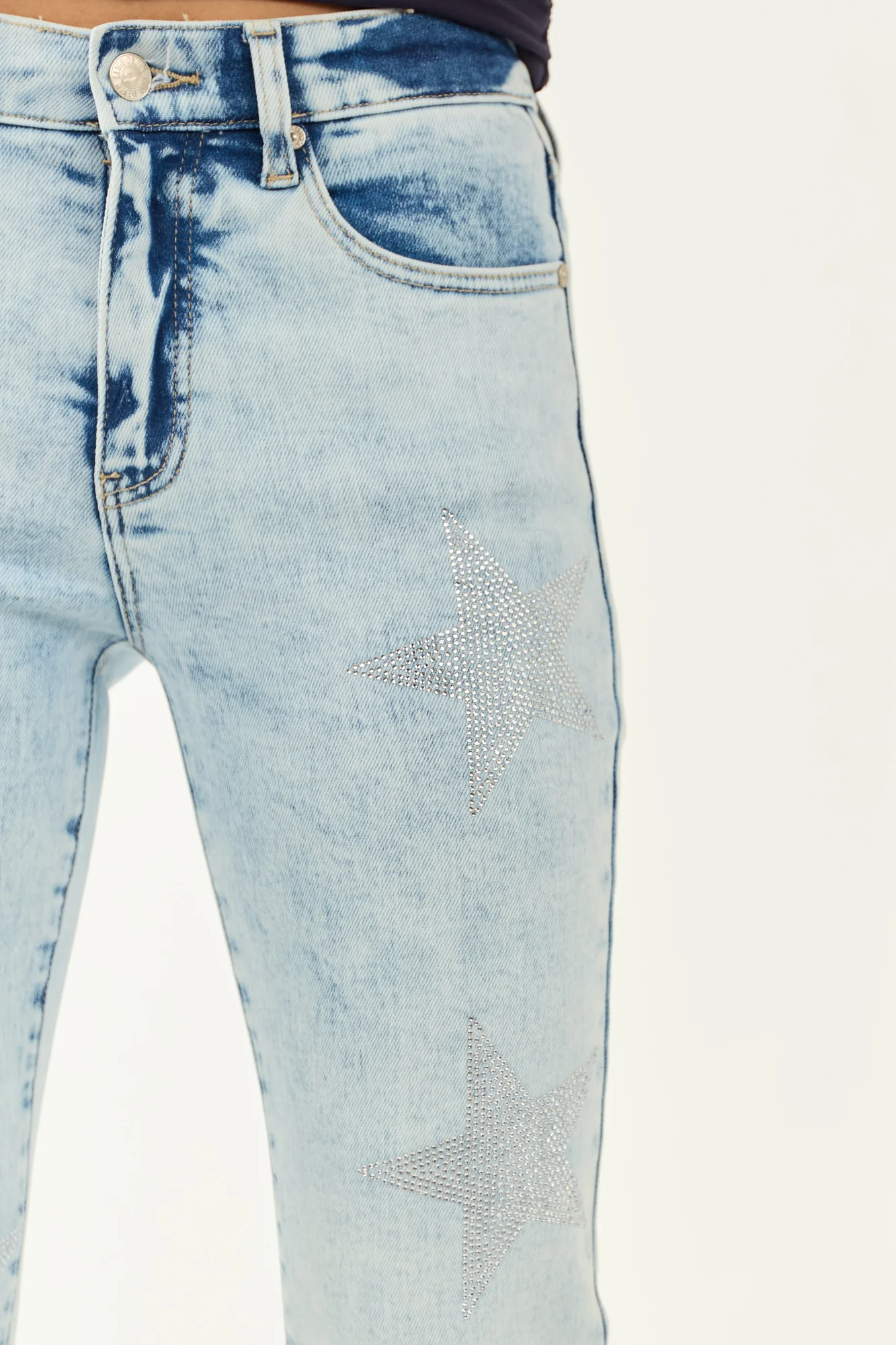 Experience the perfect blend of style and comfort with our Star Pattern Light Wash Flare Jeans designed to flatter your silhouette. These power flares feature a semi-stretchy denim construction with a patriotic star embellishment in Silver. Embrace the mid-rise fit, 5-pocket styling, and zipper fly with button closure. Made of 93.7% Cotton, 5.4% Polyester, and 0.9% Spandex for a luxurious feel and lasting quality. Elevate your denim game with our versatile and trendy Saige Light Tummy Control Jeans!