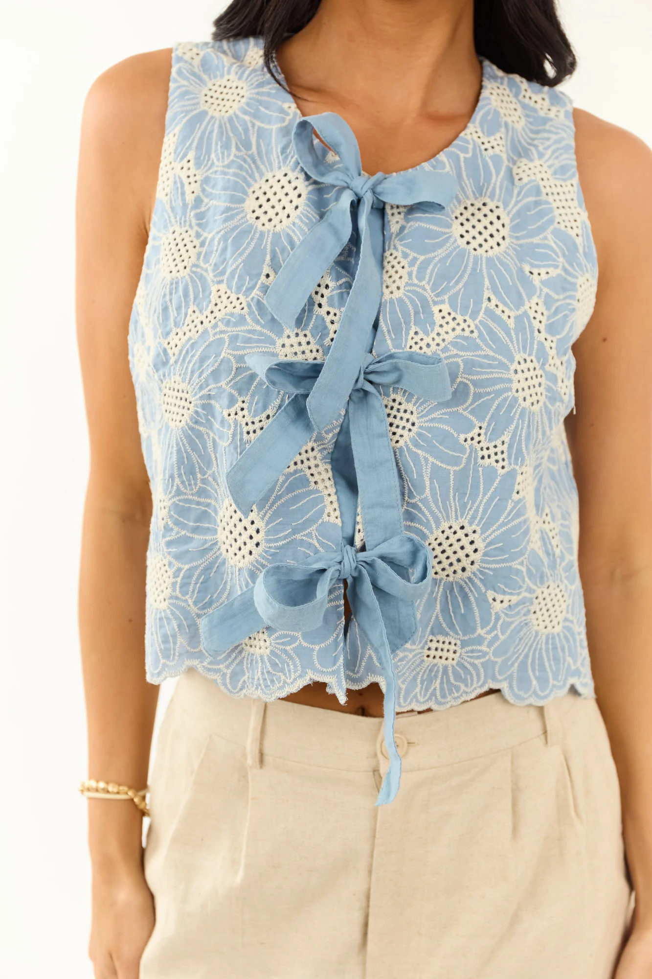 Make a style statement with this boho vest featuring artisanal floral embroidering in Cream shades. Crafted from non-stretchy cotton, it offers a scalloped hem, three front ties, and is lined for comfort. Imported and made of 100% Cotton, this vest is perfect for Spring and Summer. Available in sizes Small, Medium, and Large. Model is wearing a size Small. Model’s measurements: Height 59″, Bust 34″, Waist 26″