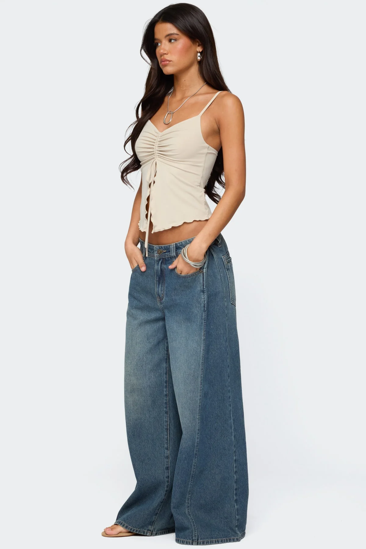 Discover the modern elegance of our Stone Drawstring Top featuring adjustable straps, split front design, and stylish drawstring detail. Crafted from a blend of Polyester and Spandex for a comfortable fit. This top showcases a lettuce hem for added flair. Perfect for any occasion, this top is a versatile addition to your wardrobe. Machine washable for easy care. Available in sizes XS, S, M, L, and XL.