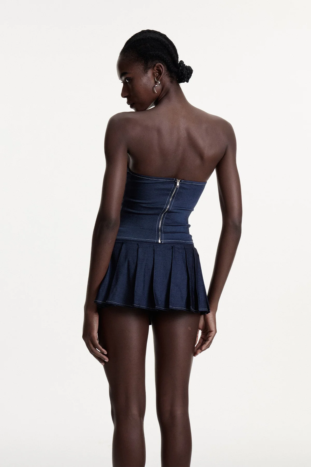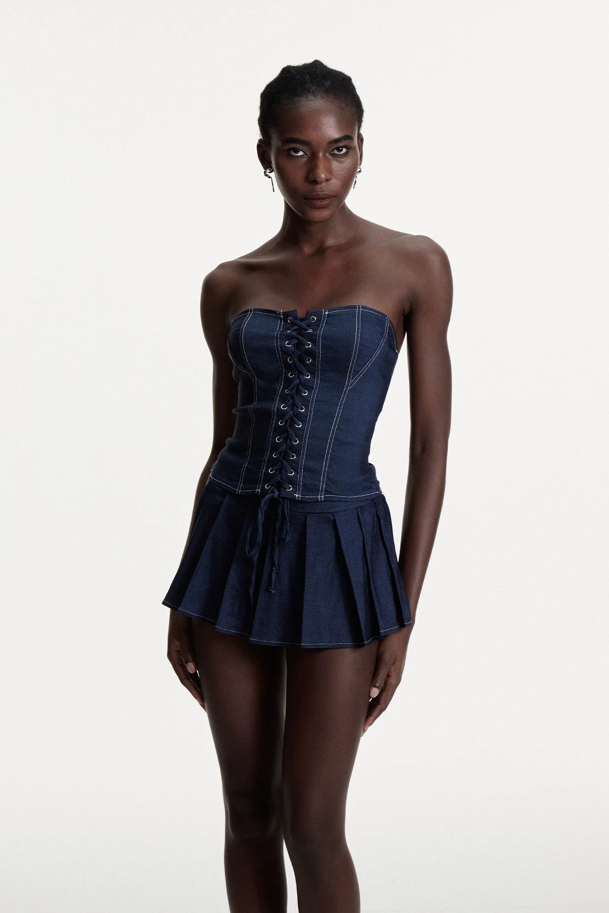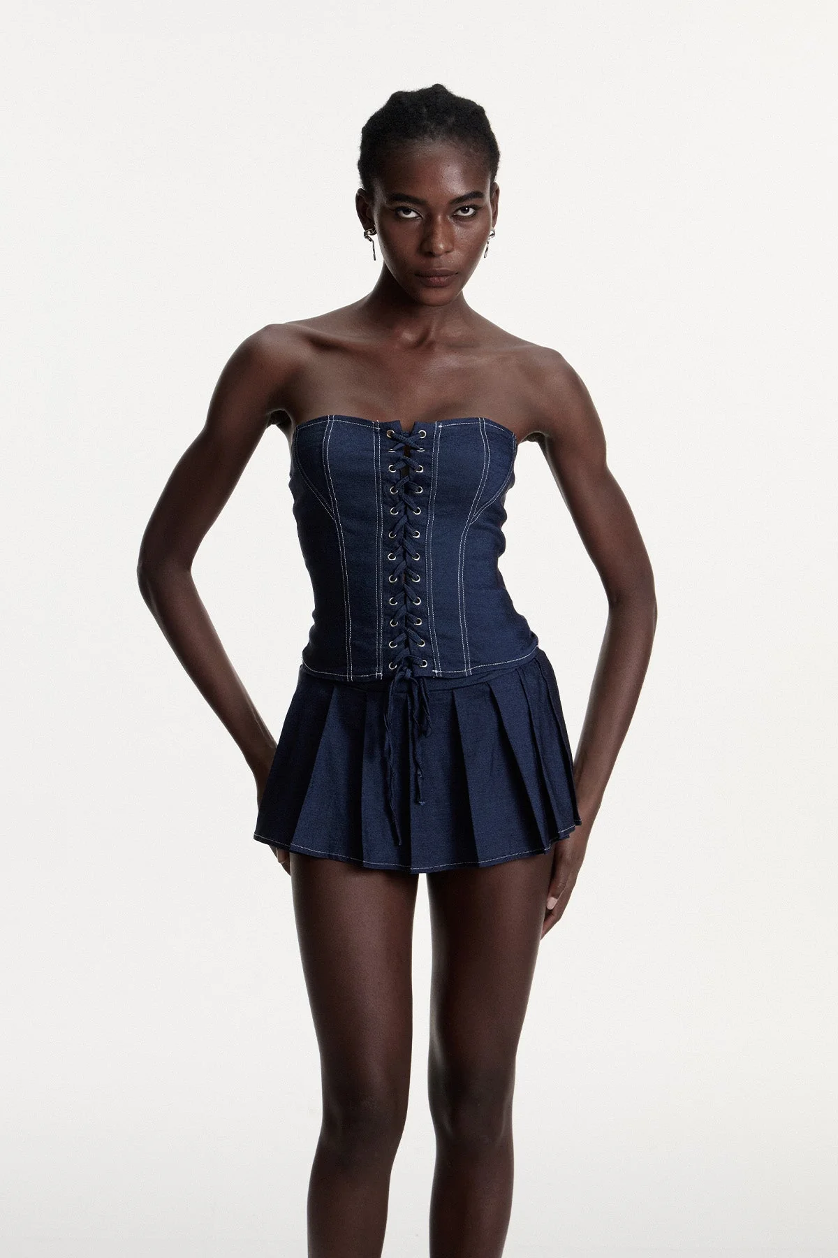 Embrace contemporary style with the strapless denim skirt set in urban blue. Expertly crafted from high-quality denim, this set features a lace-up detail for adjustable support and visual interest. Ideal for versatile styling, it combines edgy appeal with sophisticated structure, making it a must-have for fashion-forward wardrobes. This skirt set does not stretch and can be gently machine washed. Please note that color may vary slightly due to lighting. Elevate your look with this chic ensemble!