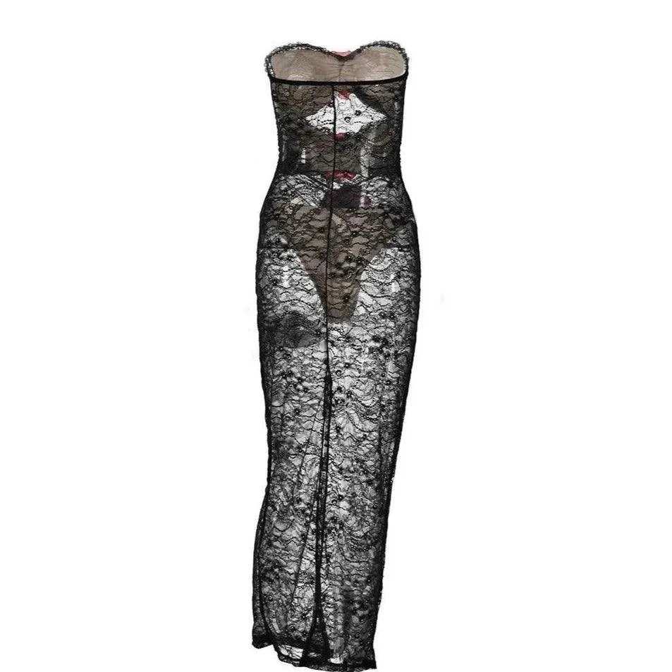 Indulge in everlasting charm with our Strapless Lace Maxi Dress featuring intricate floral lace inserts, a chic cut-out detail, and a body-contouring fit. This ankle-length dress is perfect for special occasions, enhancing your figure with comfort and style. Crafted from premium stretchy fabric, it exudes glamour effortlessly. Whether its a gala or a dinner, this black dress elevates your look with sophistication. Transition seamlessly from day to night in this versatile piece that complements any wardrobe. Complete your ensemble with elegant heels for a touch of allure. Join us on Instagram @mermaid_way for fashion inspiration and updates. FEATURES: Concealed back zipper for easy wear, available in sizes S, M, L.