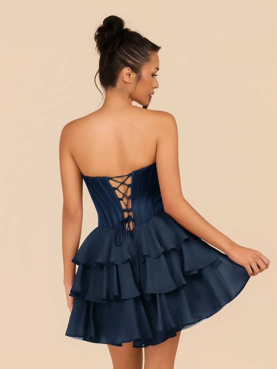 Elevate your look with this stunning A-line homecoming dress in navy blue. The strapless neckline, cascading ruffles, and shimmering beaded accents create a charming and elegant ensemble. Made from royal blue satin that catches the light beautifully, this dress is perfect for homecoming, cocktail events, or nights out. The lace-up back adds a romantic touch and ensures a customizable fit. Feel confident, comfortable, and effortlessly chic in Elarae. Pair with heels for a show-stopping outfit!