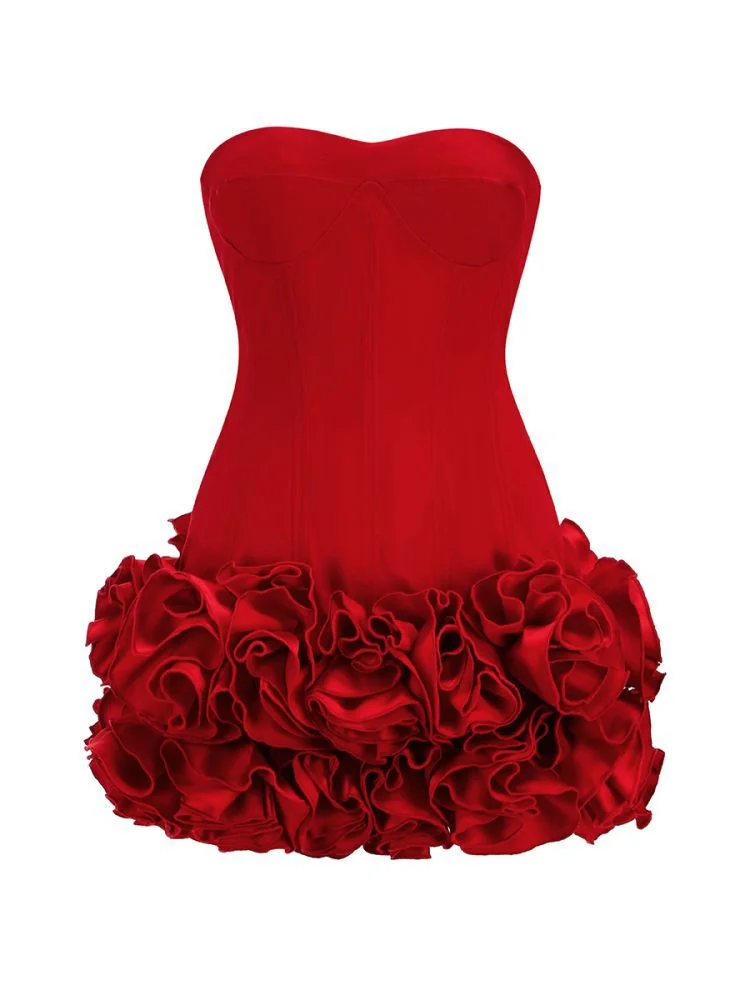 Elevate your style with this stunning red floral embellished mini dress. The vibrant red hue and intricate floral details add elegance. The strapless design accentuates your shoulders and neckline, while the tailored fit highlights your silhouette. Ideal for a night out or special event, this dress exudes sophistication with a touch of playfulness. Step out with confidence and leave a memorable impression in this eye-catching ensemble. Made of 89% polyester and 11% spandex. Dry clean only. Please note, color may vary due to lighting. Refer to our size chart for the perfect fit.