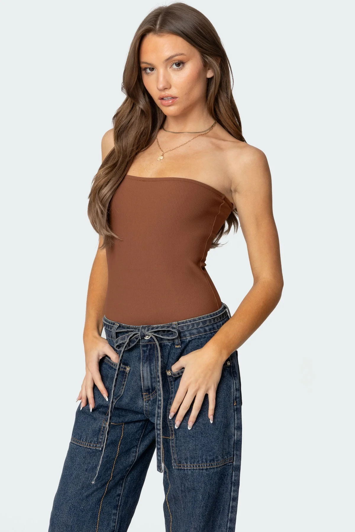 Enjoy the luxurious comfort of the Strapless Ribbed Bodysuit in Brown from the Loren Collection. This bodysuit features a flattering strapless fit and is crafted from high-quality polyester and spandex blend for a soft feel and the perfect stretch. The ribbed fabric adds texture and style to your look. Easy to care for and versatile for various occasions. Available in sizes XS, S, M, L, or XL.