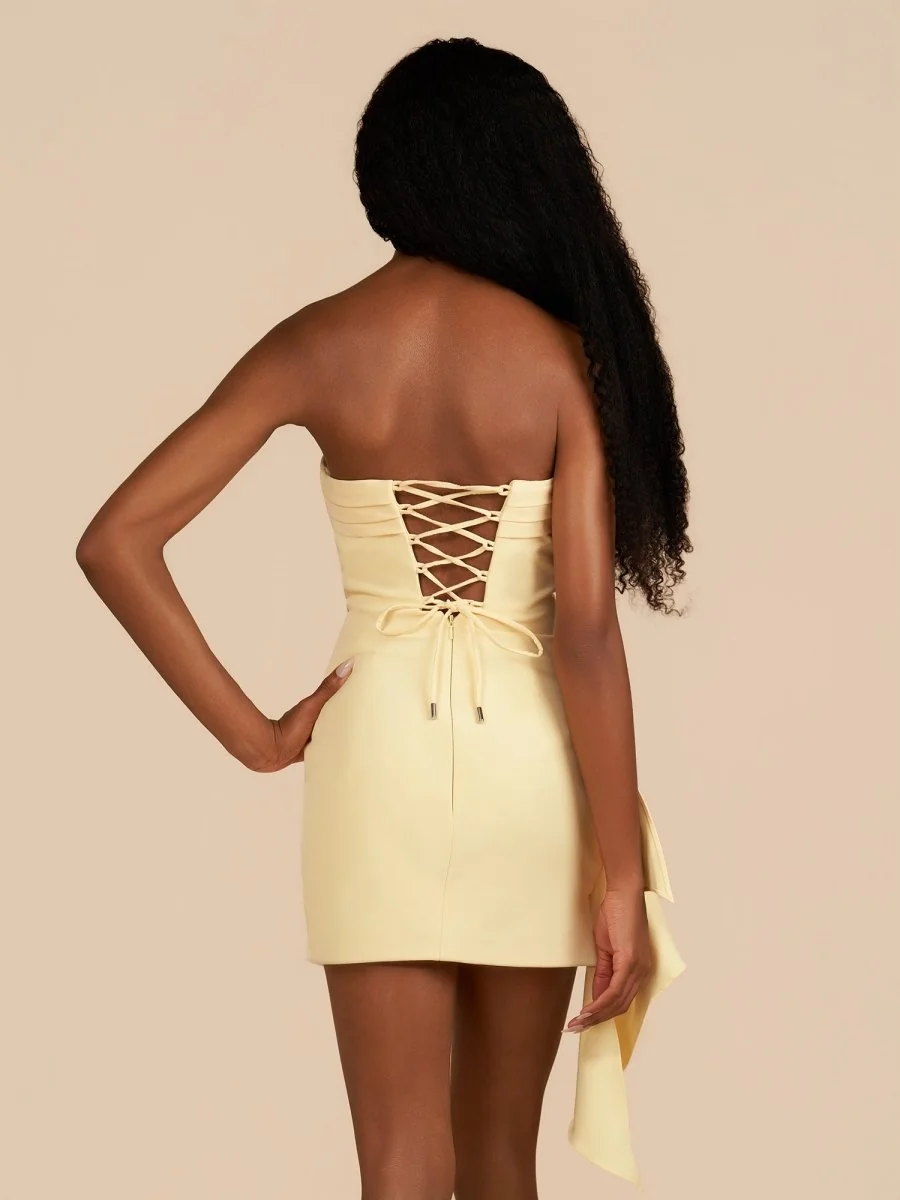 Stand out in the crowd with our stunning strapless bodycon homecoming dress in vibrant yellow. Made from stretchy spandex for a curve-hugging fit, this dress features a daring slit for added allure. The lace-up back detail ensures a secure yet alluring fit. This stylish yet comfortable dress is perfect for homecoming, parties, and night outs with friends. Available in sky blue, pink, red, yellow, and white. Elevate your style with the Eldona dress!