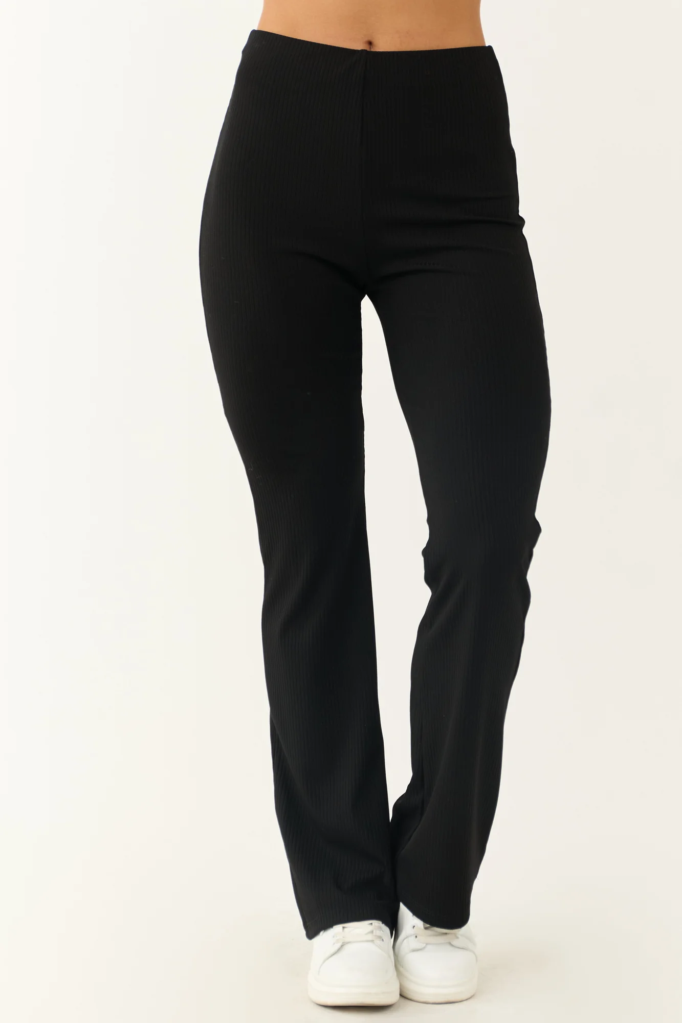 Discover comfort and style with our Stretchy Black Ribbed Knit Flare Pants. Featuring a Fit and Flare design, high waist, and elastic waistband for a perfect fit. Crafted from a stretchy ribbed knit fabric (93% Polyester, 7% Spandex) for all-day comfort. These pants are versatile for any occasion, whether daytime or evening wear. Hand wash cold, dry flat. Available in sizes S, M, and L.