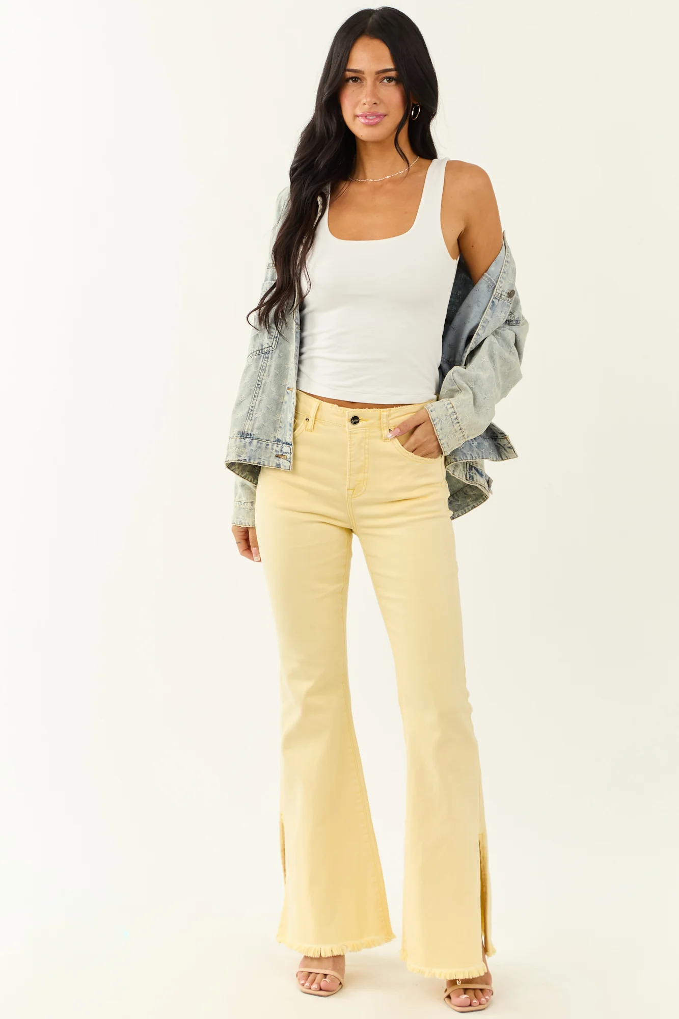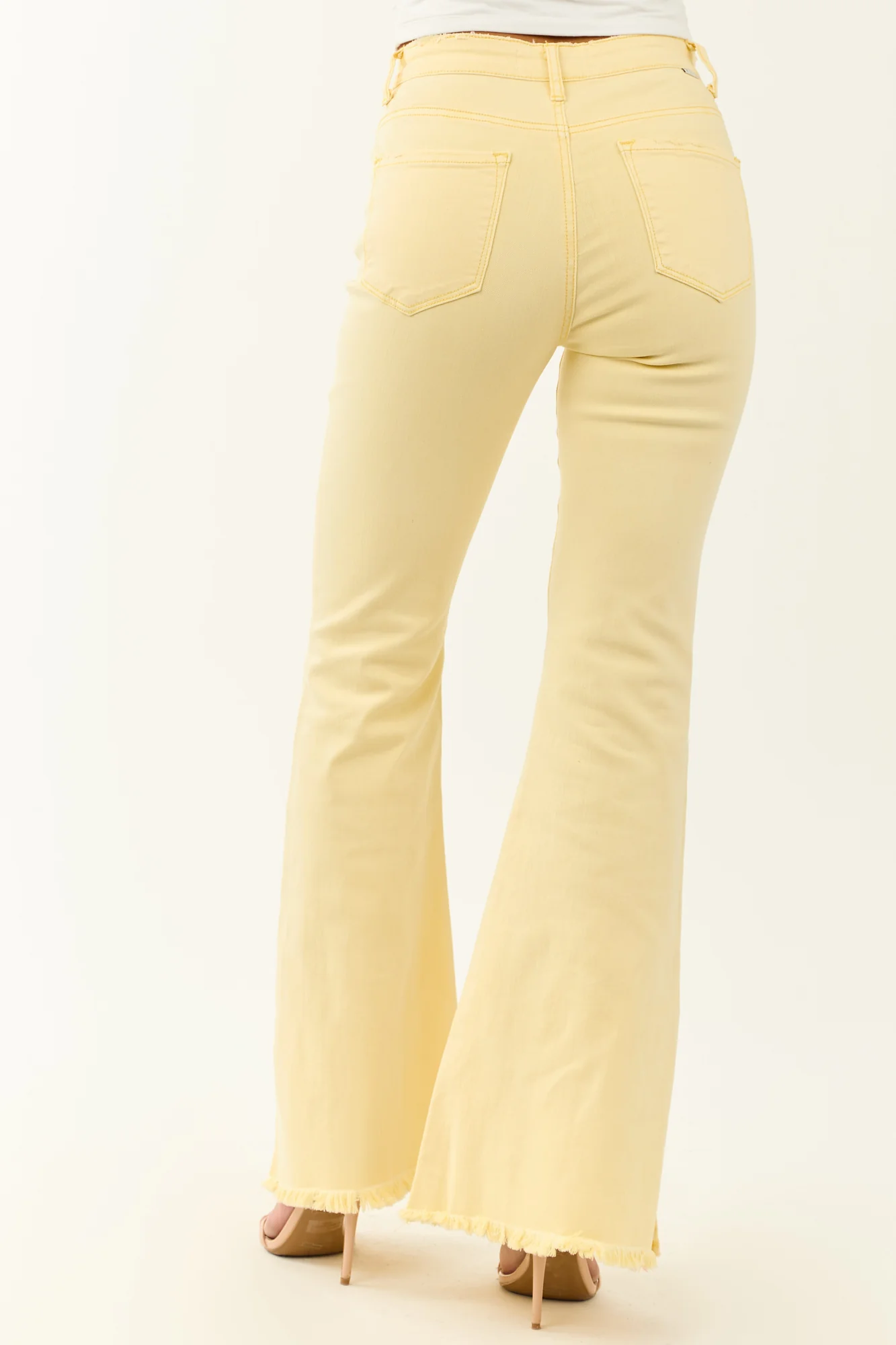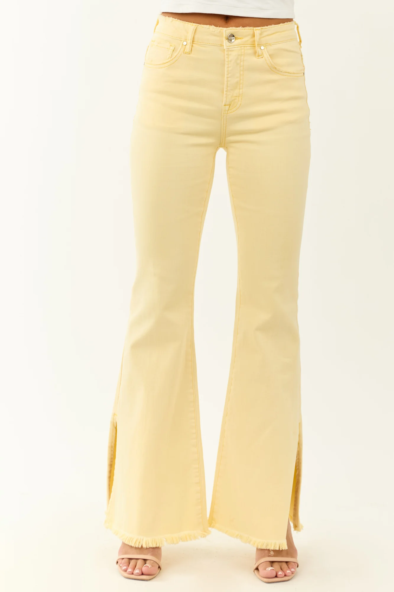 Experience the buttery softness of our Stretchy Buttercream Side Slit Flare Jeans, designed for tall women with a dramatic flair. These jeans are very fitted at the hips, ensuring a true size fit. The high-rise design and frayed hem add trendy appeal, while the five functional pockets provide practicality. Made with stretchy denim (98% Cotton, 2% Spandex), these jeans feature a zipper fly with a button closure, measuring 11″ at the front rise and 13″ at the back rise. Enjoy the inseam of 32″, suitable for tall individuals. Elevate your style with these imported jeans modelled by 59″ tall size 1 woman with a 34″ bust and 26″ waist.