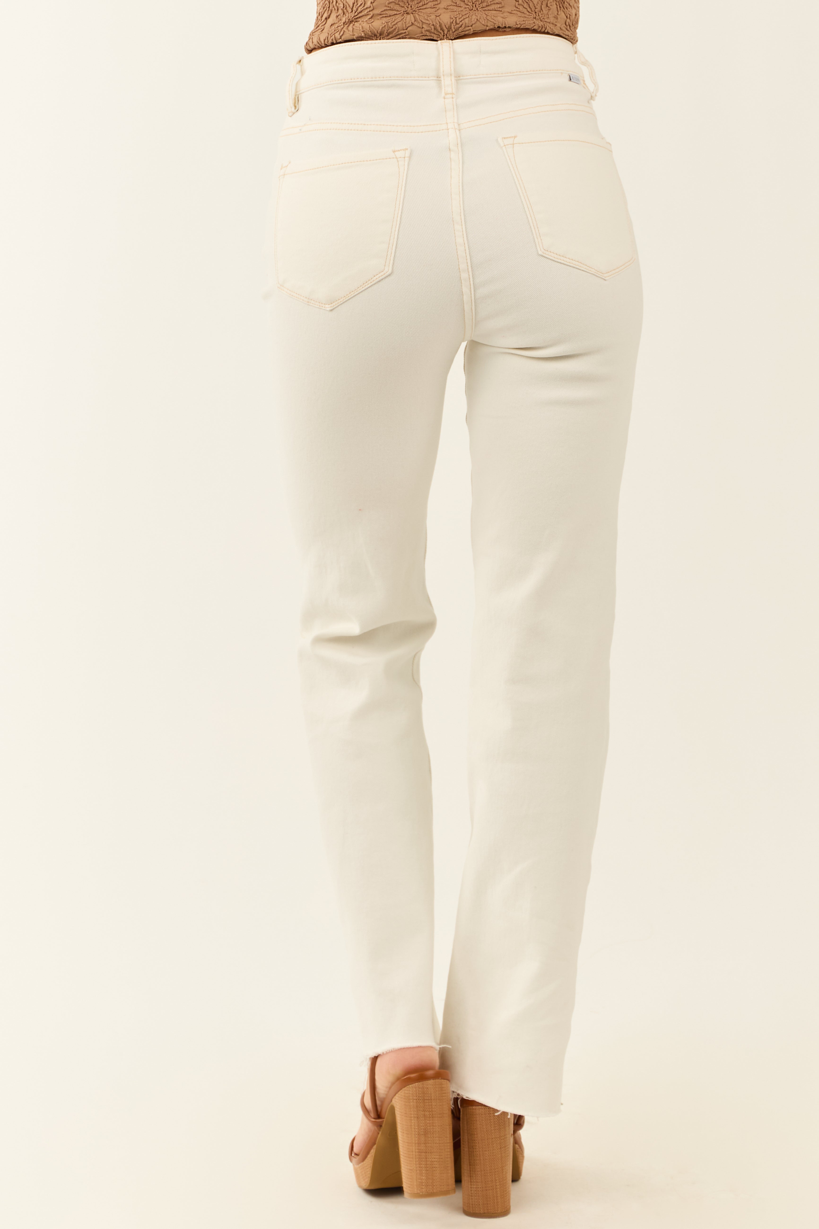 Stay on trend with these off white high-rise skinny jeans featuring a stretchy denim fabric for ultimate comfort. The raw hem adds a stylish touch, while the 5-pocket design offers functionality. Zipper fly with button closure and belt loops included. Available in waist sizes from 26″ to 34″ with a 29″ inseam. Imported, made of 98% Cotton and 2% Spandex. Model is wearing size 1. Perfect for everyday wear, these jeans are a wardrobe must-have.