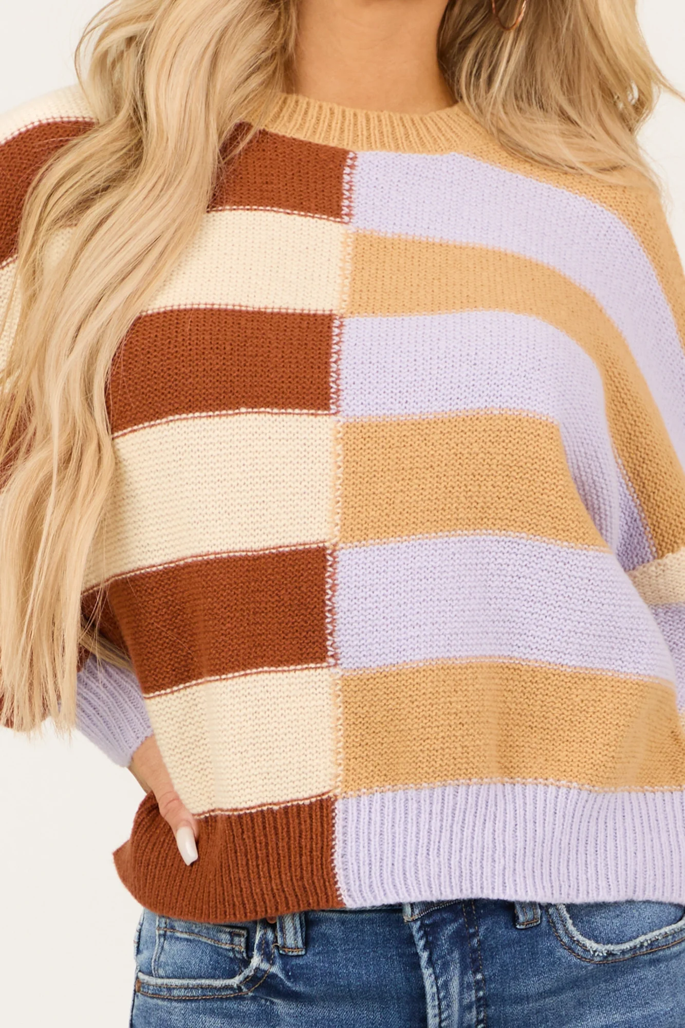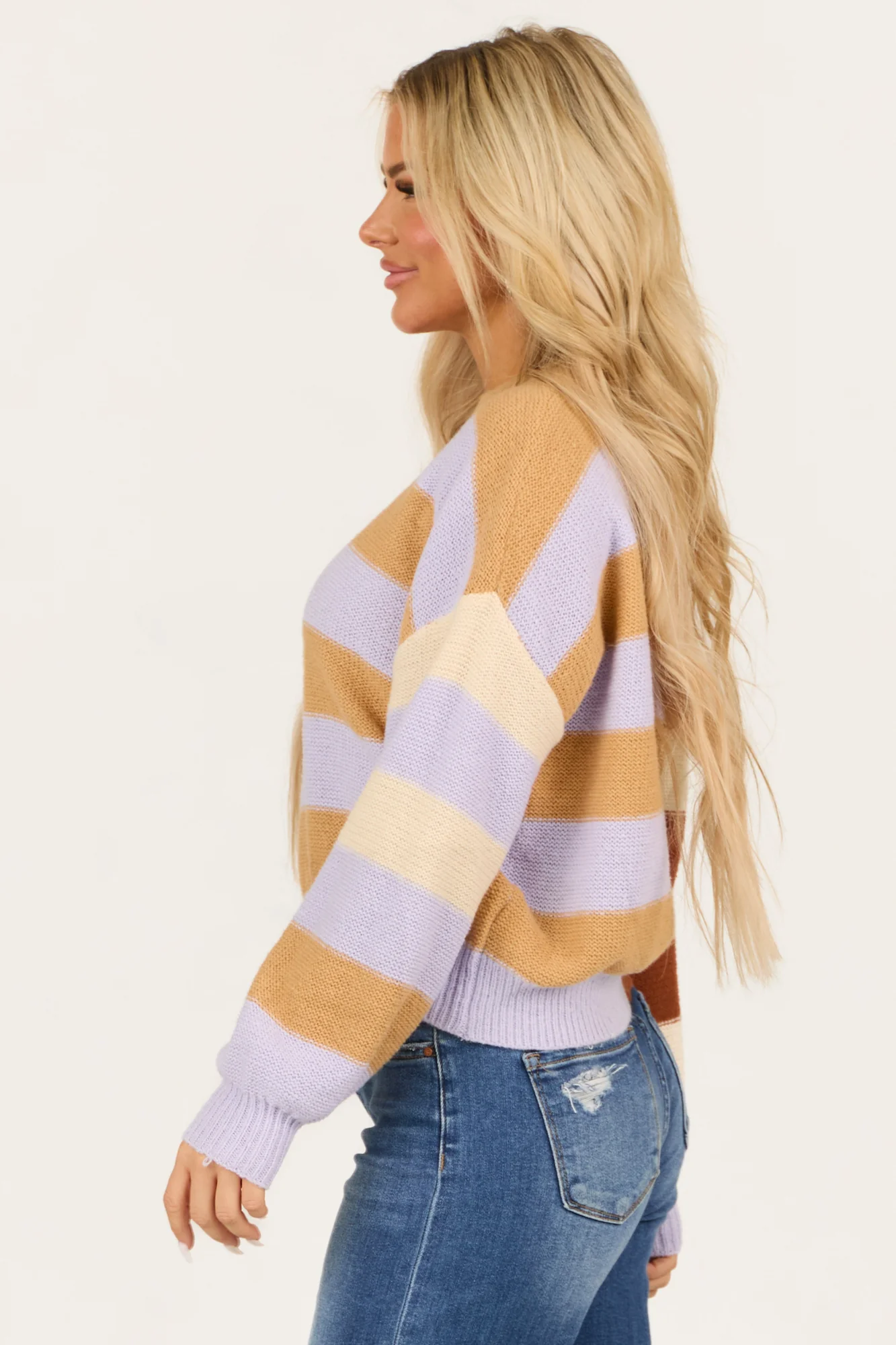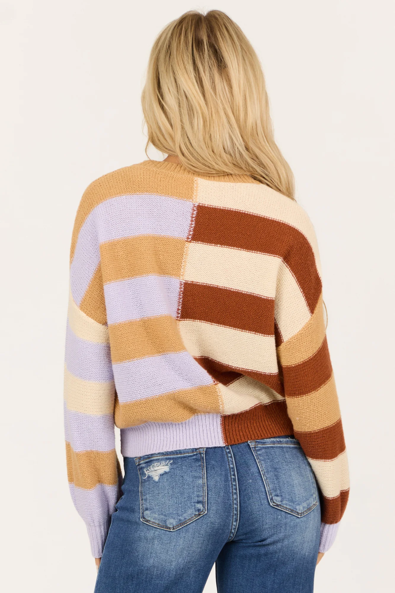 Stay stylish and cozy in this Striped Beige Balloon Sleeve Knit Sweater available in sizes S, M, L, and XL. Made of stretchy ribbed knit fabric, this sweater features stripes in shades of Copper, Lilac, Spice, and Champagne. It has a banded ribbed trim, drop shoulder design, and a crew neckline. The long balloon sleeves add a fashionable touch. This sweater is perfect for casual outings or lounging at home. Care instructions: Hand wash cold, do not bleach, do not tumble dry, iron low. Please note that due to the nature of the fabric and production process, each piece may vary slightly.