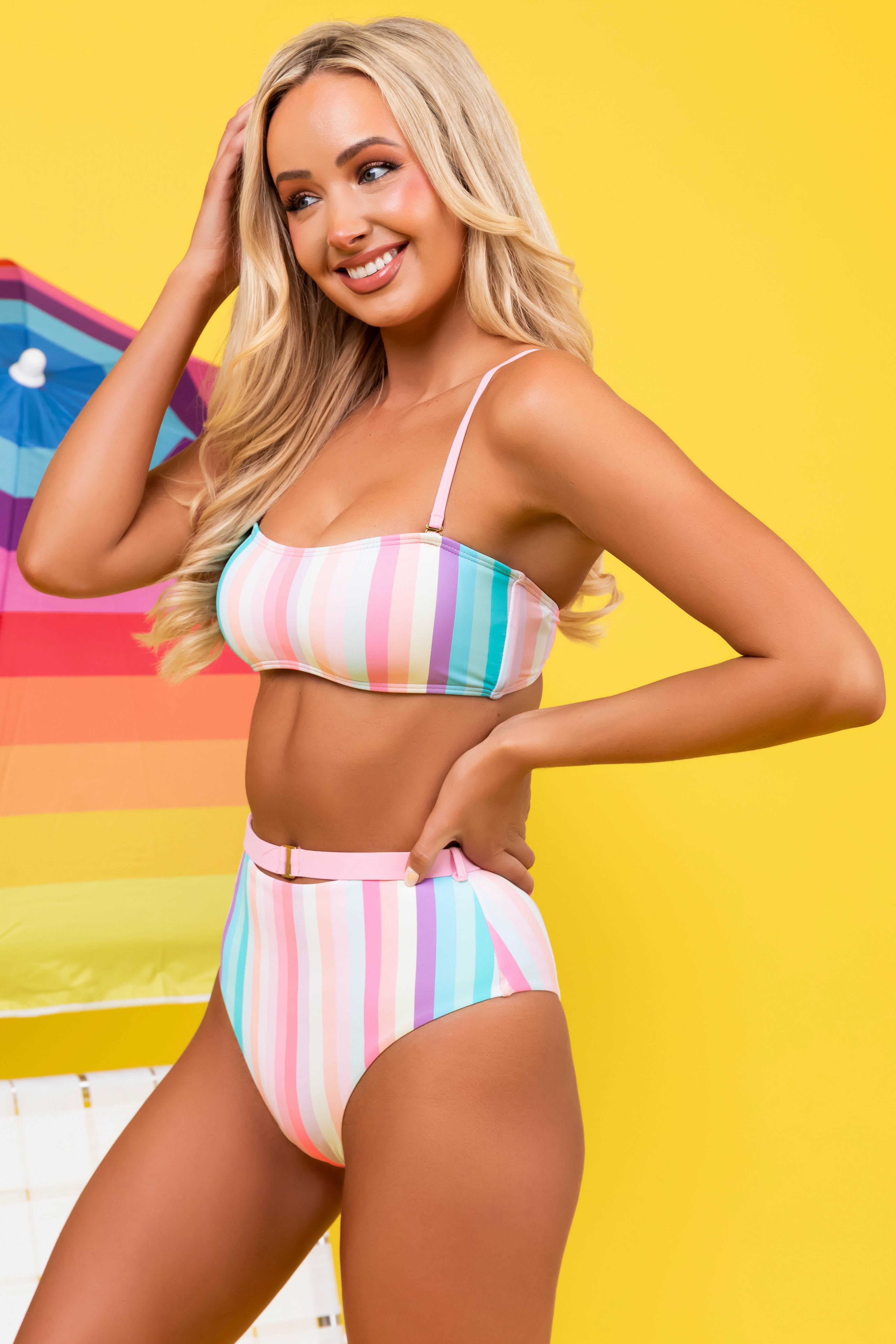 Indulge in the luxurious comfort and style of our Striped Blush Pastel High Waist Bikini Set. This bandeau-style top features a back hook closure, removable padding, and adjustable straps for a perfect fit. The included belt with Gold hardware adds a touch of elegance, while the brief cut bottom with belt loops offers a chic look. Made from a stretchy material, this bikini set allows for extra room and is lined in a soothing Beige shade. Step out in confidence with this imported swimwear crafted from 82% Nylon and 18% Spandex, featuring flattering stripes in shades of Blush, Ivory, Mauve, Neon Pink, and more. Please note that due to the cutting and sewing process, slight variations may occur. Hand wash only. Model is wearing a size Small.