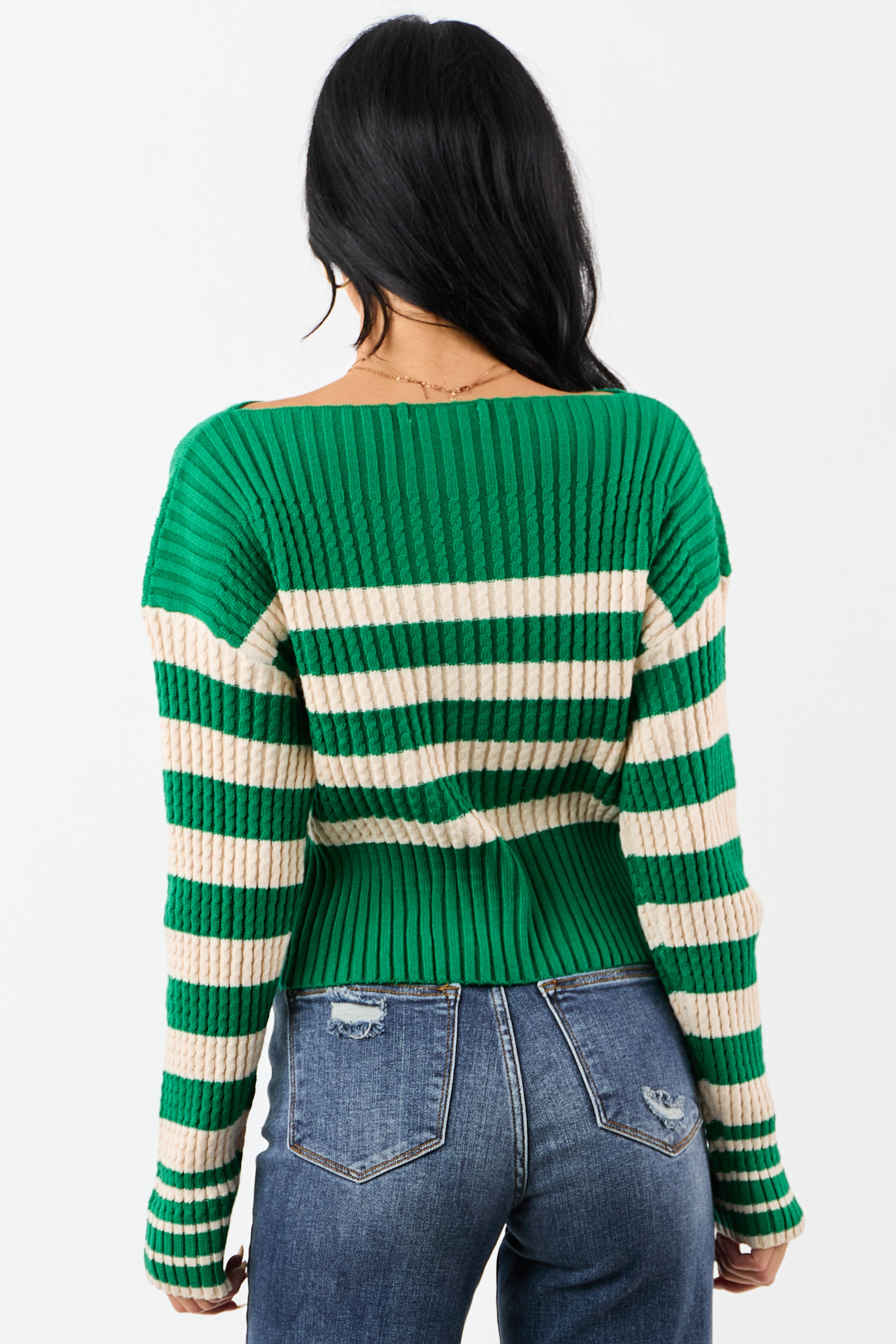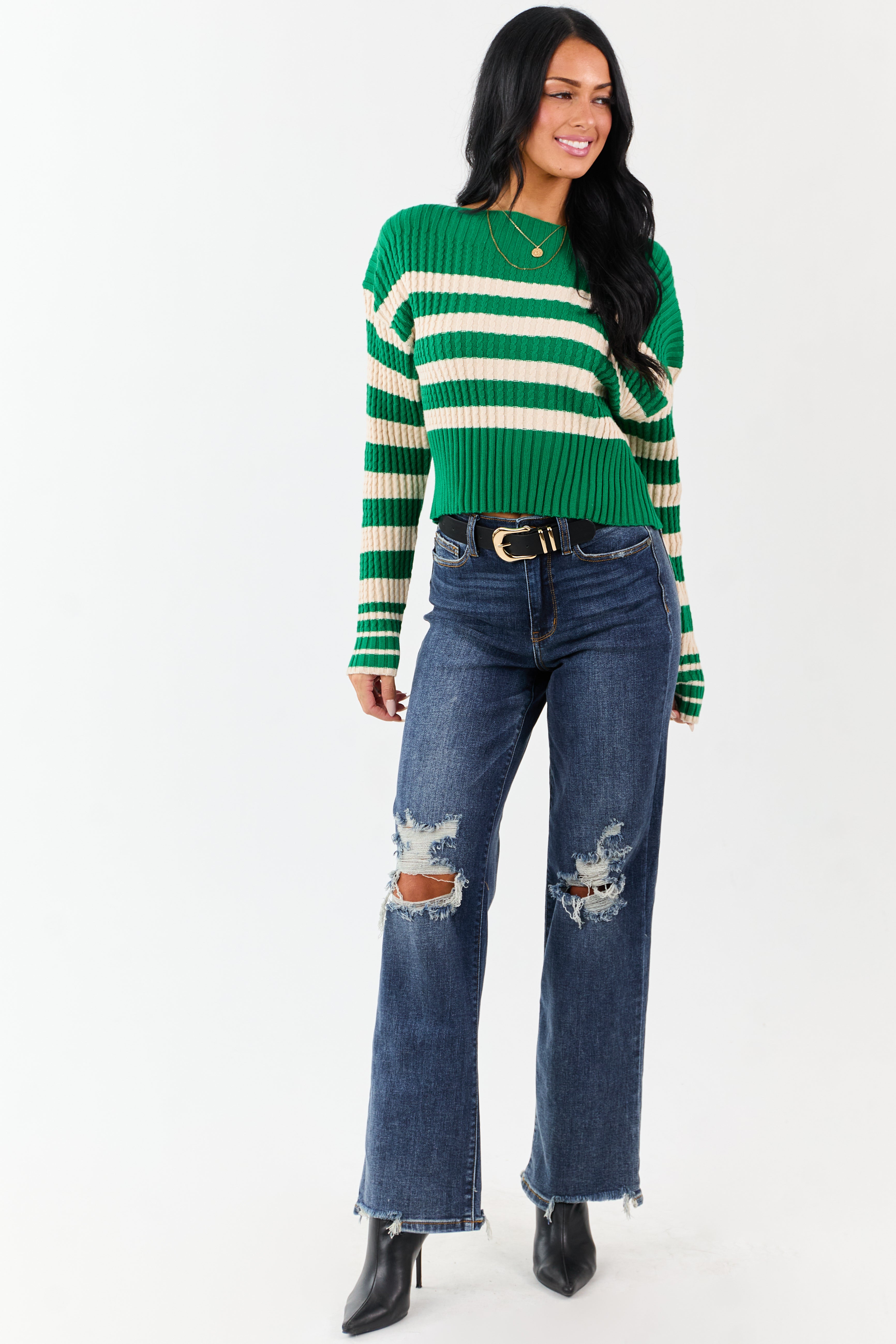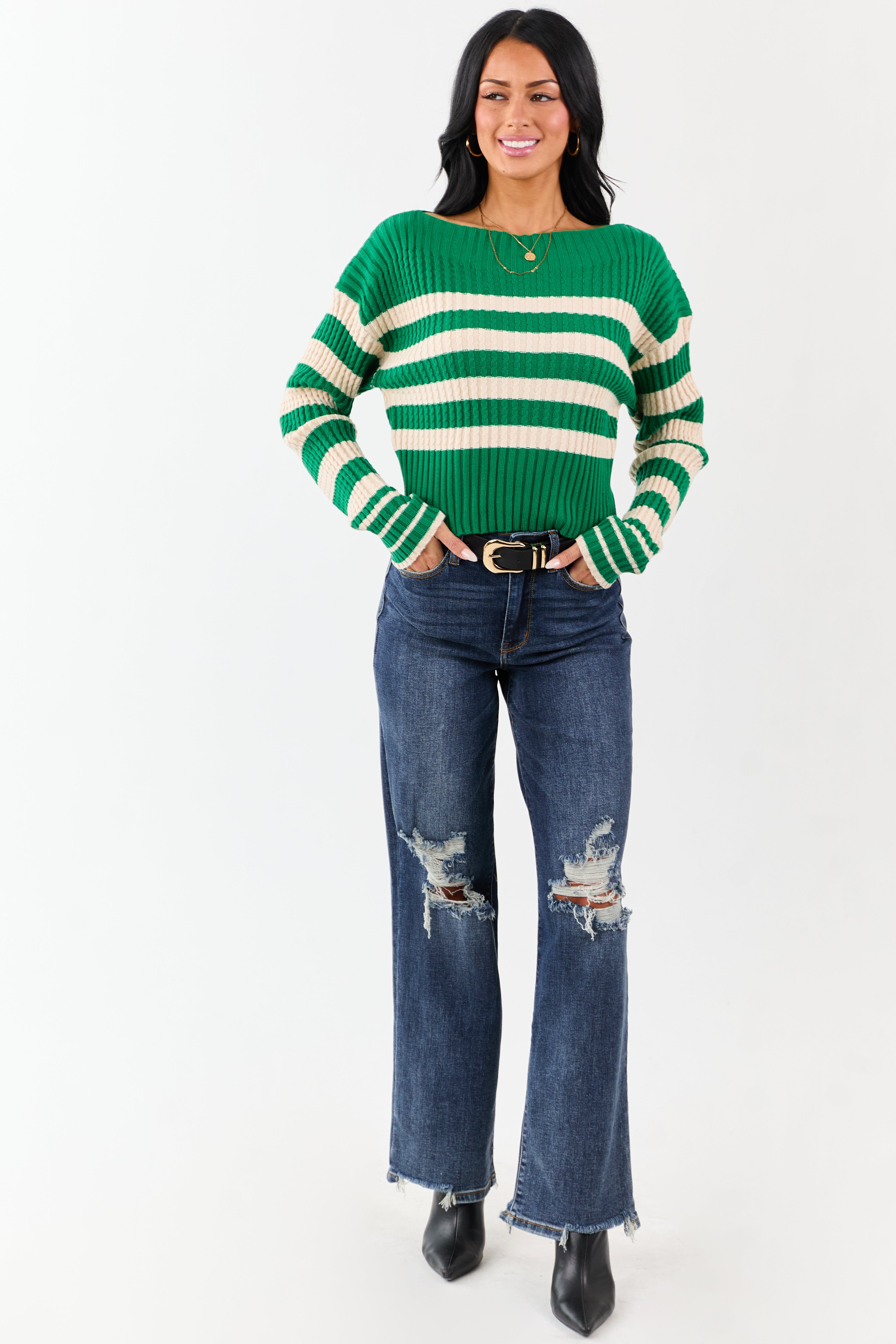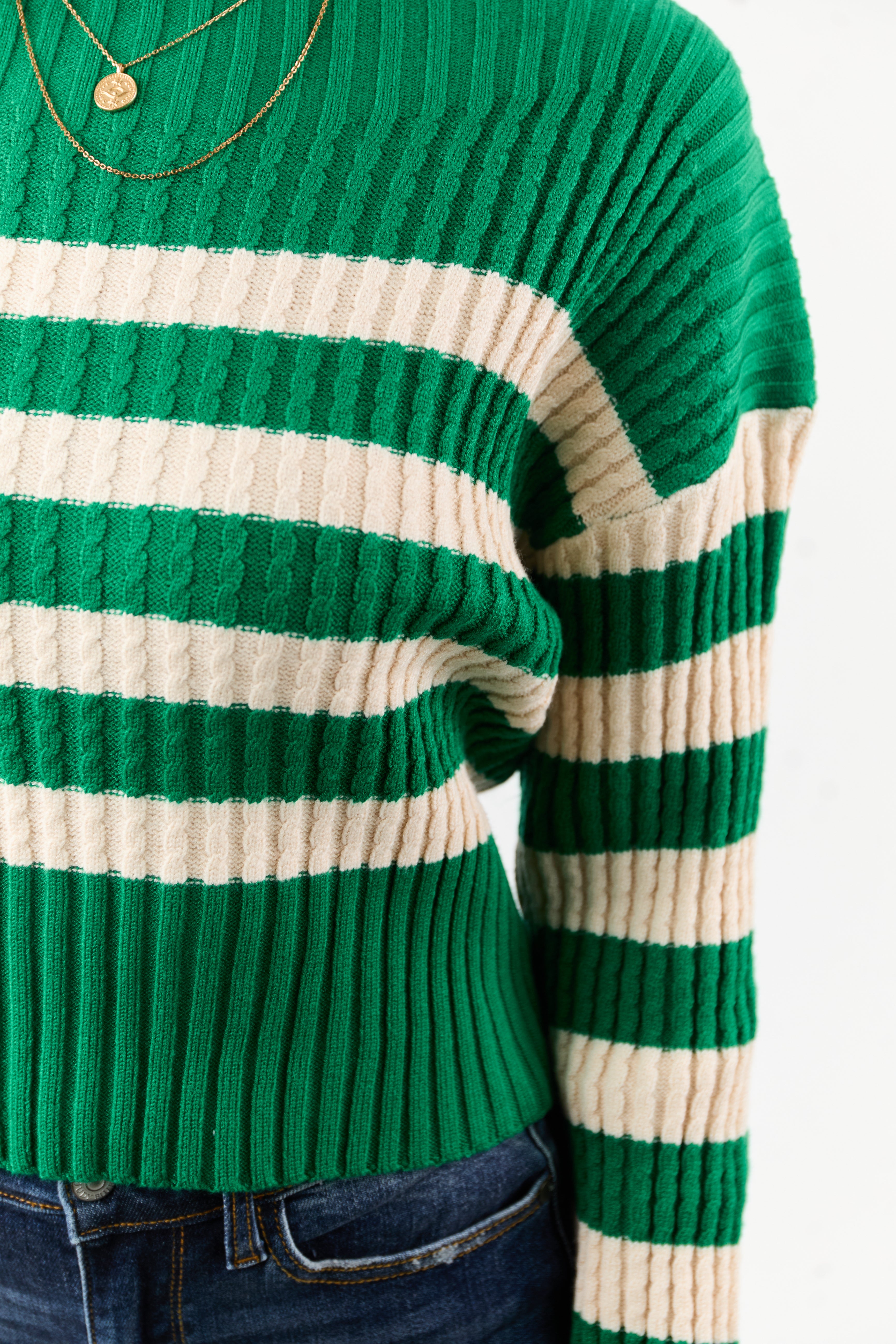 This chic sweater features bold stripes, subtle rib, and cable knit details, complemented by a flattering boat neckline. The stretchy cable knit, drop shoulder, and semi-cropped length provide a stylish and comfortable fit. Made of 50% Rayon, 30% Polyester, 20% Nylon, it offers both quality and fashion. Please note that due to the printing and sewing process, items may vary. Model wearing size S.