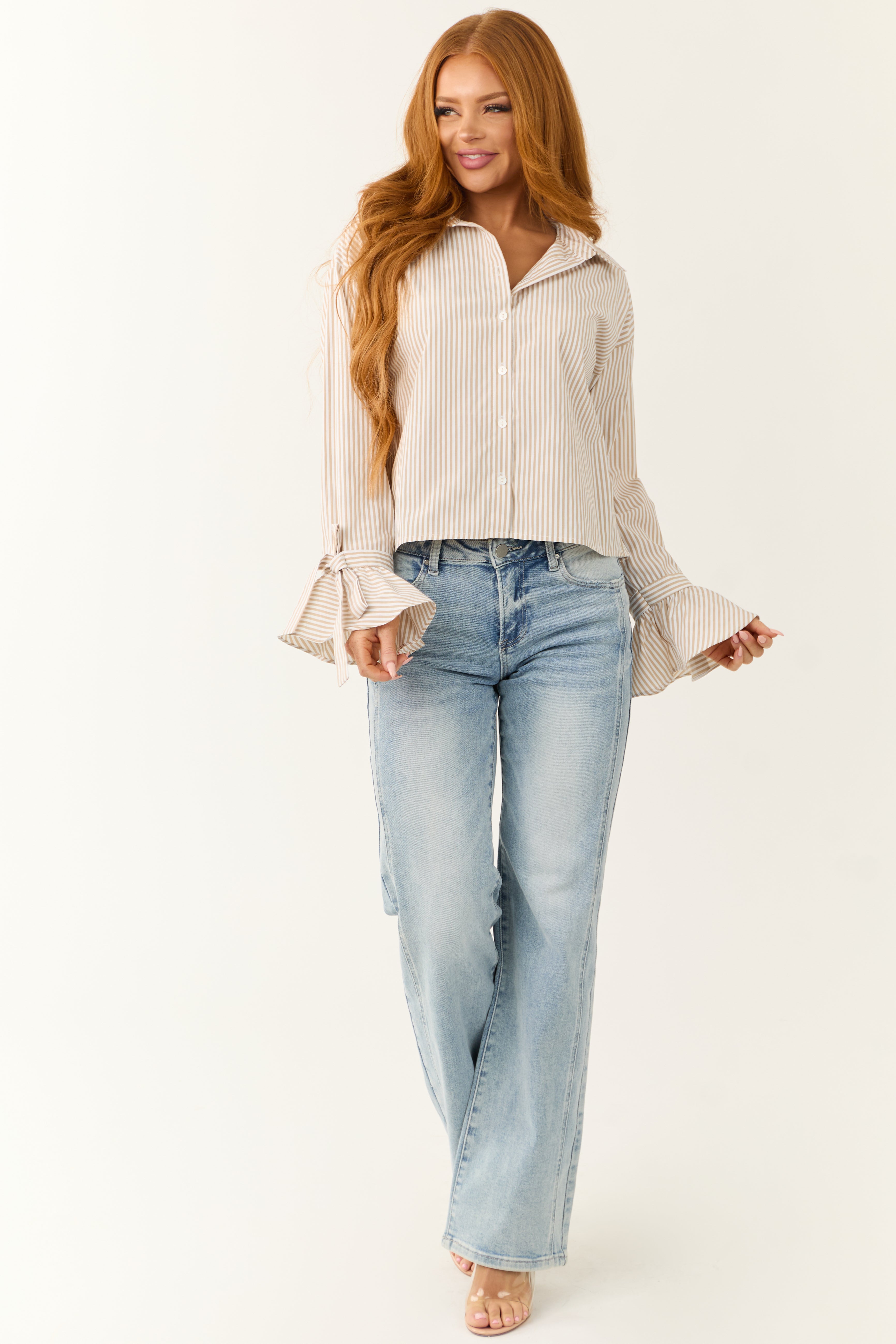 Add a touch of sophistication to your wardrobe with this Off White and Beige Striped Button Down Top. Crafted from 50% Cotton and 50% Polyester, this top features long sleeves with flare cuffs and tie detail, a collared neckline, and dart seams for a flattering fit. Perfect for both work and date nights, this versatile top is a must-have addition. Each piece may vary slightly in print and cutting due to the unique fabric. Hand wash cold, hang dry, and iron low if needed. Available sizes: S, M, L.