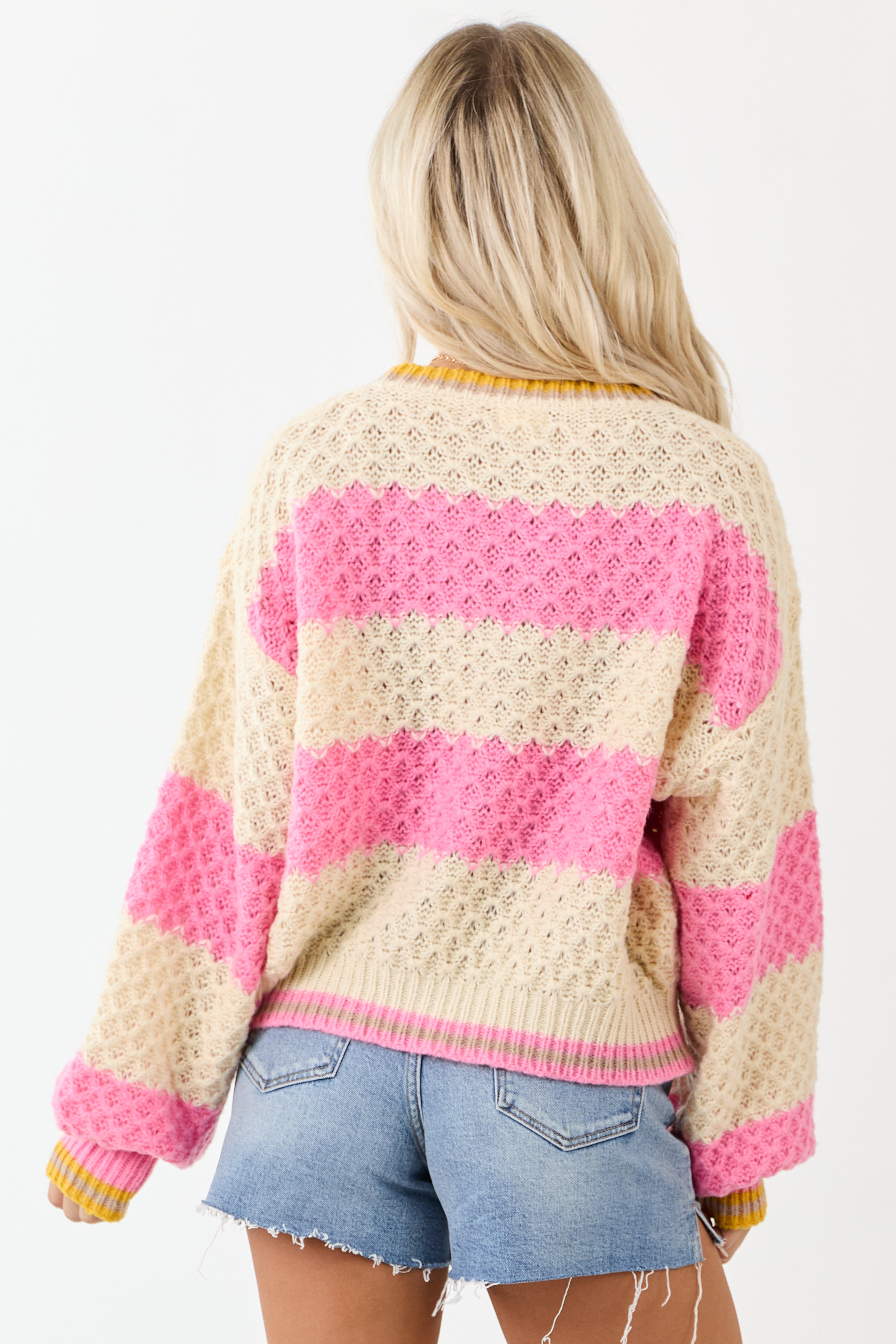 Stay sweet and cozy with our Striped Cable Knit Bubble Sleeve Sweater in Pink and Cream. This oversized sweater features a playful pop of contrasting stripes, bubble sleeves, and ribbed banded trim for a trendy look. Made of 100% Acrylic, it offers ultimate comfort and style. Perfect for cool evenings or casual outings, this sweater is sure to become your favorite go-to piece. Please note that due to the unique cutting and sewing process, slight variations may occur in each item. Model is wearing a size Small.