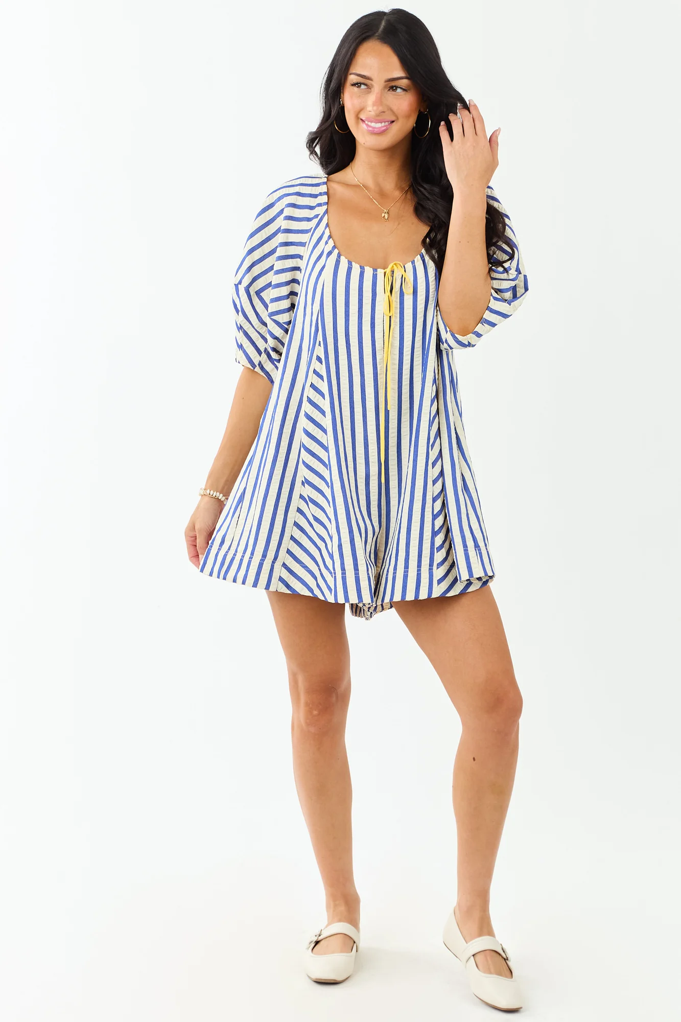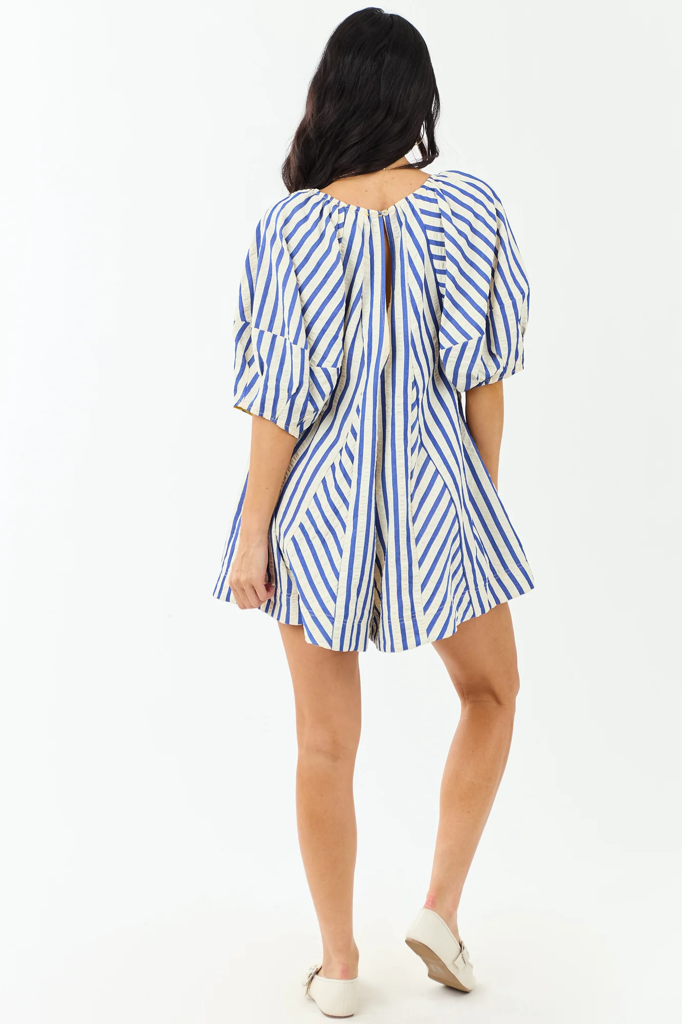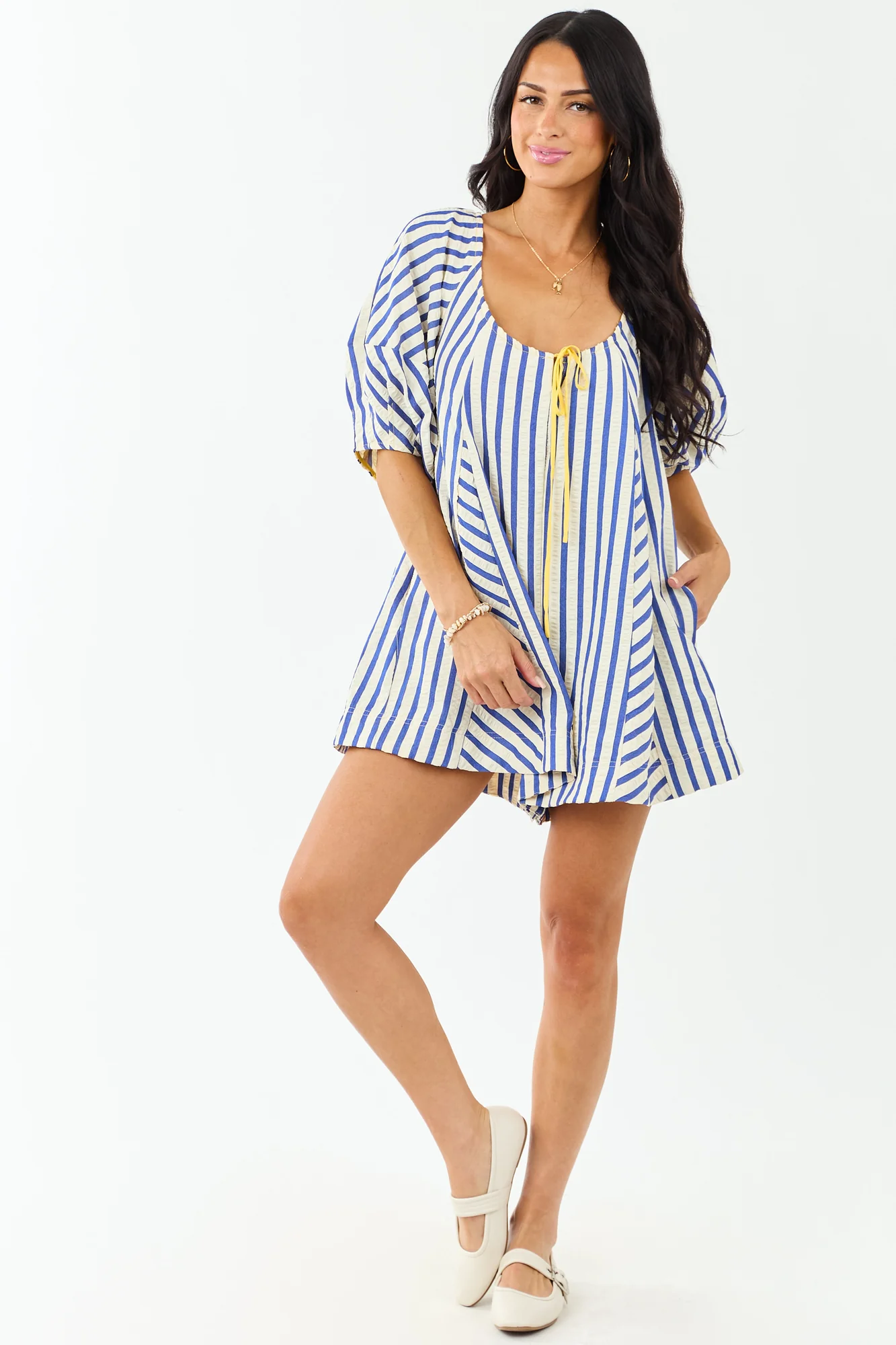This oversized-fit romper exudes seaside charm with bubble sleeves and cobalt stripes. Crafted with a cinching bust tie and side pockets, it offers both style and convenience. Made of 100% polyester with a lined hem of 100% rayon, this romper features a back keyhole opening and a 2″ inseam. Perfect for casual summer days, this romper is a must-have for your wardrobe. Model is wearing a size Small. Model Profile: Size 1, Height 59″, Bust 34″, Waist 26″.