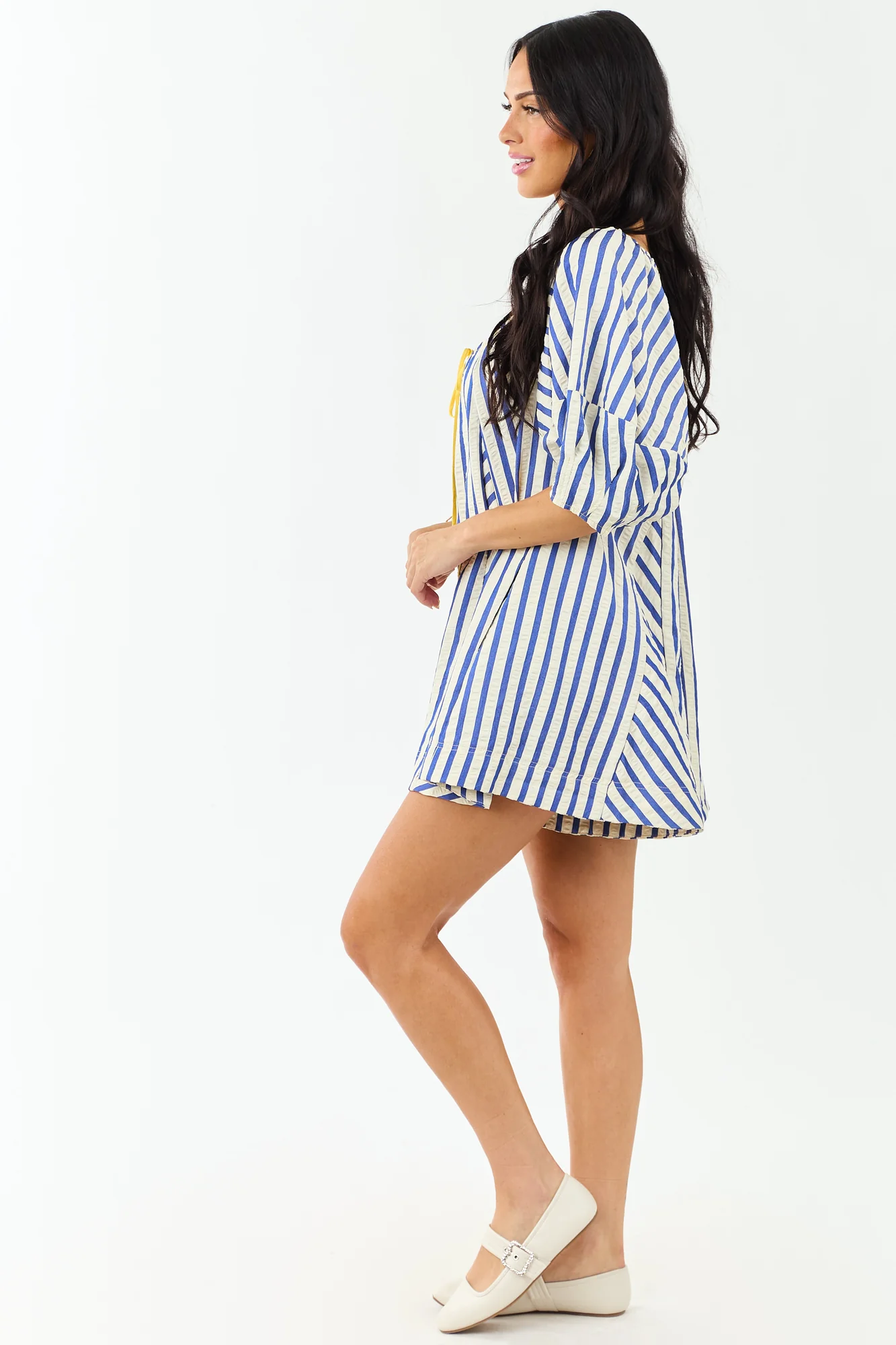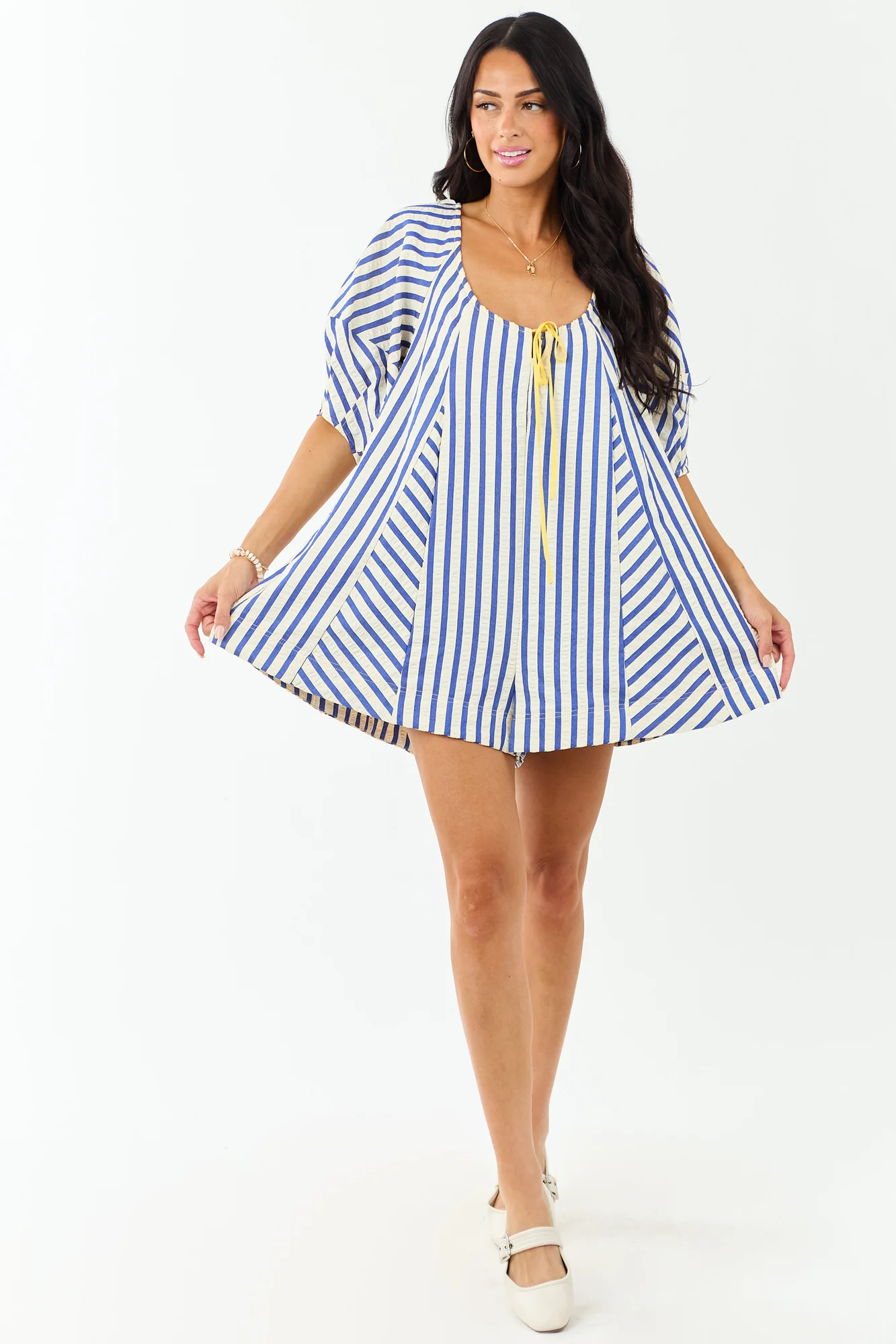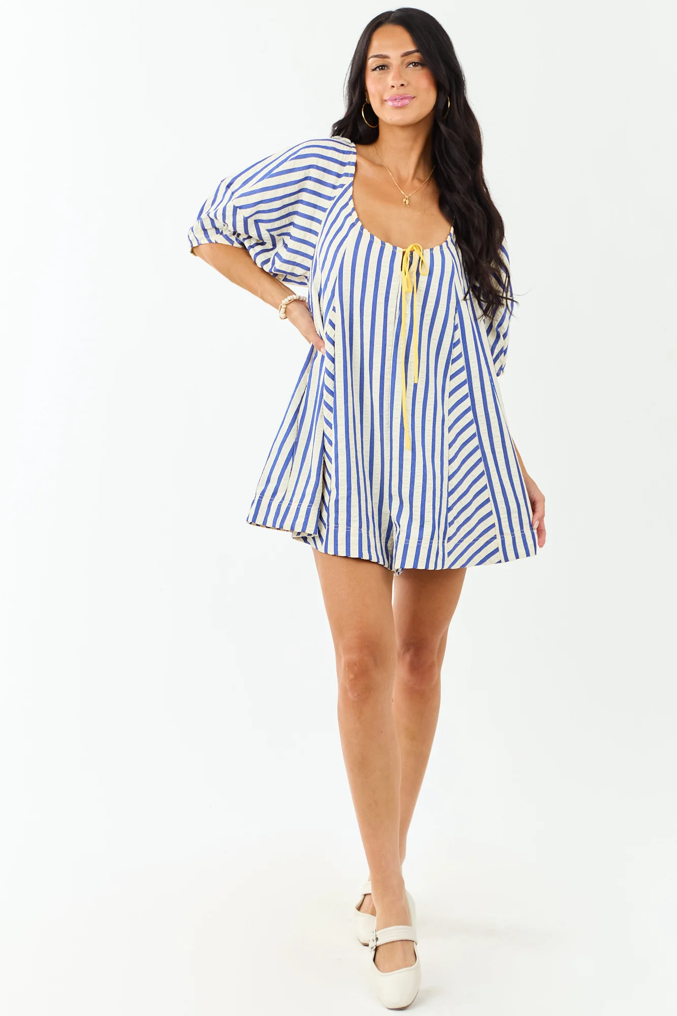This oversized-fit romper exudes seaside charm with bubble sleeves and cobalt stripes. Crafted with a cinching bust tie and side pockets, it offers both style and convenience. Made of 100% polyester with a lined hem of 100% rayon, this romper features a back keyhole opening and a 2″ inseam. Perfect for casual summer days, this romper is a must-have for your wardrobe. Model is wearing a size Small. Model Profile: Size 1, Height 59″, Bust 34″, Waist 26″.