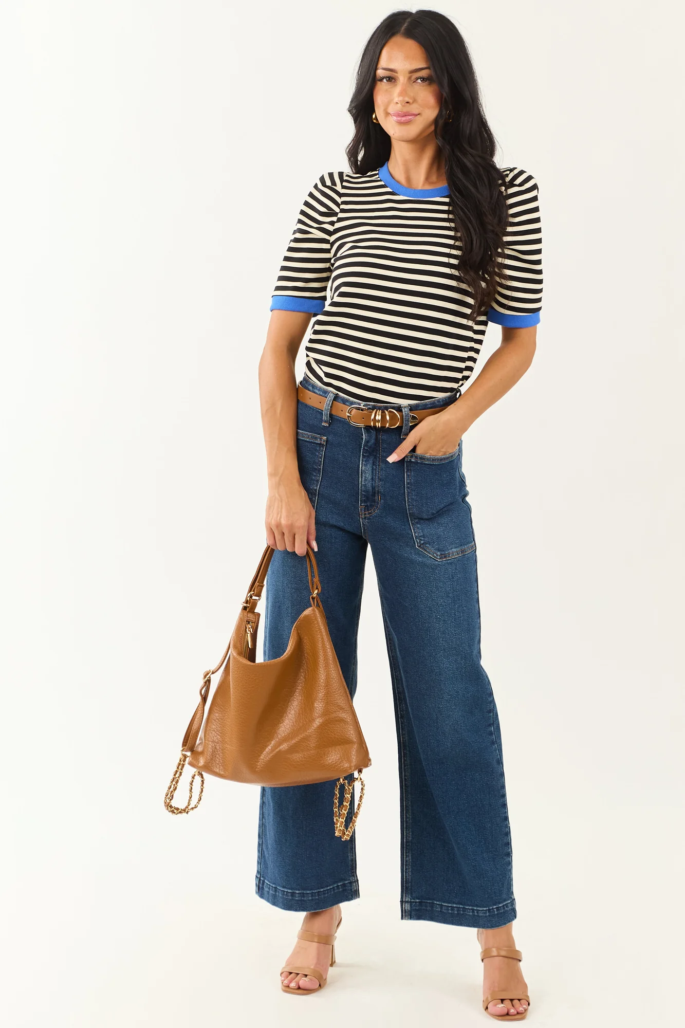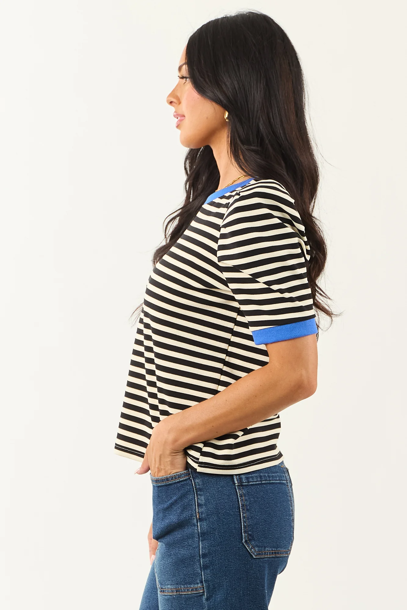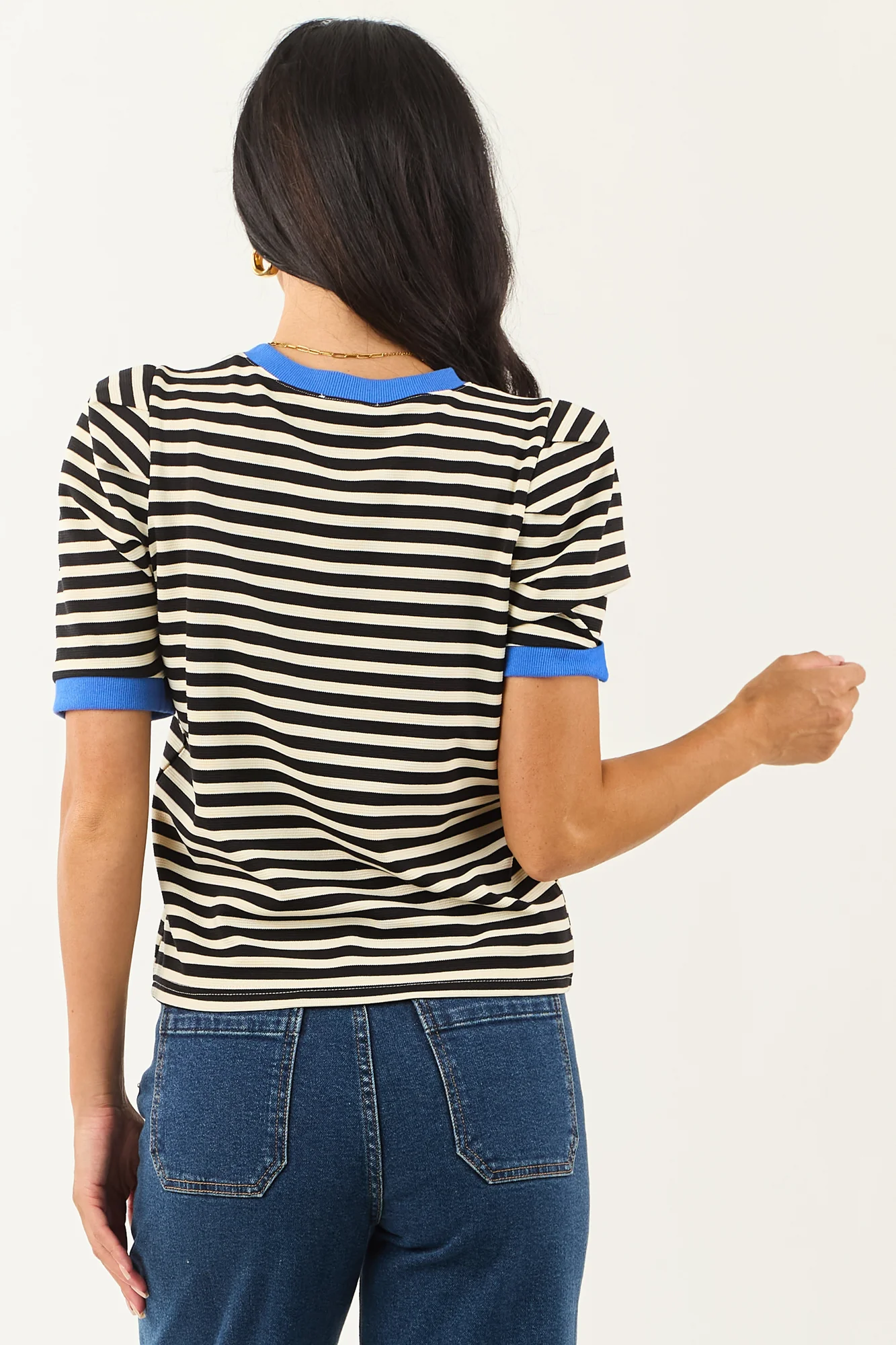 This comfortable short sleeve top offers a chic twist with neutral black and ivory stripes, accented by a vibrant dusty blue contrast trim. Crafted from a semi-stretchy poly-cotton blend, featuring shoulder padding for structure and dusty blue banded ribbed cuffs and neckline for added style. Available in sizes S, M, and L. Bust: 36″ 38″ 40″ Length: 21″ 21.5″ 22″ Sleeve Length: 11″ 11.5″ 12″. Imported. Model is wearing a size Small. Ideal for casual outings and laid-back weekends.