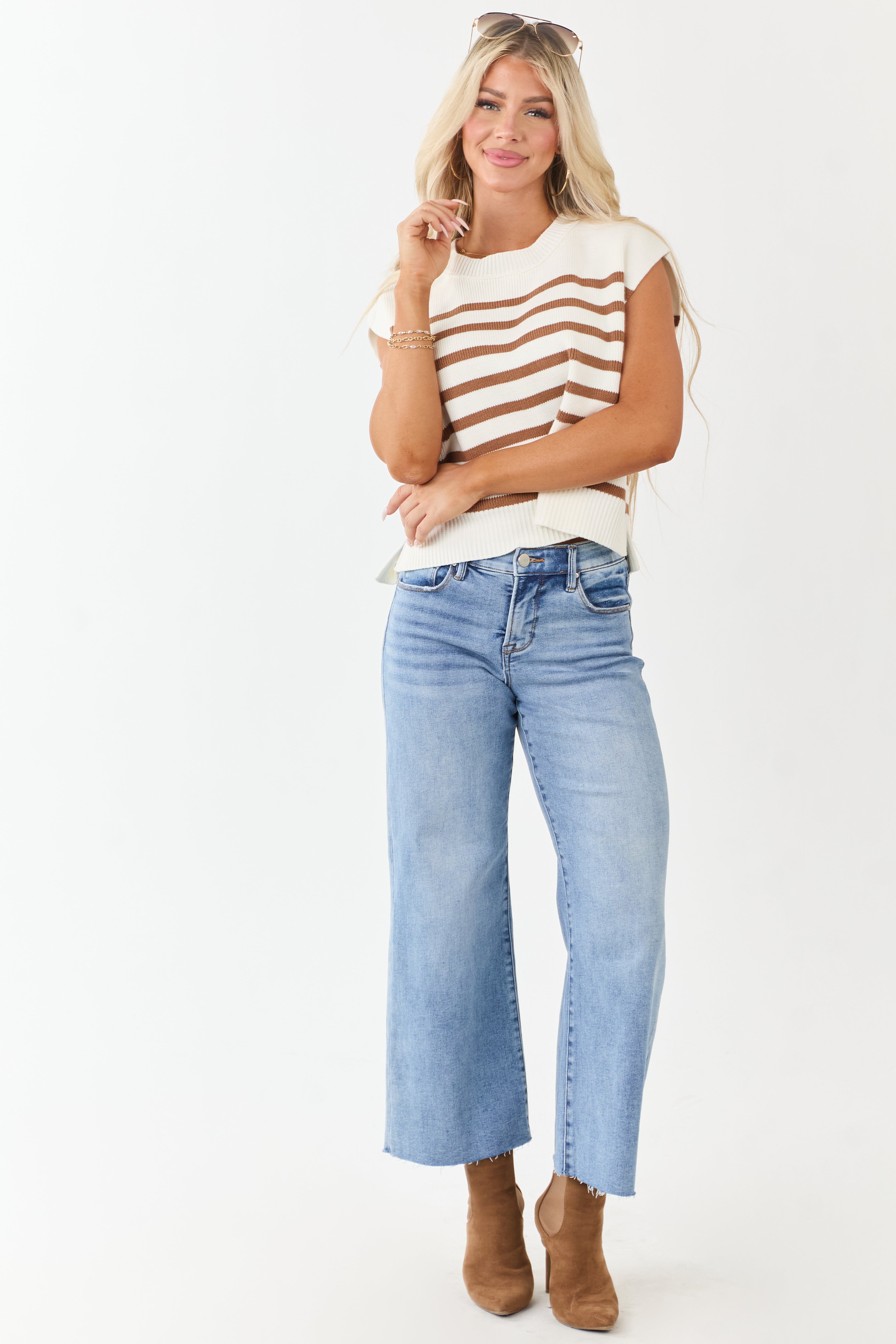 Stay stylish and cozy in this versatile Striped Cotton Blend Boxy Sweater Vest . With an oversized, wide boxy fit and stretchy ribbed knit, this must-have piece features side slits for added flair. Made of a comfortable 56% Cotton, 38% Acrylic, and 6% Nylon blend, this sweater vest is perfect for the cool weather season. Please note that due to the unique print and production process, slight variations may occur in each garment. Embrace the classic stripe pattern and elevate your layering game with this chic vest. Model is wearing a size Small. Model’s measurements: Size 3, Height 57″, Bust: 35″, Waist: 26″.