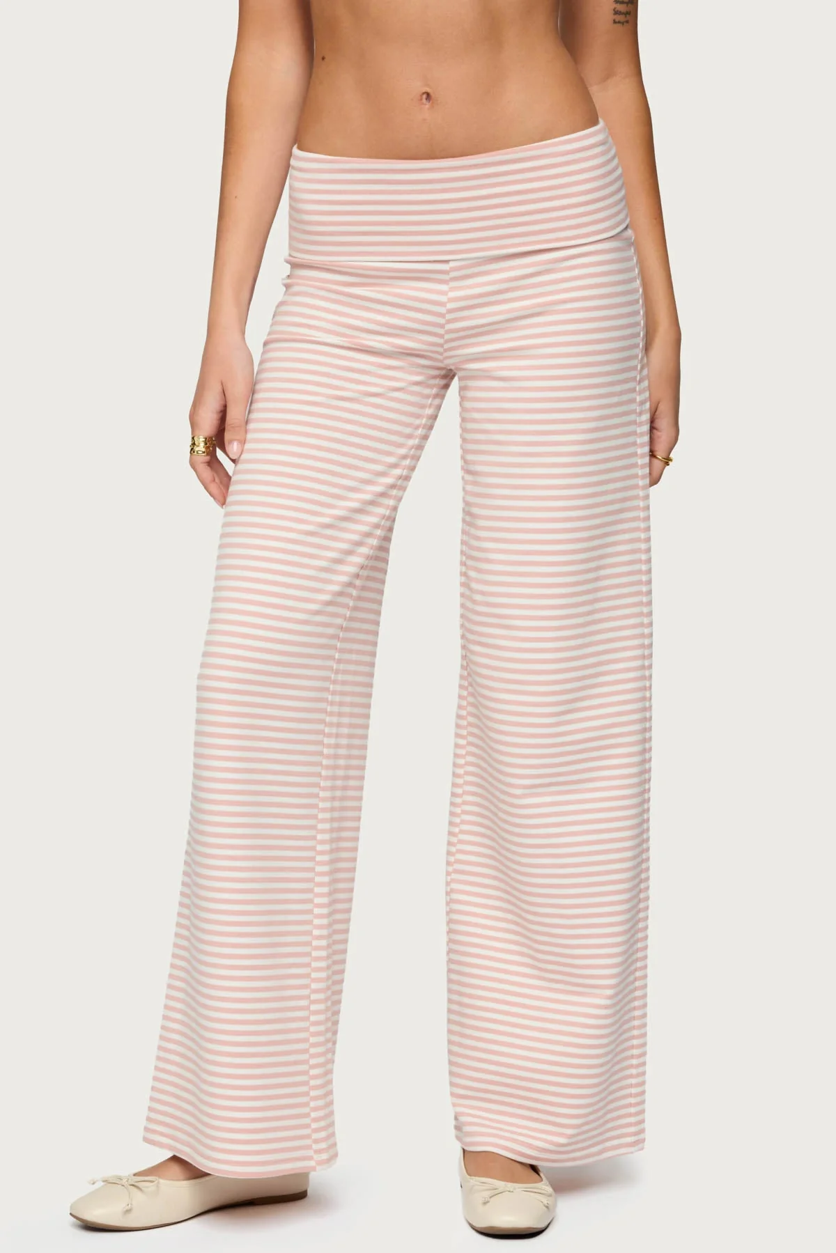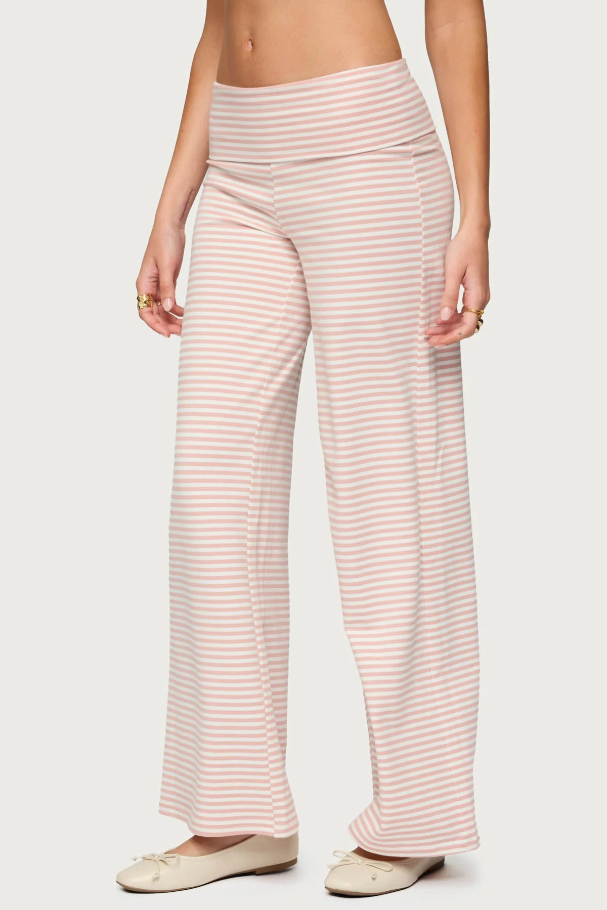 Discover ultimate comfort and style with our Pink & White Striped Cotton Fold Over Wide Leg Pants. Designed for a flattering fit and lasting durability, these pants feature a unique fold-over waistband and a trendy striped pattern. Perfect for any occasion, whether youre lounging at home or heading out for a casual outing. Made from a blend of Cotton, Polyester, and Spandex. Machine washable for easy care. Available in sizes XS to XL.