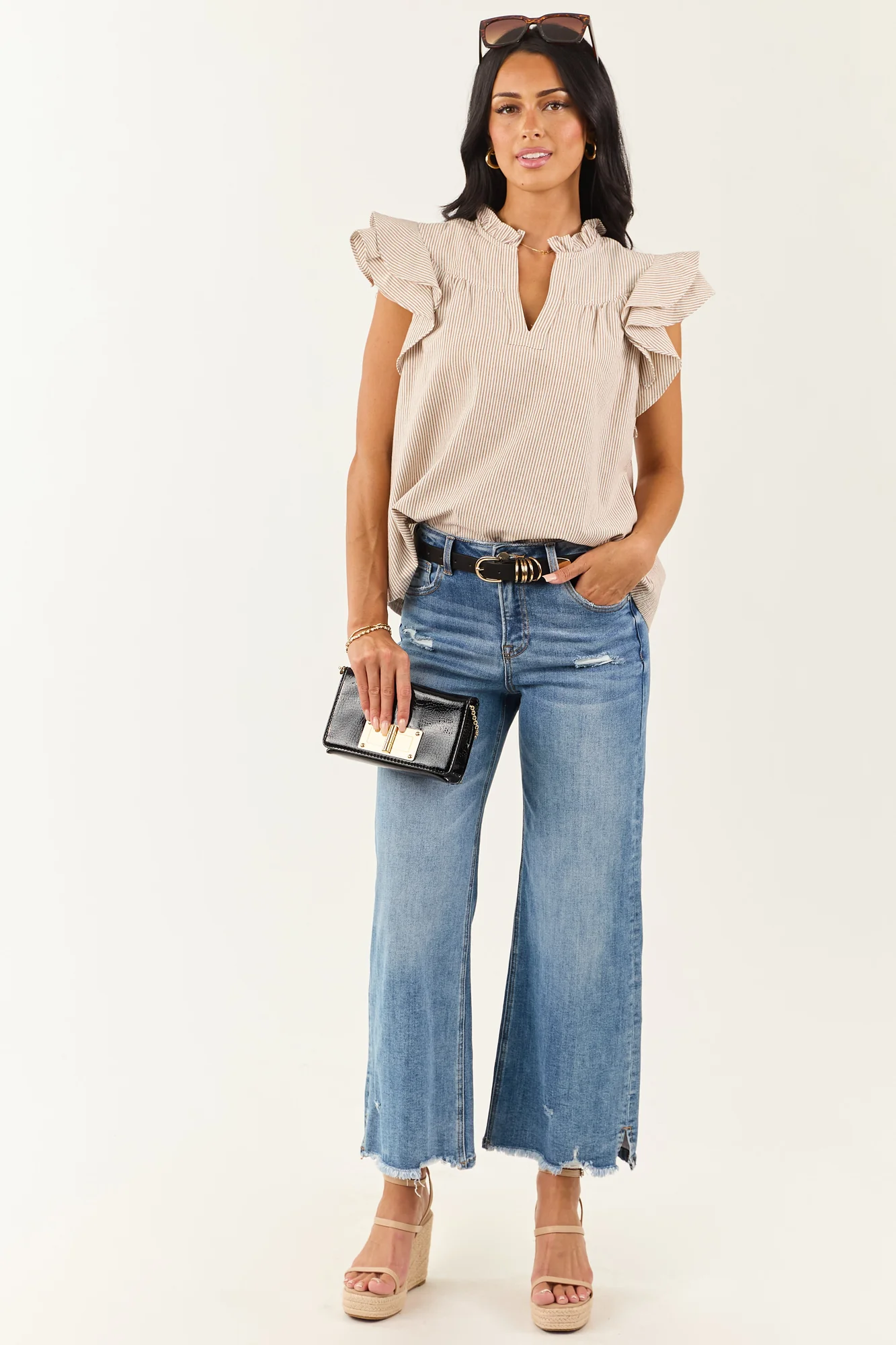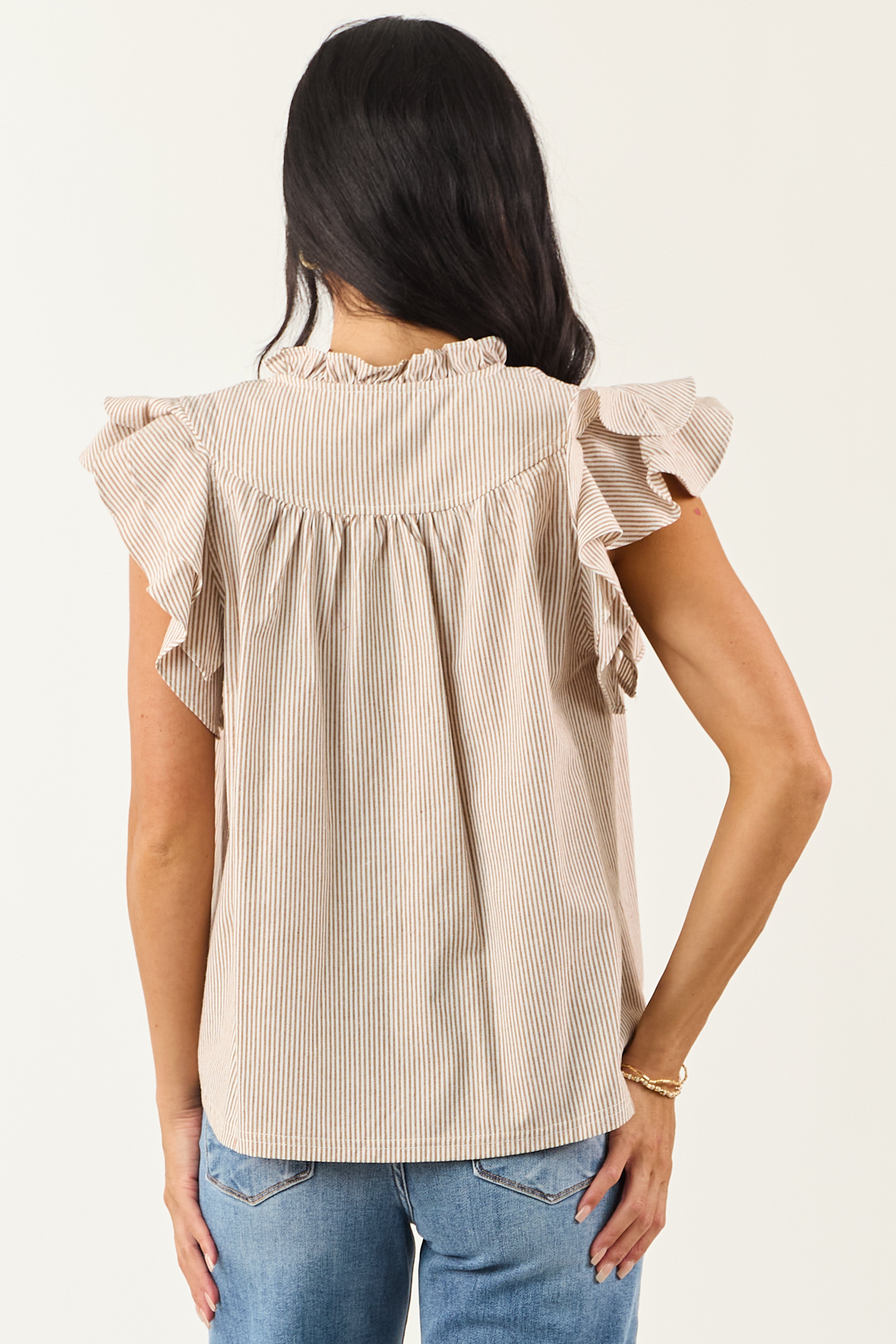 This brown top features white pin stripes, a frill neckline, and tiered ruffle sleeves, made of non-stretchy lightweight cotton for a polished and feminine look. With an oversized fit and 100% cotton material, it offers comfort and style. Perfect for pairing with denim or trousers for a seamless transition from work to weekend. Imported and available in sizes S, M, L. Model shown is wearing size Small. Ideal for casual and semi-formal occasions.
