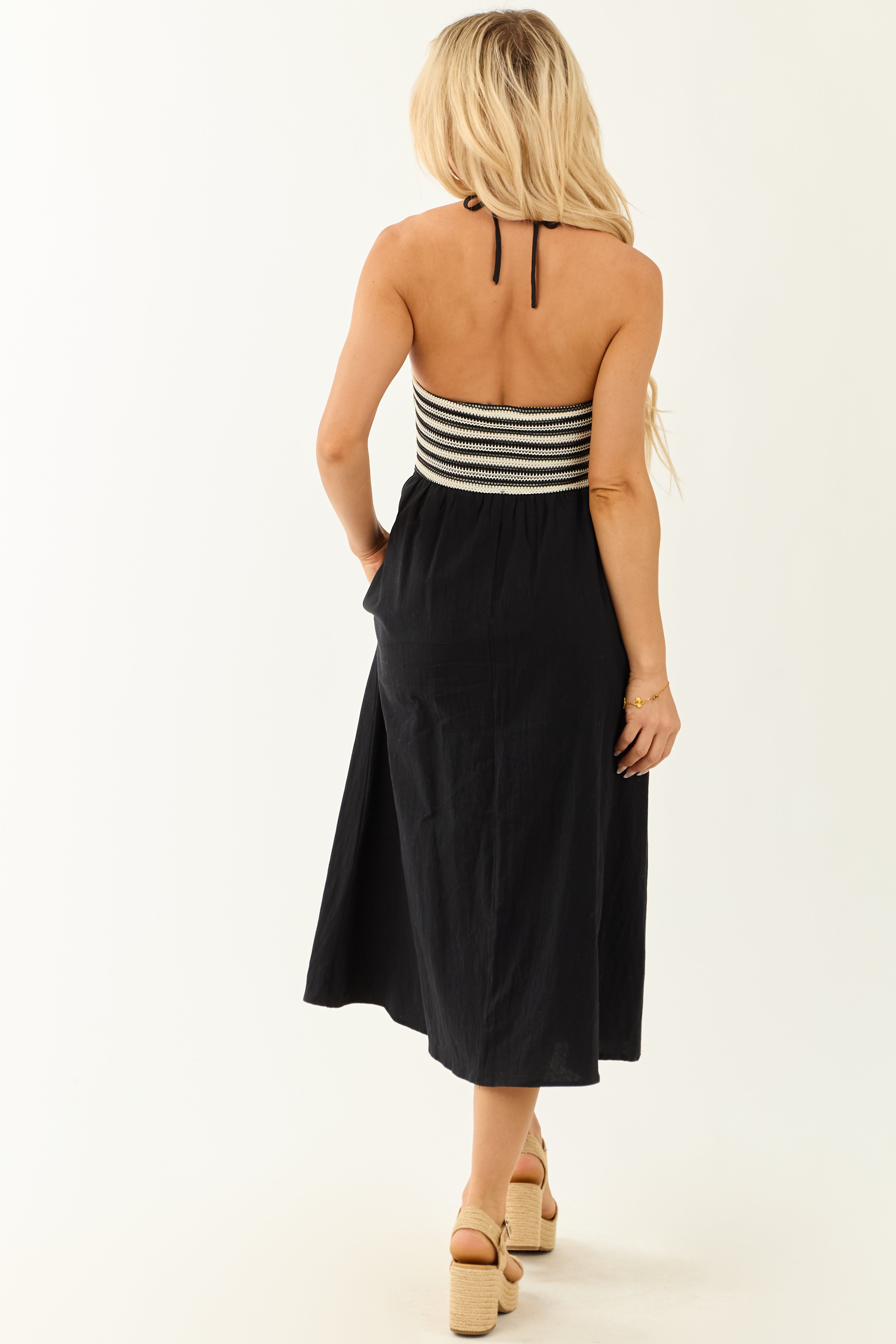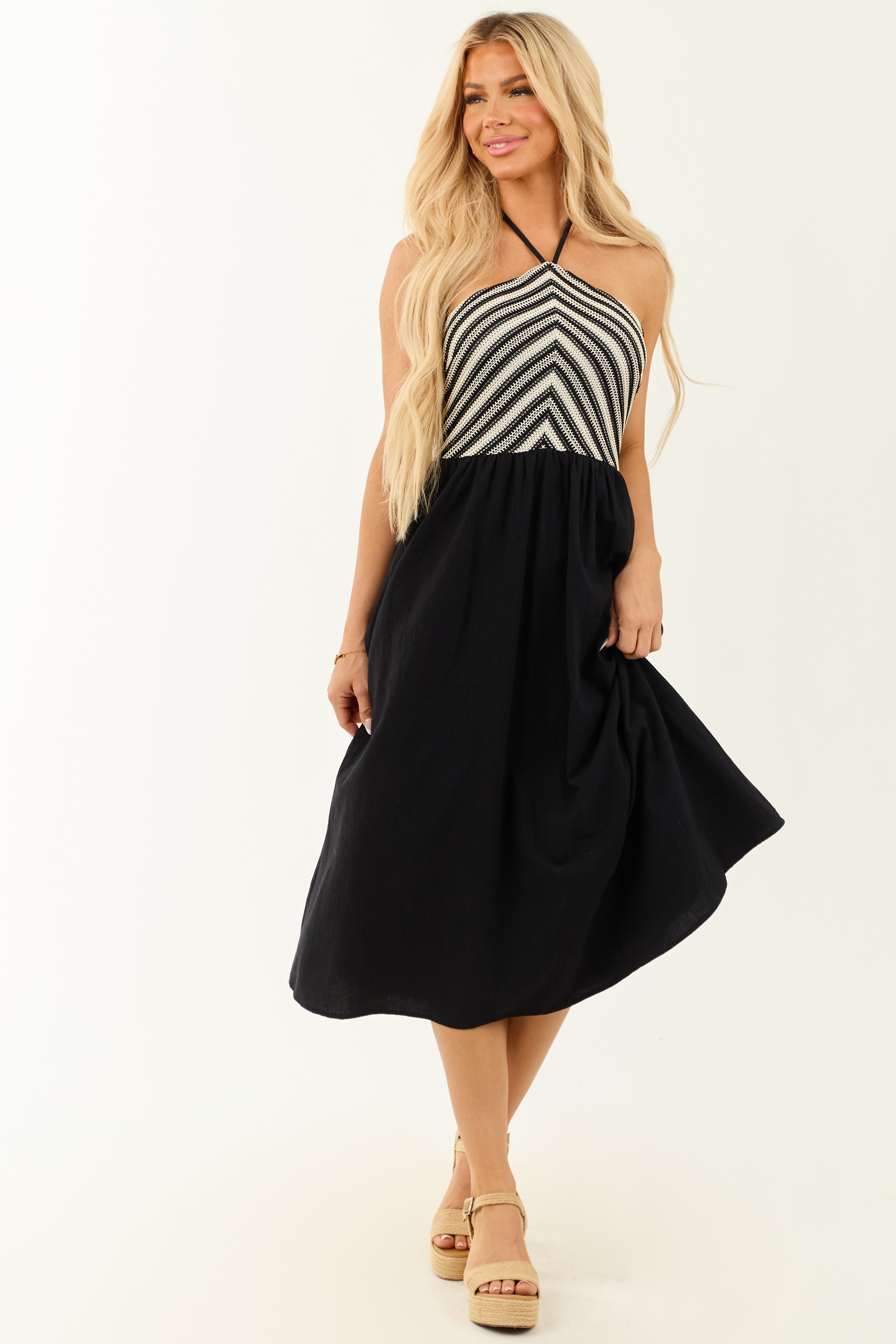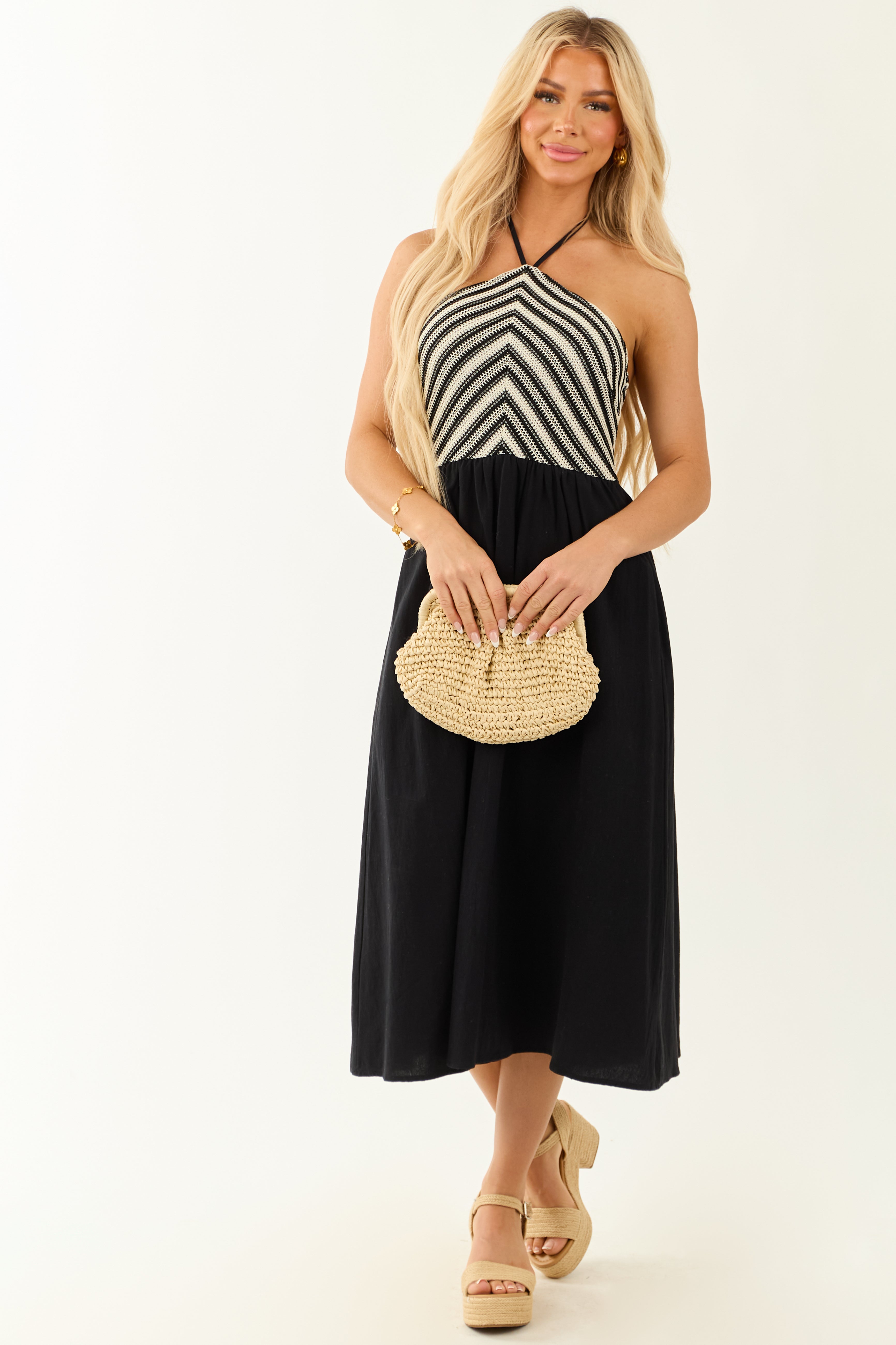 Get ready to showcase your unique style with this charming crochet dress. Made with a semi-stretchy crochet bodice and adorned with Ivory stripes. Features an adhesive strip on the back for secure fit, a side zipper with hook and eye closure, hidden side pockets, and lined to the knee for comfort. Crafted from 100% Polyester (Contrast and Lining: 100% Polyester). Hand wash cold, wash separately, hang dry. Model is wearing a size Small. Model Profile: Size 1, Height 57″, Bust 34″, Waist 26″.
