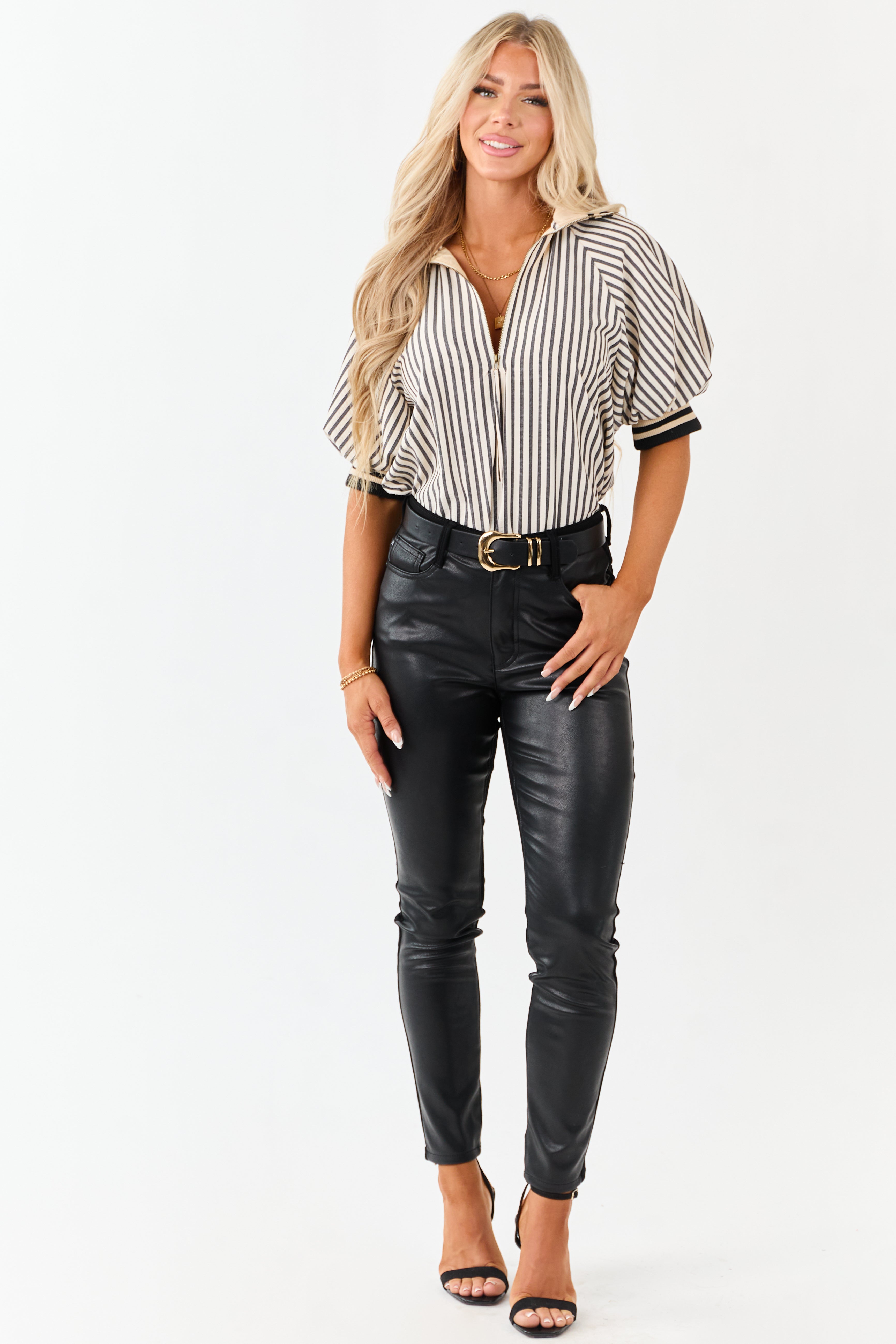 Elevate your wardrobe with our Striped Half Puff Sleeve Top in Cream and Black. Featuring banded cuffs, a mock neck collar, and a half zip-up design, this relaxed top offers a bold and feminine look. The stretchy ribbed collar and cuffs add comfort and style. Made of 50% Cotton and 50% Polyester. Perfect for casual outings or everyday wear. Available in sizes S, M, and L. Model is wearing a size Small.