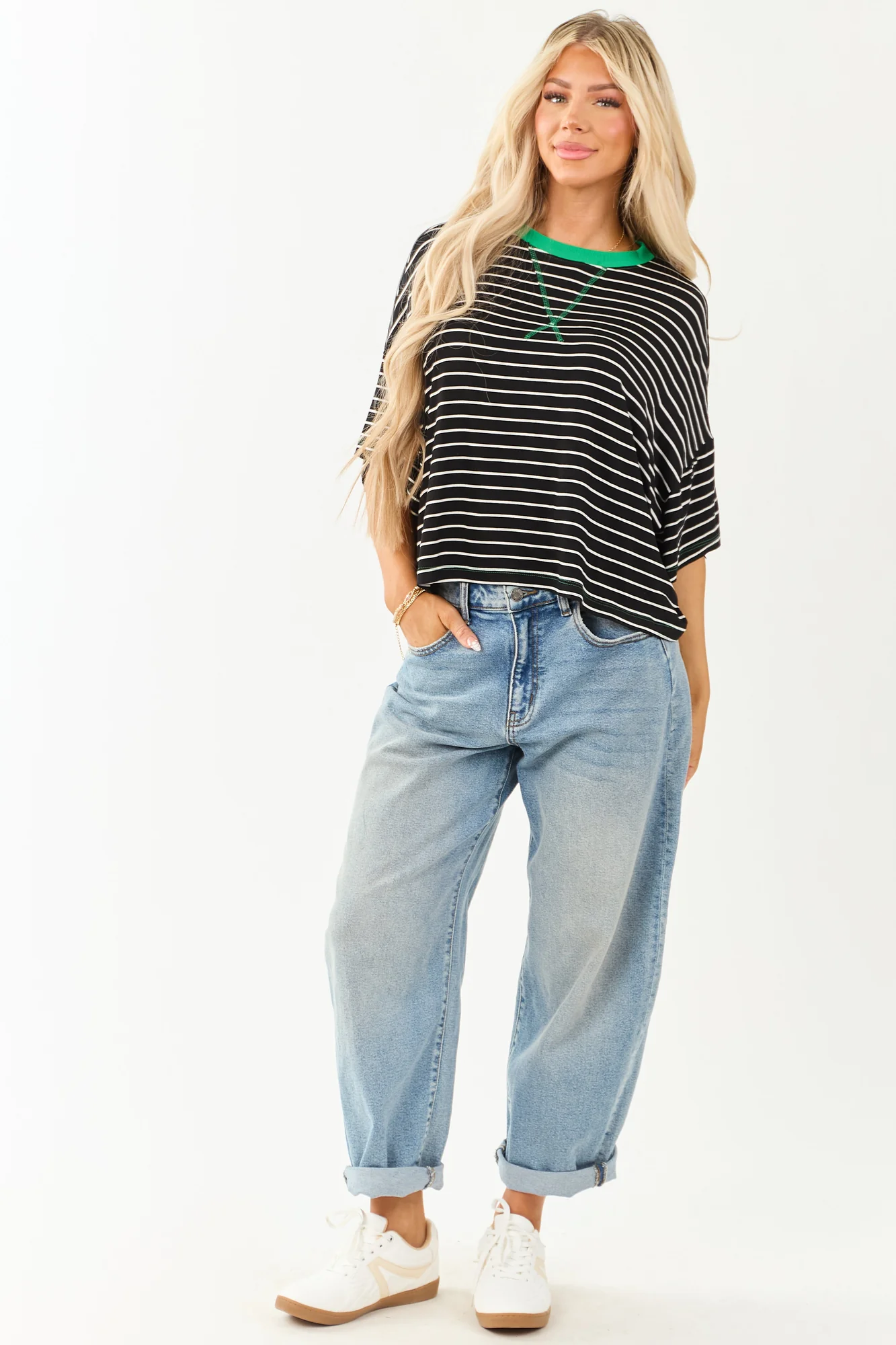 Experience the timeless style of our Striped Half Sleeve Ribbed Knit Top in Black and Green. This top offers an oversized fit with a stretchy ribbed knit fabric that ensures comfort and versatility. The bold stripes in Black and Off White add a chic touch, while the drop shoulder design and slightly sheer finish elevate your look effortlessly. Made of 96% Rayon and 4% Spandex for a luxurious feel. Please note that due to the unique fabric print, cutting, and sewing process, each piece may vary slightly. Model is wearing a size Small and her measurements are Size 3, Height 57″, Bust 35″, Waist 26″.