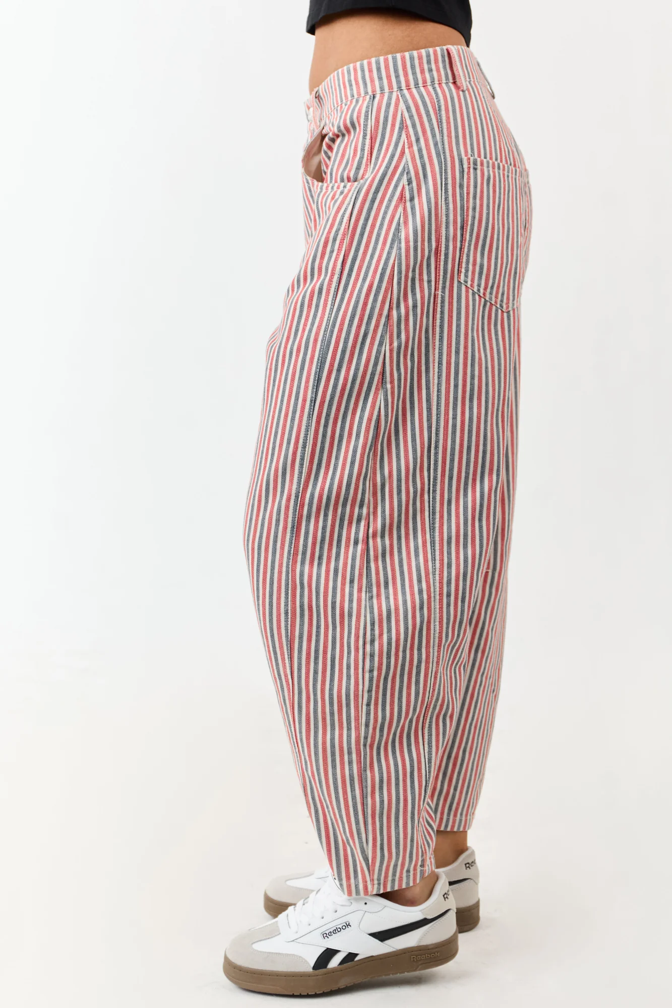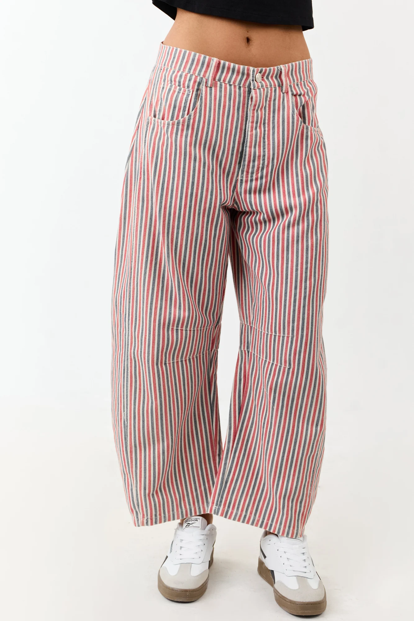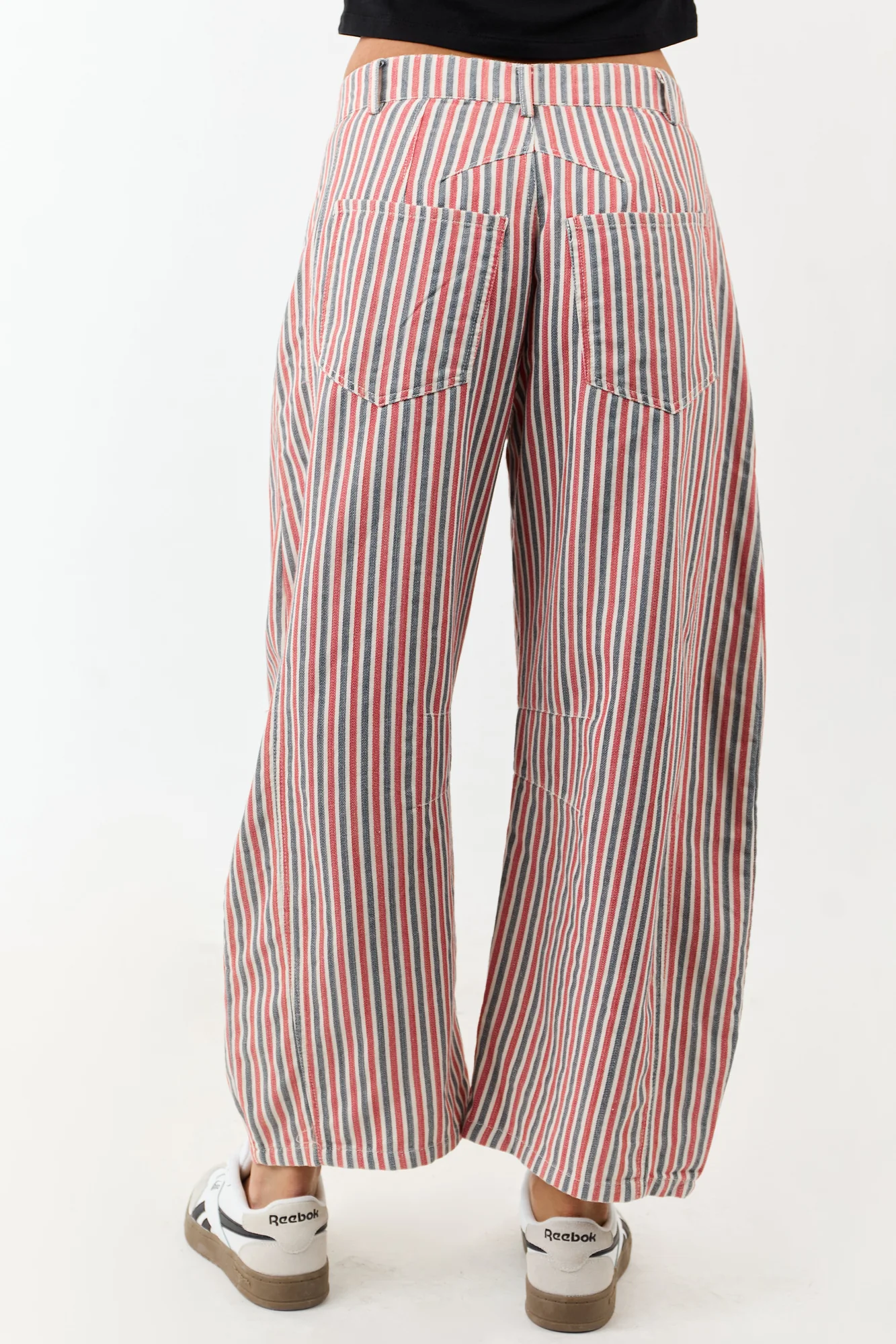 Striped High-Rise Barrel Fit Cropped Pants in Steel Blue Ruby Cream