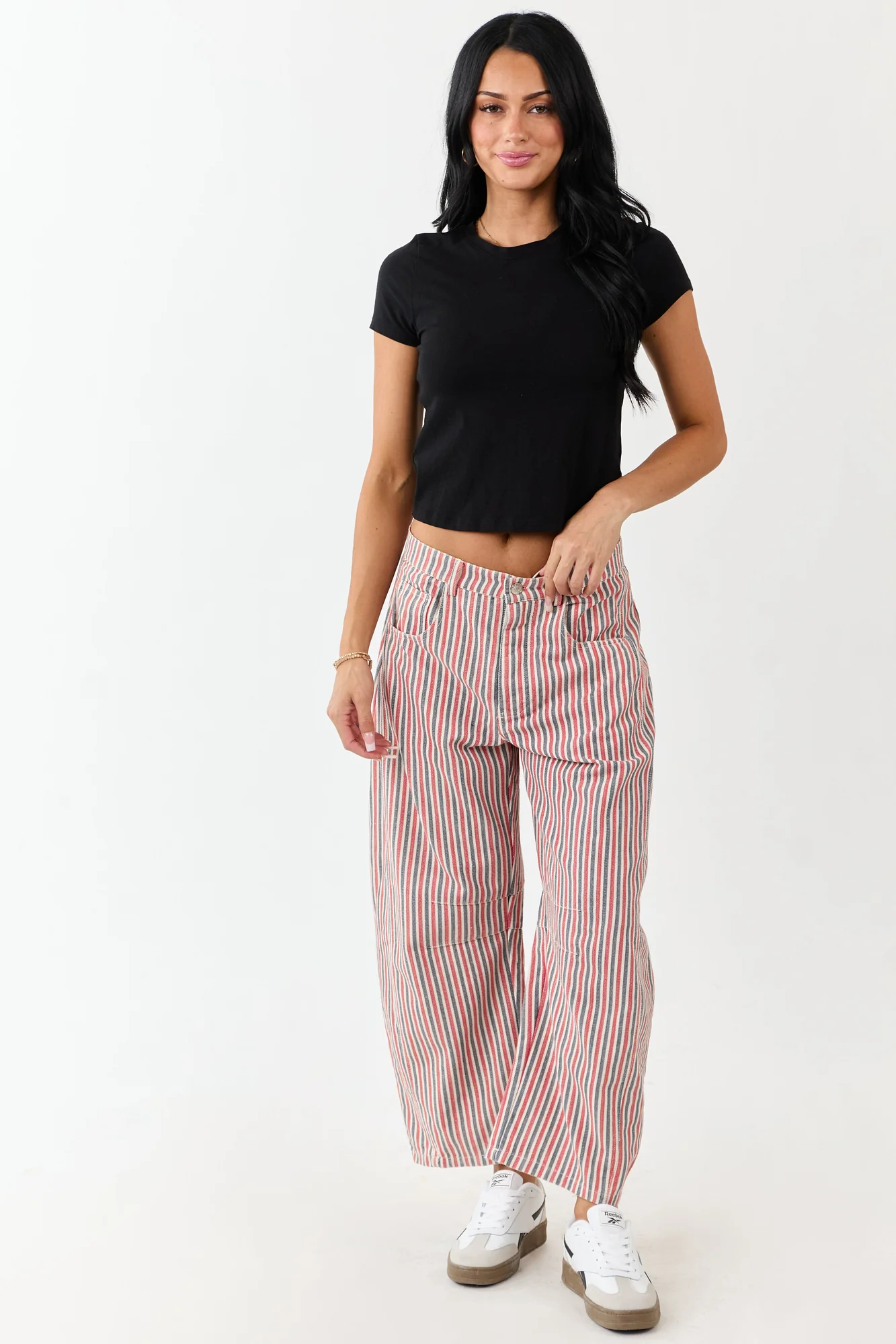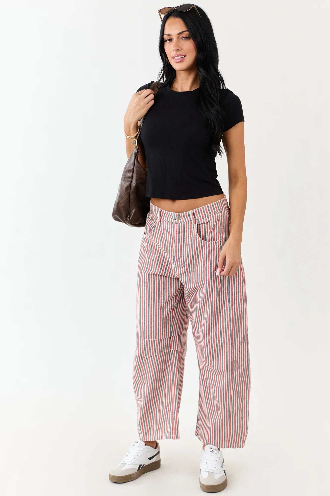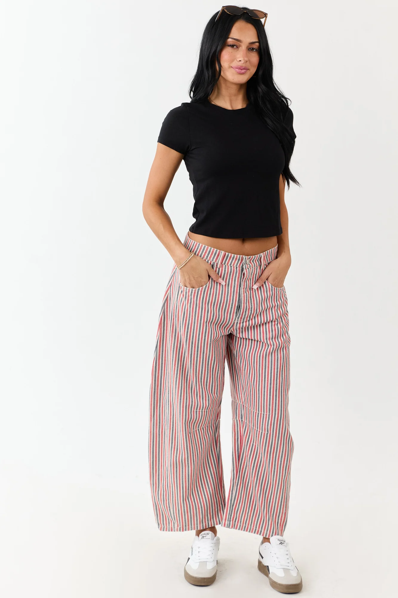 Striped High-Rise Barrel Fit Cropped Pants in Steel Blue Ruby Cream