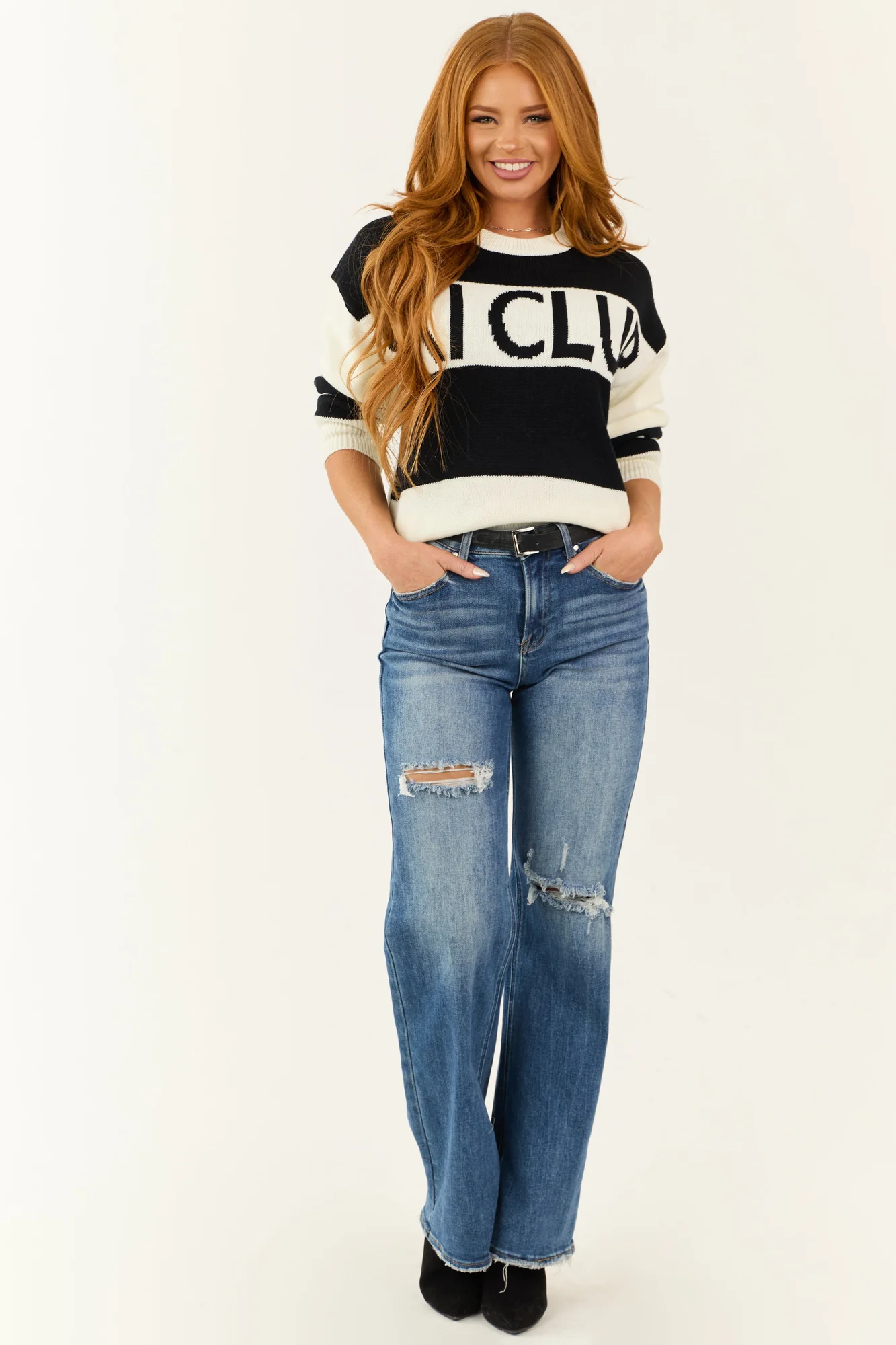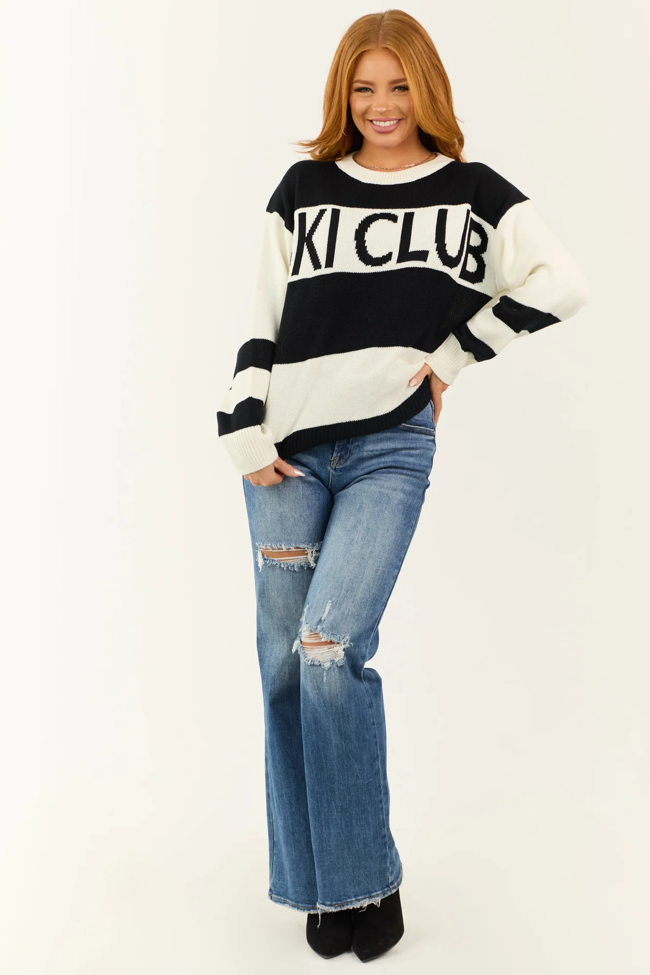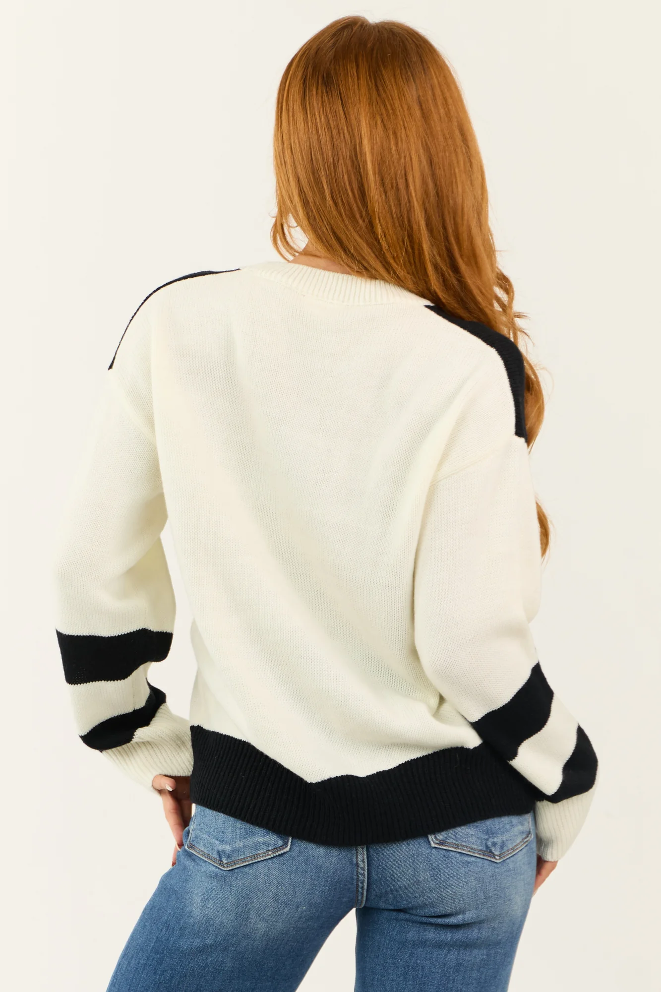 Stay stylish and warm with our versatile Striped Knit Sweater in Black and Ivory. Made from stretchy knit fabric, this sweater features long sleeves, drop shoulder, and ribbed trim for a snug fit. Available in XS, S, M, and L sizes. Length varies from 23.5 to 25 inches, with a bust size ranging from 42 to 48 inches. Crafted from 100% Acrylic, it is both comfortable and trendy. This unlined sweater is perfect for daytime outings during winter. Remember to hand wash cold, separately in color, avoid bleach, lay flat to dry, and only cool iron if needed. Bring timeless style to your wardrobe!