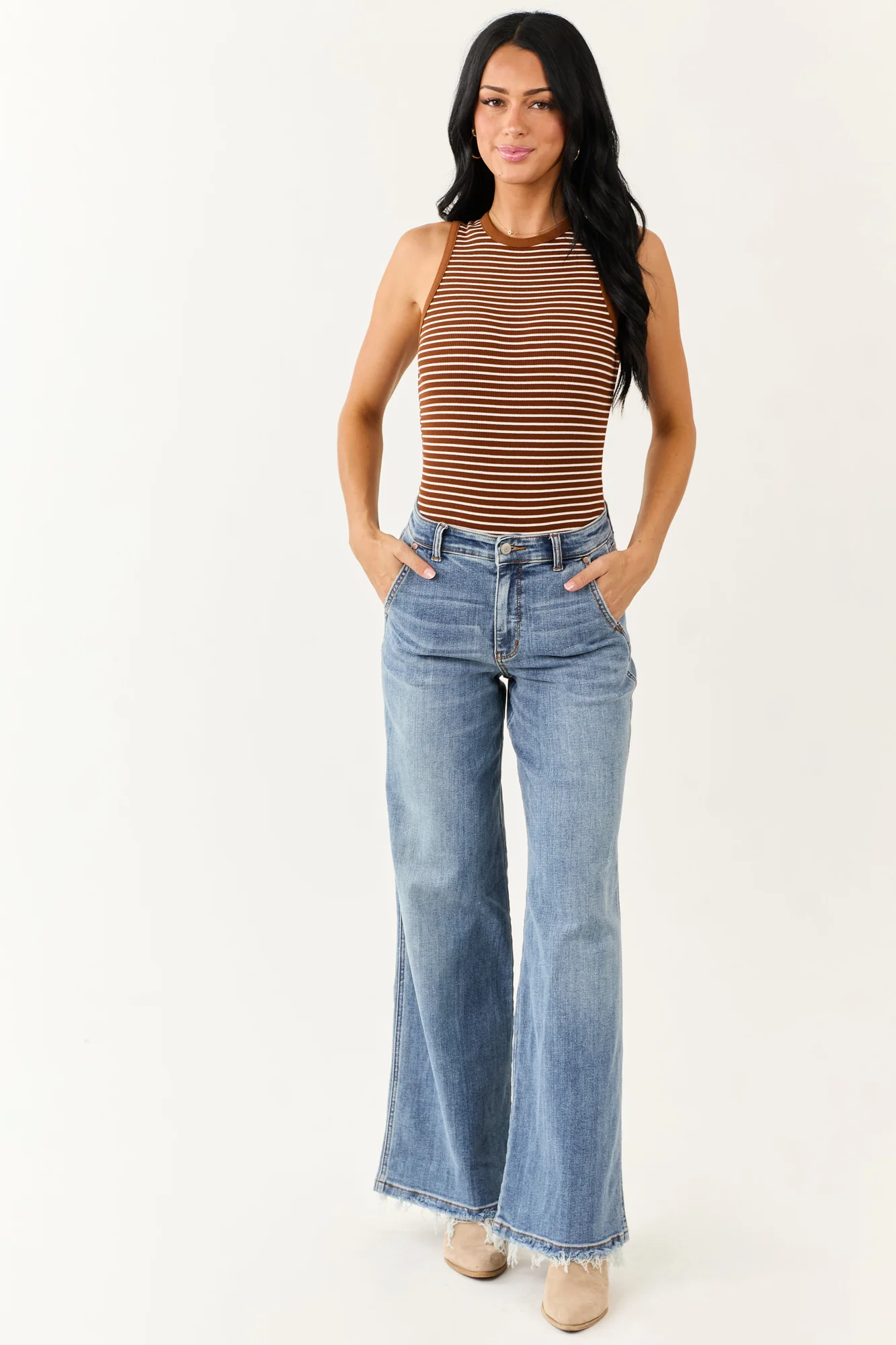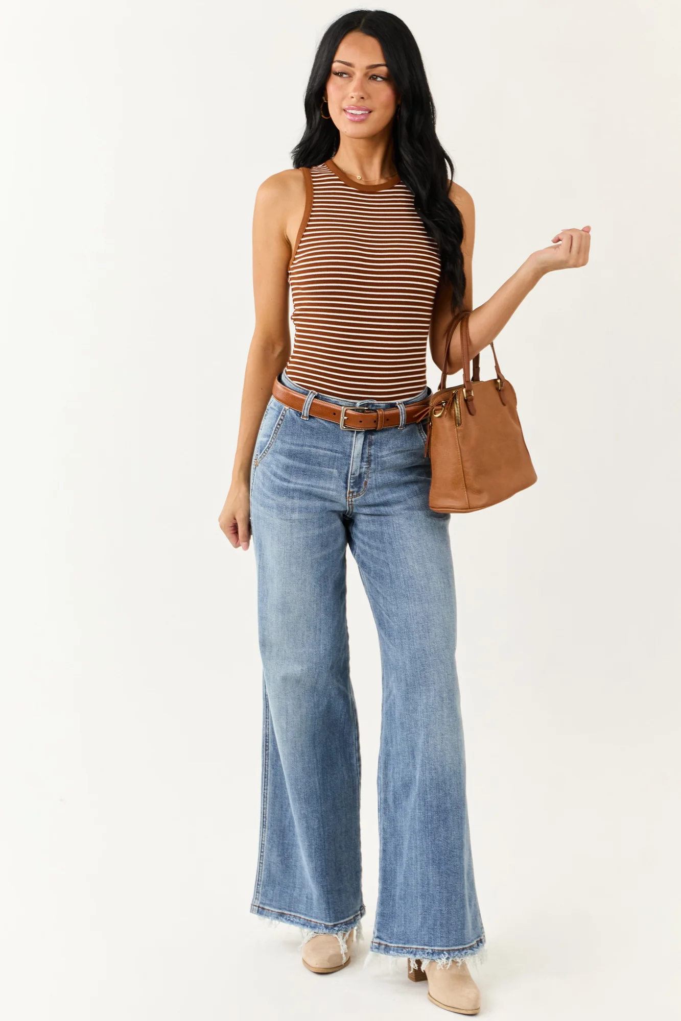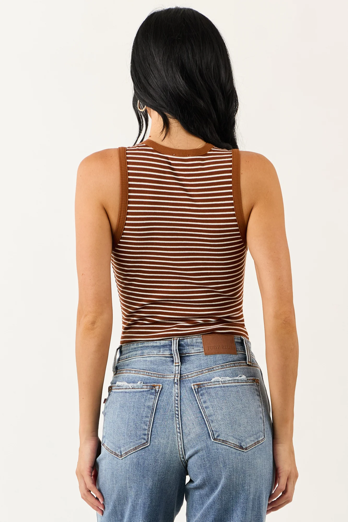 This Striped Knit Tank Bodysuit in sepia and off white is designed to flatter your curves while keeping you on trend. Made from a stretchy ribbed knit with banded trim, this classic bodysuit features a thong cut and double snap button crotch closure for added convenience. Available in sizes XS, S, M, and L with bust measurements ranging from 23″ to 29″ and torso lengths from 27″ to 28.5″. The strap length is 2.5″ for all sizes. Crafted from 95% Cotton and 5% Spandex, this imported bodysuit is a final sale item. Models measurements: Size 1, Height 59″, Bust 34″, Waist 26″.