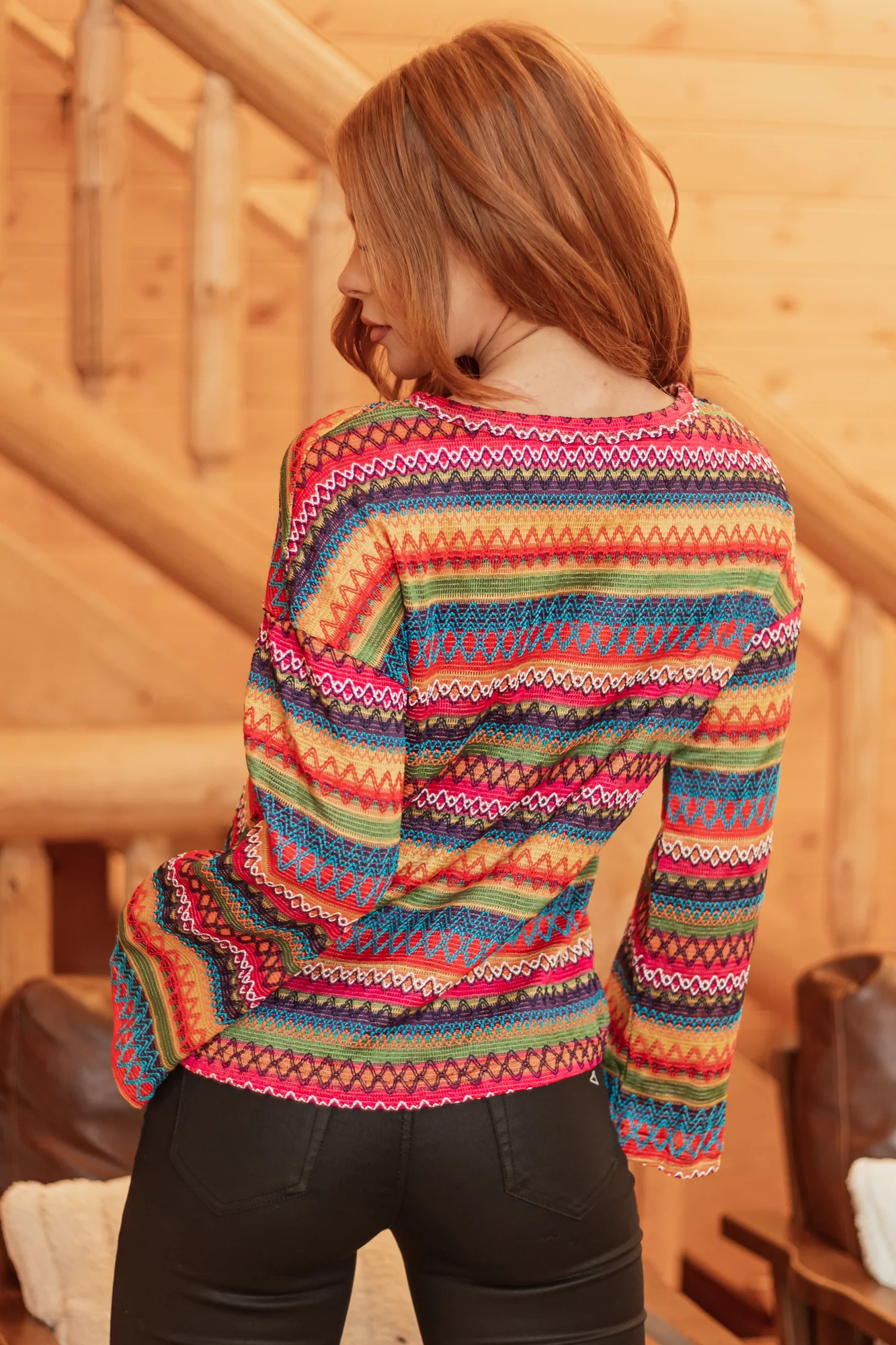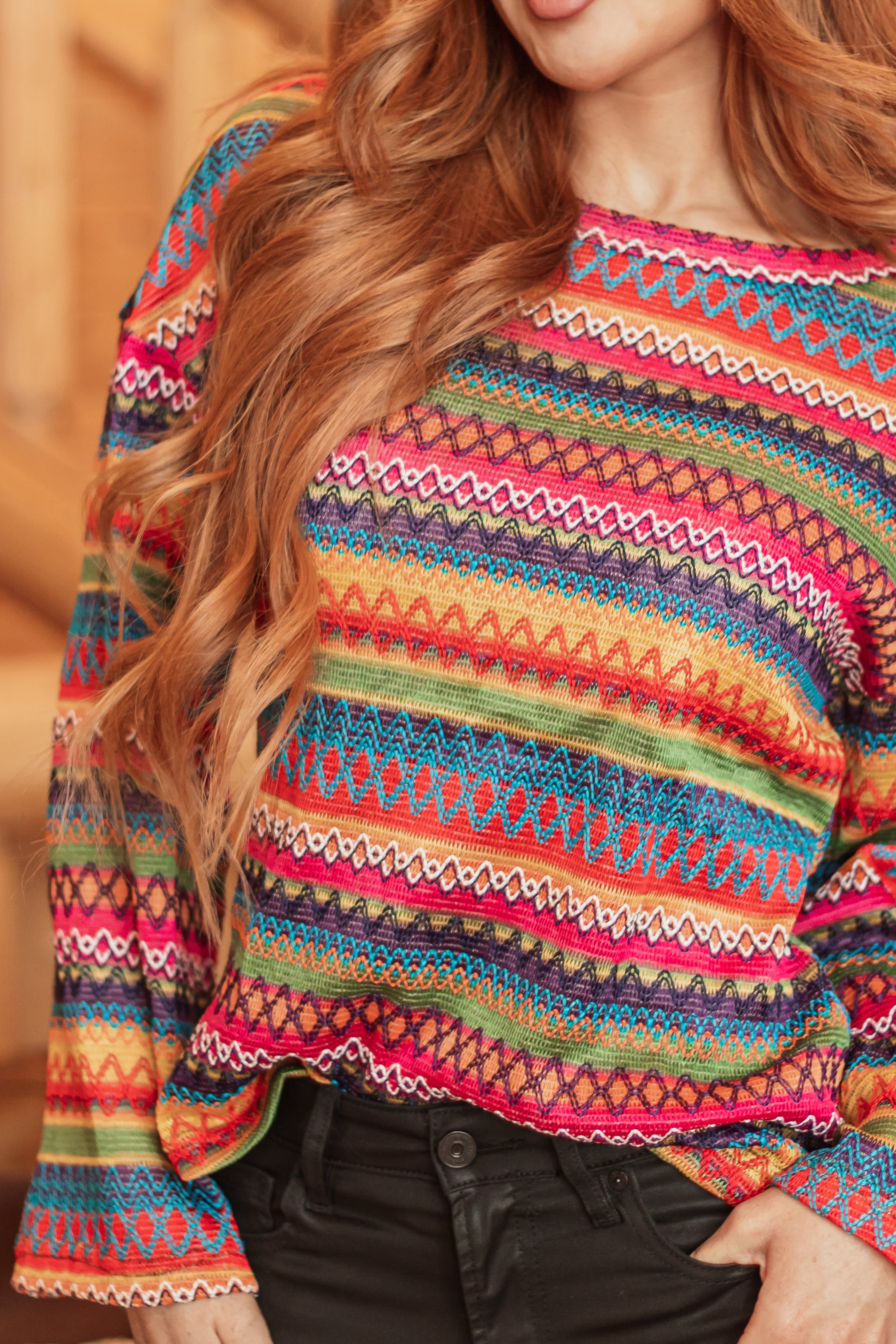 Stay stylish with this loose fit, stretchy knit top featuring colorful stripes and geometric patterns in Brick, Azure, Grape, Jade, Lipstick, Mustard, and Tangerine. Made with crochet stitching, bell sleeves, and a round neckline for a chic look. Perfect for any occasion. Care instructions: hand wash cold, iron low. Model is wearing size Small.