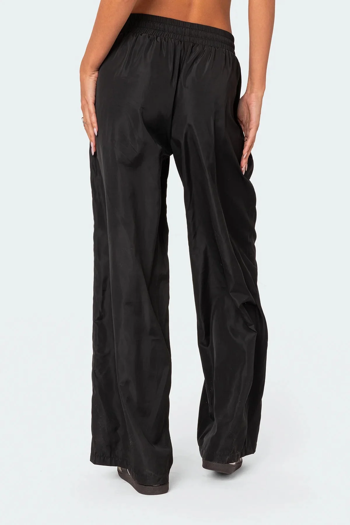 Discover the perfect blend of style and comfort with our black and white Striped Nylon Track Pants. Featuring contrasting stripes and an adjustable tie waist for a customized fit, these pants offer an oversized silhouette crafted from high-quality nylon fabric with a polyester lining. Ideal for various occasions, these track pants exude a sporty-chic vibe that keeps you on-trend effortlessly. Elevate your wardrobe with these versatile and fashionable track pants. Model wears size S. Model height is 59. Care instructions: Machine wash cold with similar colors.