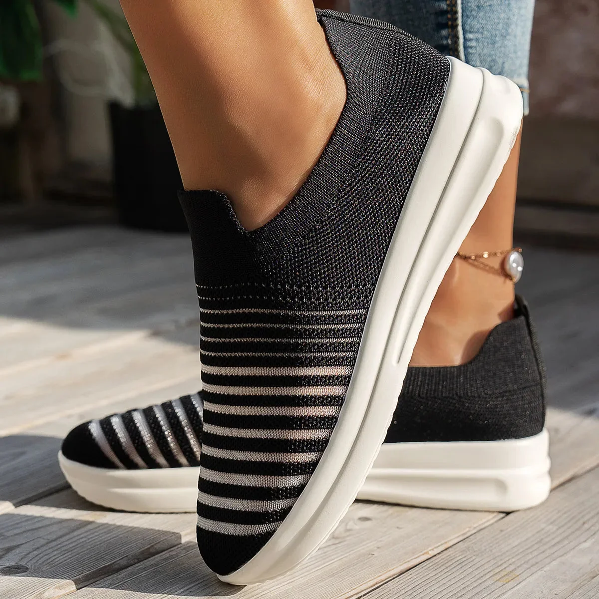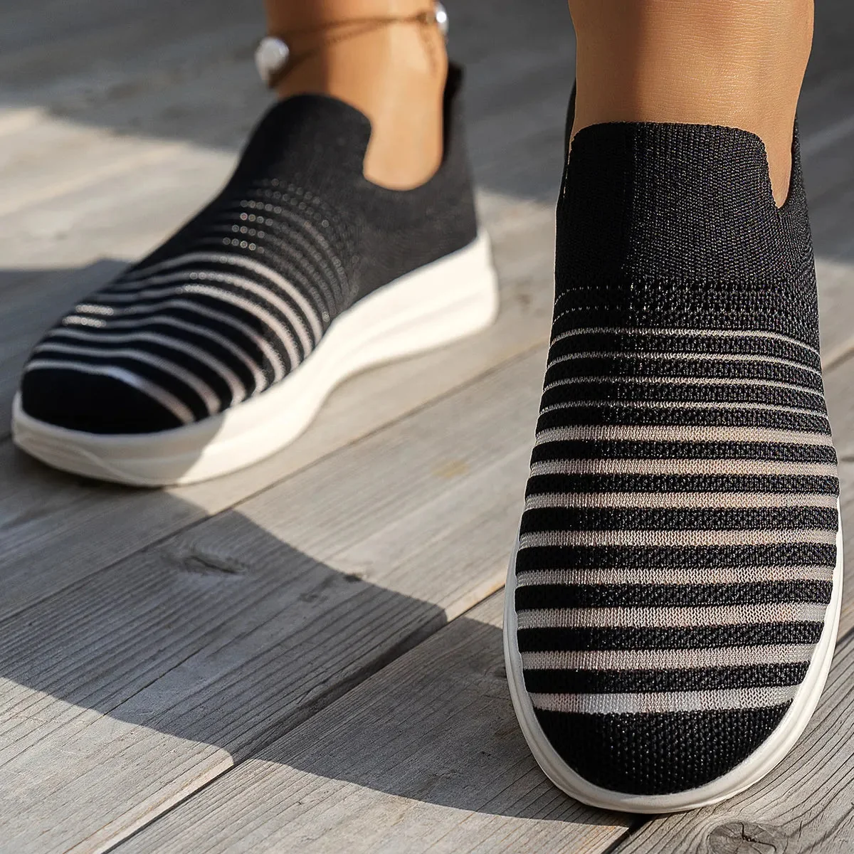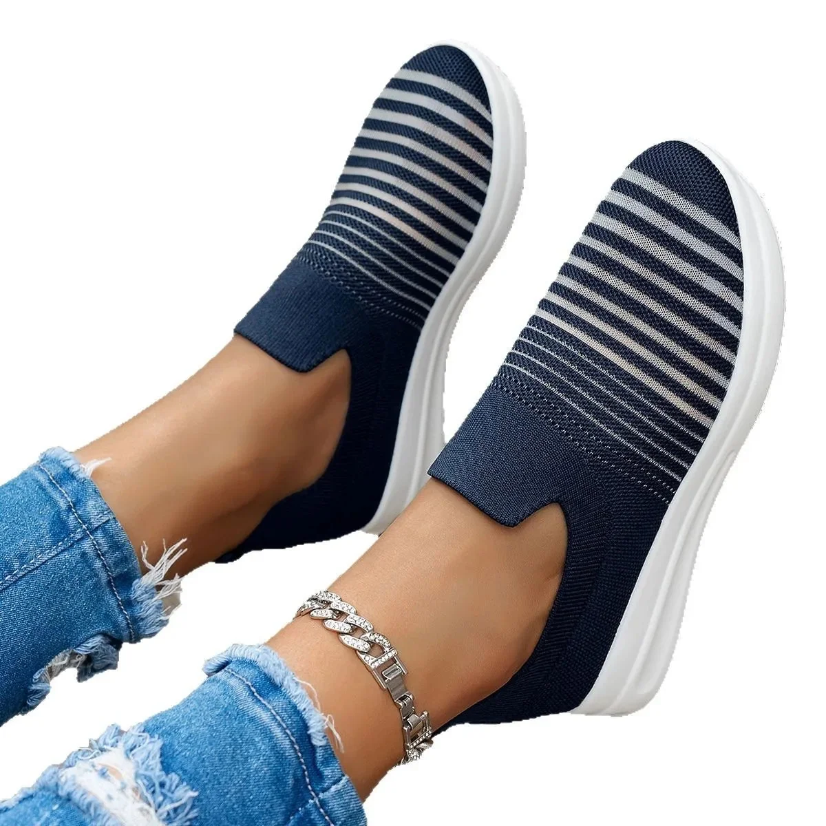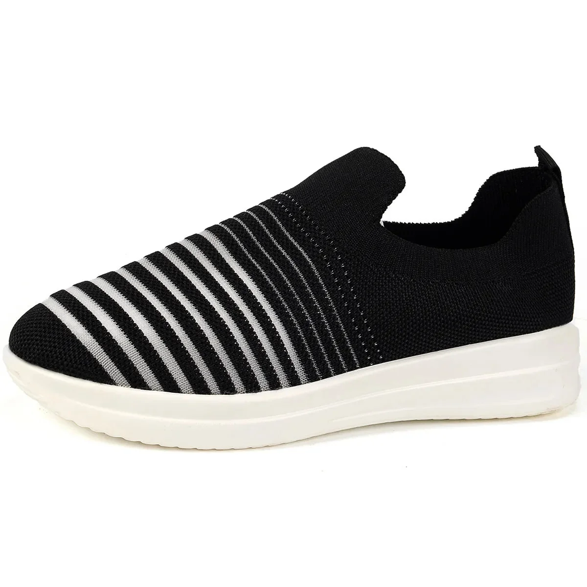 These stylish Striped Platform Slip-On Shoes for women are both classy and comfortable. The fit is true to size, so you can simply order your usual size for a perfect fit. The low heels provide a blend of elegance and convenience suitable for various occasions. Crafted with high-quality mesh, PU leather, and rubber, these shoes ensure durability and style. Imported with precise measurements and size conversions, these Slip-Ons are a must-have addition to your footwear collection. Feel confident and chic with these fashionable shoes.