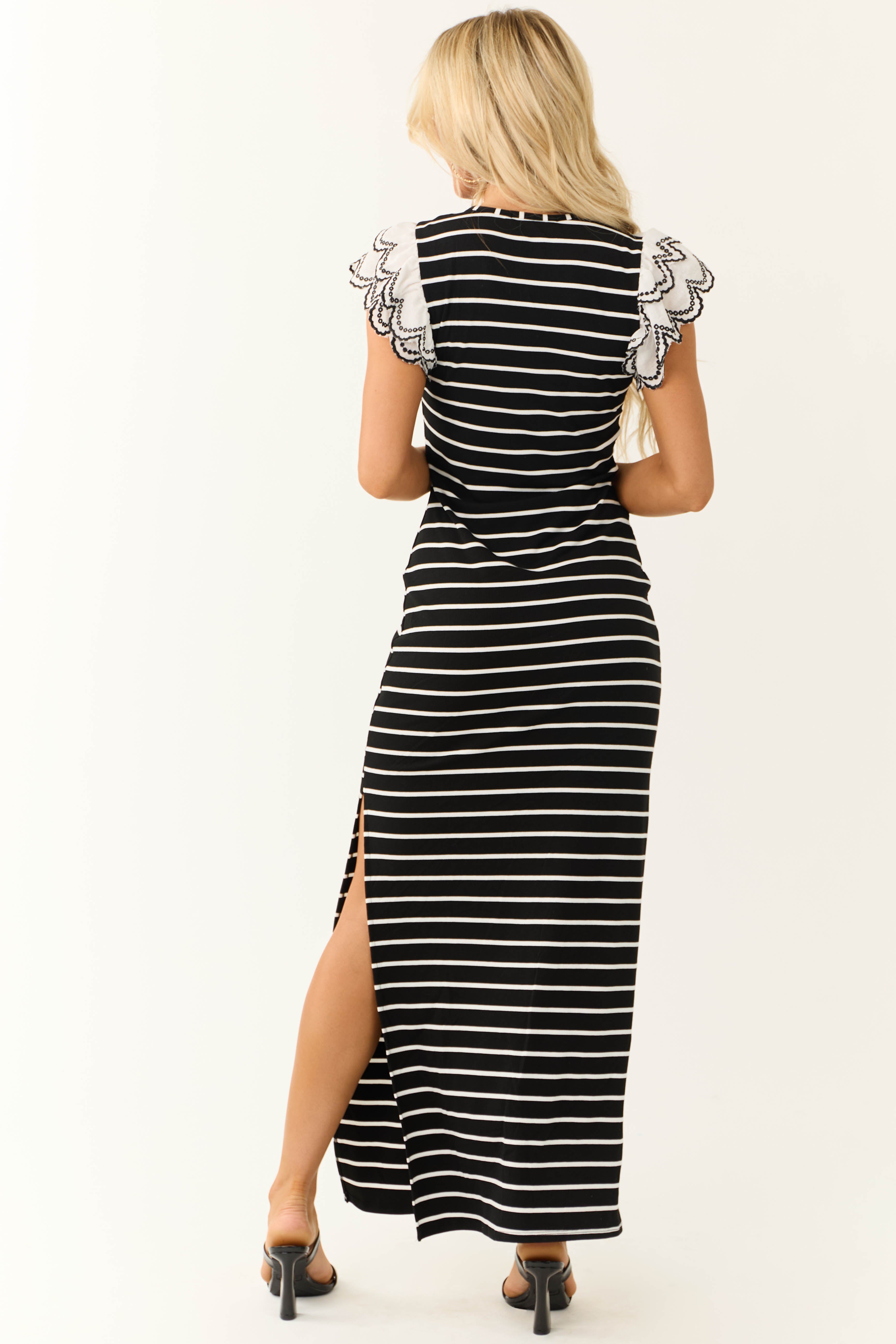 Stay stylish in this Bodycon fit dress with short tiered ruffle sleeves and scallop trim. Made in USA from comfortable ribbed knit fabric. Features contrast Black stitch detail, side slit, round neckline, and a stretchy, figure-flattering design. Easy-care 60% Polyester, 30% Rayon, 10% Spandex material. Suitable for day or evening wear. Hand wash cold, hang dry. Available in sizes Small, Medium, and Large.