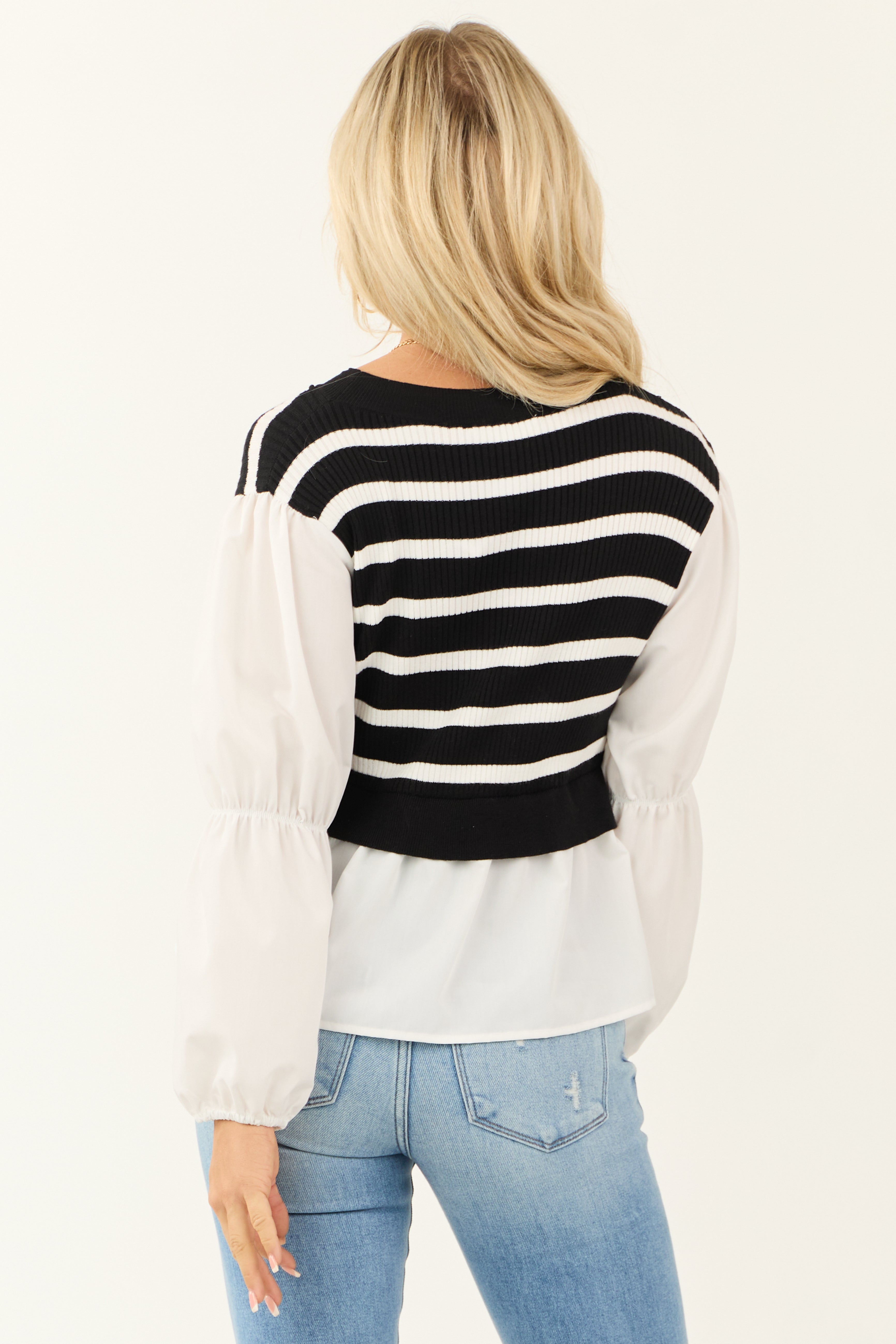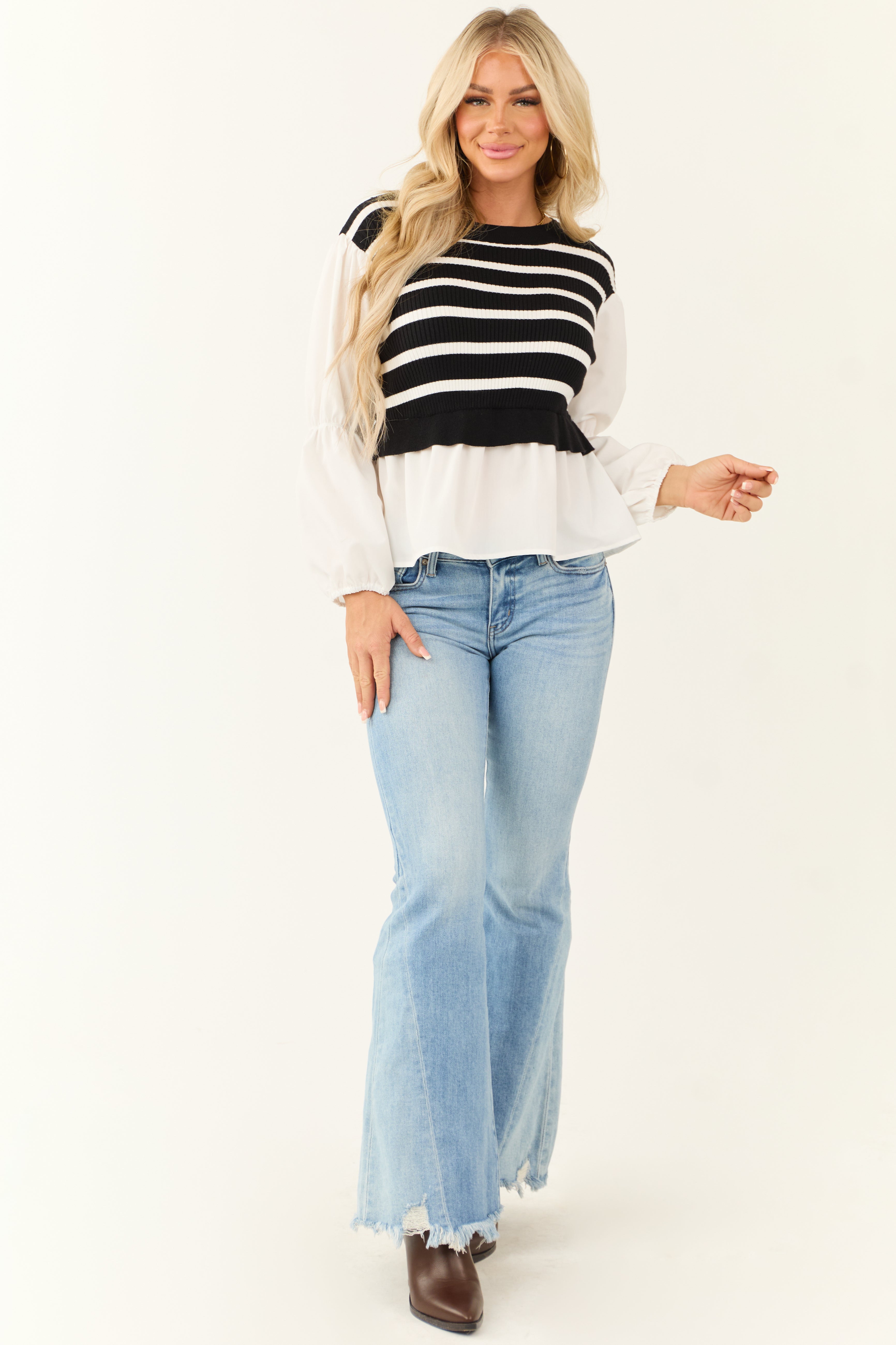 Stay cozy and stylish with our Sleeveless Knit Sweater Top in Black and Ivory stripes. This top features a high neckline, long puff sleeves with elastic cuffs, a flattering ruffle hem detail, and a stretchy ribbed knit bodice combined with non-stretchy woven sleeves and hem. Perfect for everyday wear with its comfortable yet chic design. Hand wash recommended. Model is wearing size Small.