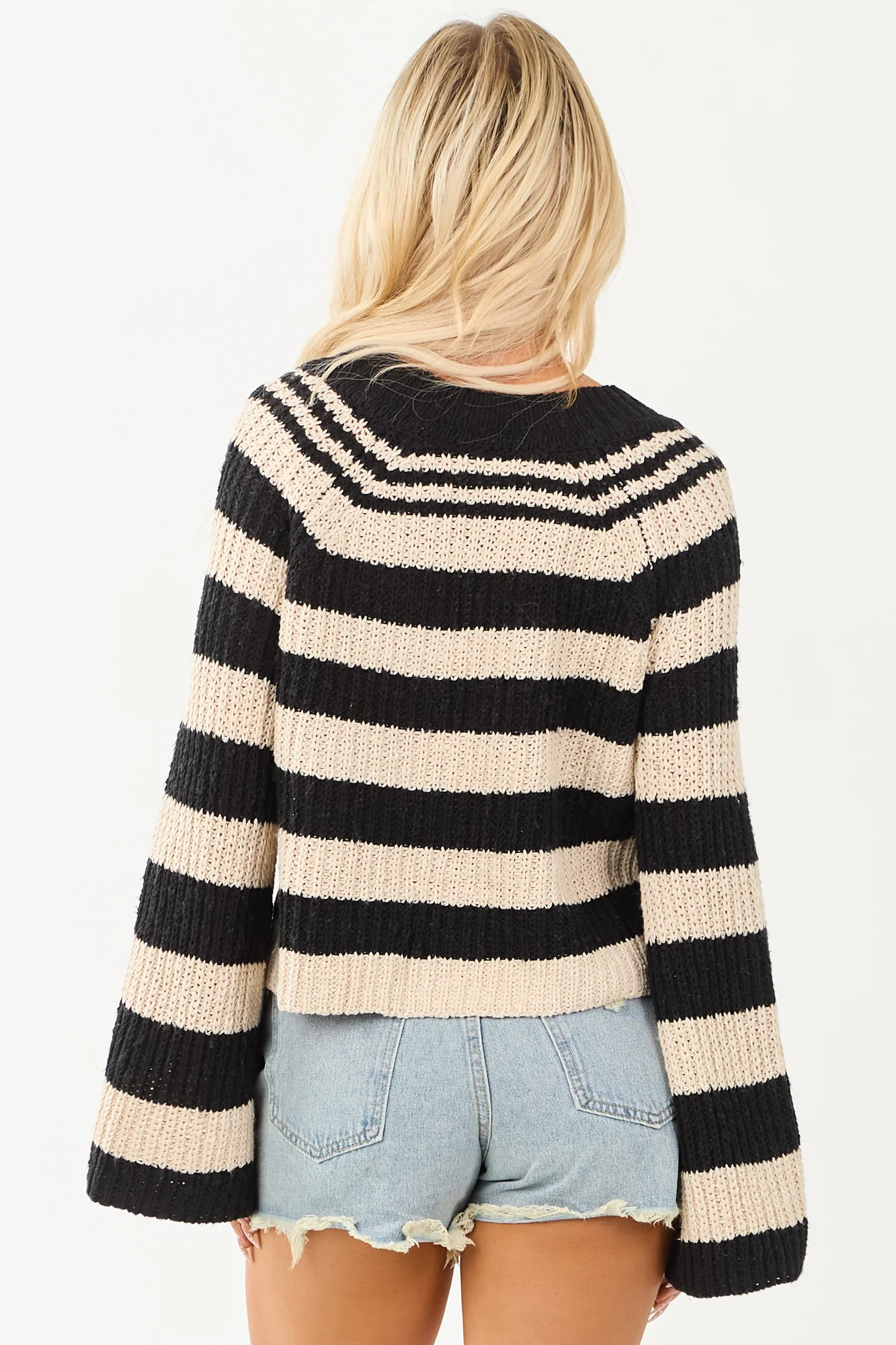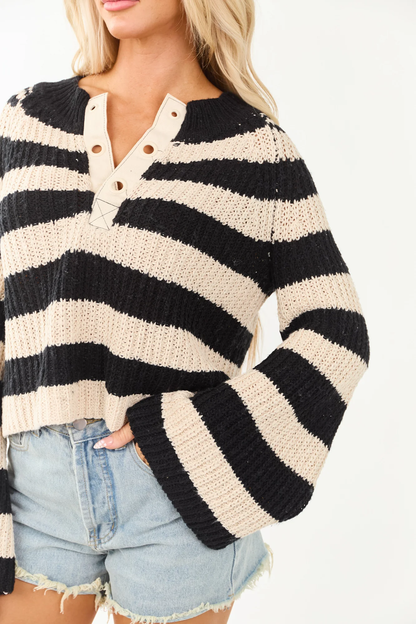 Stay warm and stylish with our Striped V-Neck Black Knit Sweater! This casual sweater is perfect for chilly days, featuring an oversized fit, stretchy knit fabric, side slits, and grommet embellishments. Made of 100% polyester for comfort and durability. Available in sizes S, M, and L. Model is wearing a size Small. Ideal for layering or wearing on its own, its a versatile addition to your wardrobe. Elevate your casual look with this chic sweater from eesome!