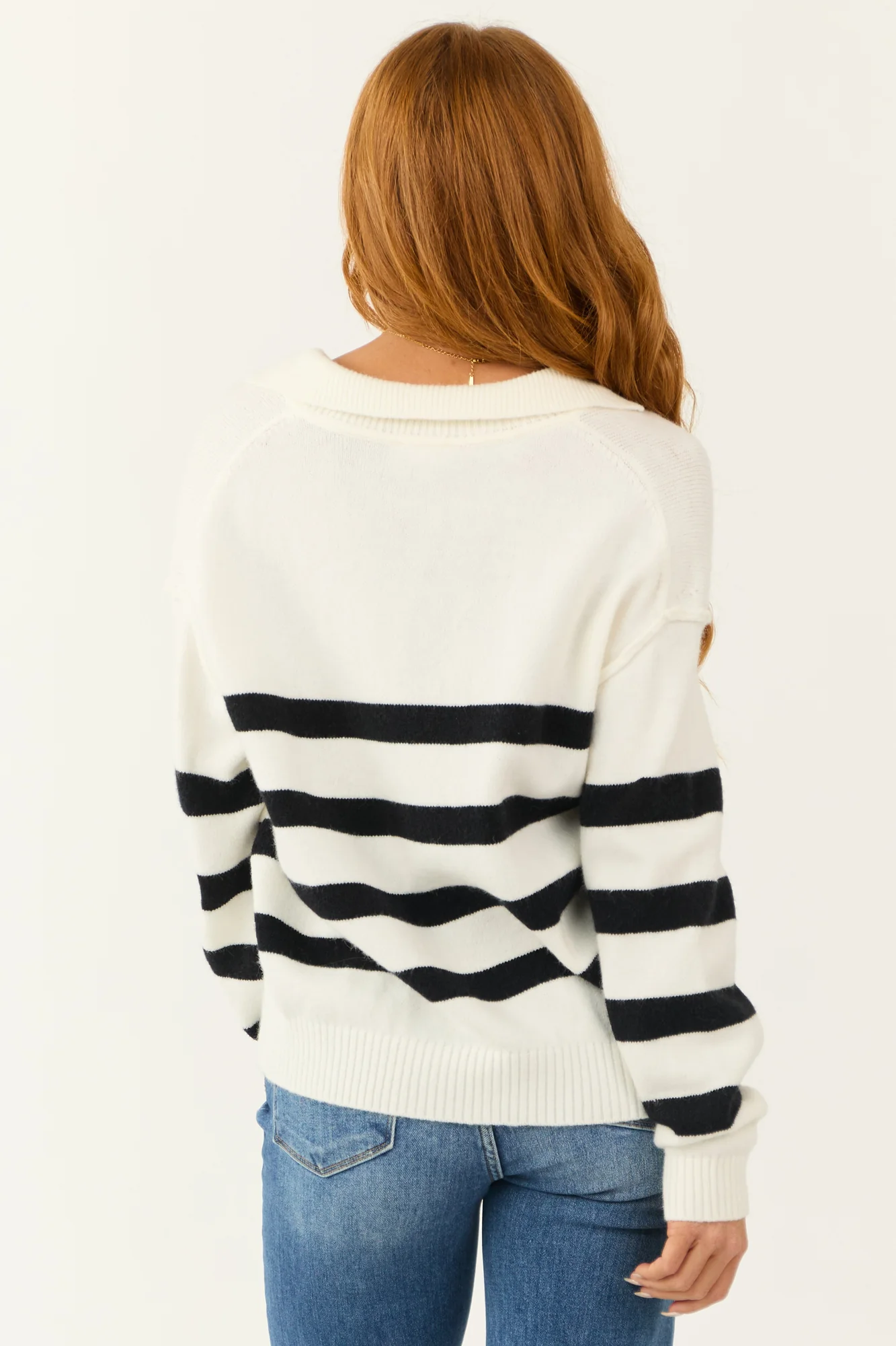 This comfortable Ivory Striped V Neck Knit Sweater comes in sizes Small, Medium, and Large. Featuring a casual fit with super stretchy knit material, it has stylish black stripes, drop shoulders, ribbed trim, and a V neckline. Made of 52% Acrylic, 28% Nylon, and 20% Polyester, it is both cozy and fashionable. Perfect for the winter season. Hand wash cold, lay flat to dry or dry clean recommended. Variations may occur due to the cutting and sewing process. Model is wearing a size Small. Sizes: S – Sleeve: 24″ Length: 24″ Bust: 44″; M – Sleeve: 25″ Length: 24″ Bust: 46″; L – Sleeve: 26″ Length: 24″ Bust: 48″