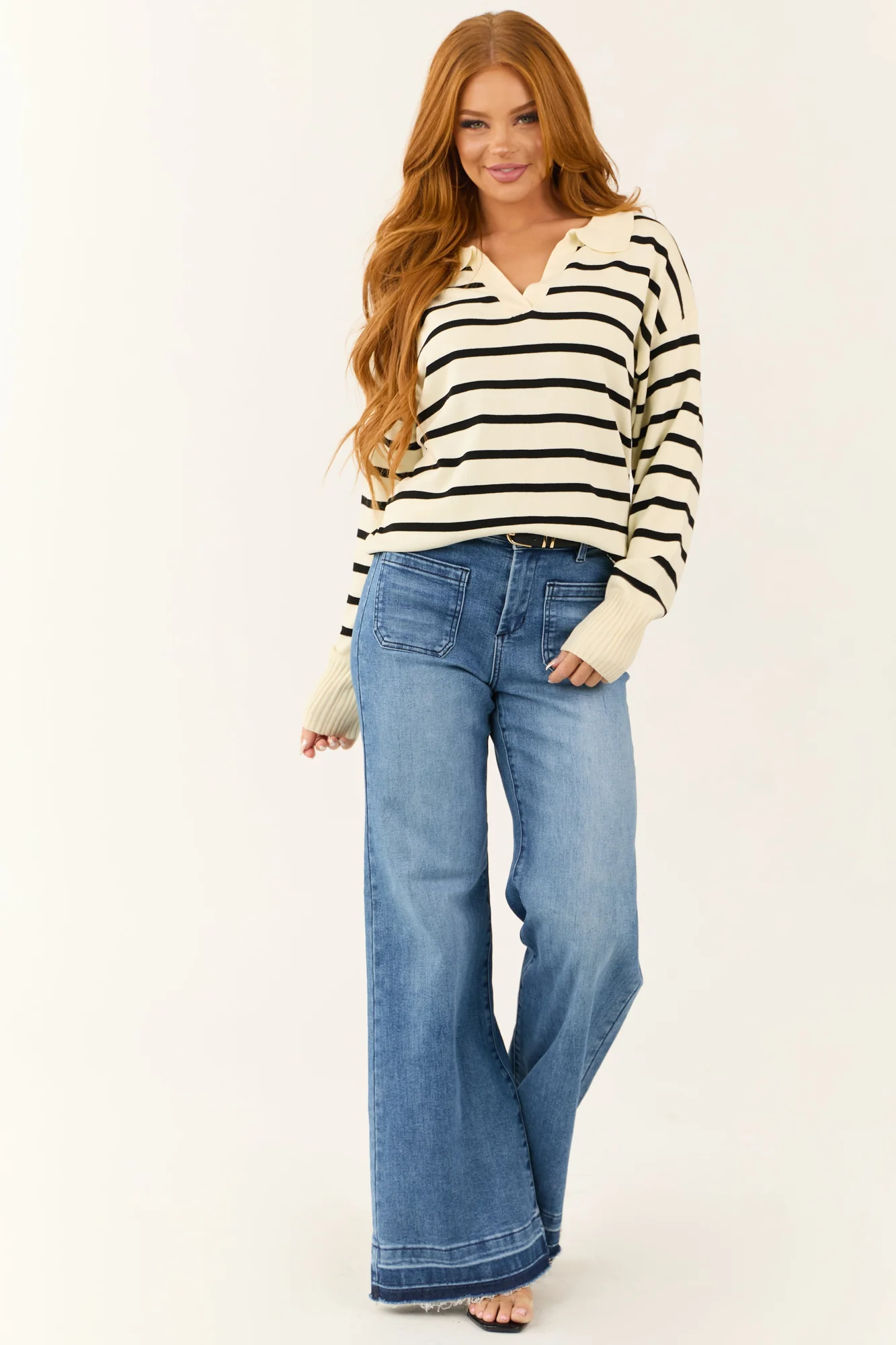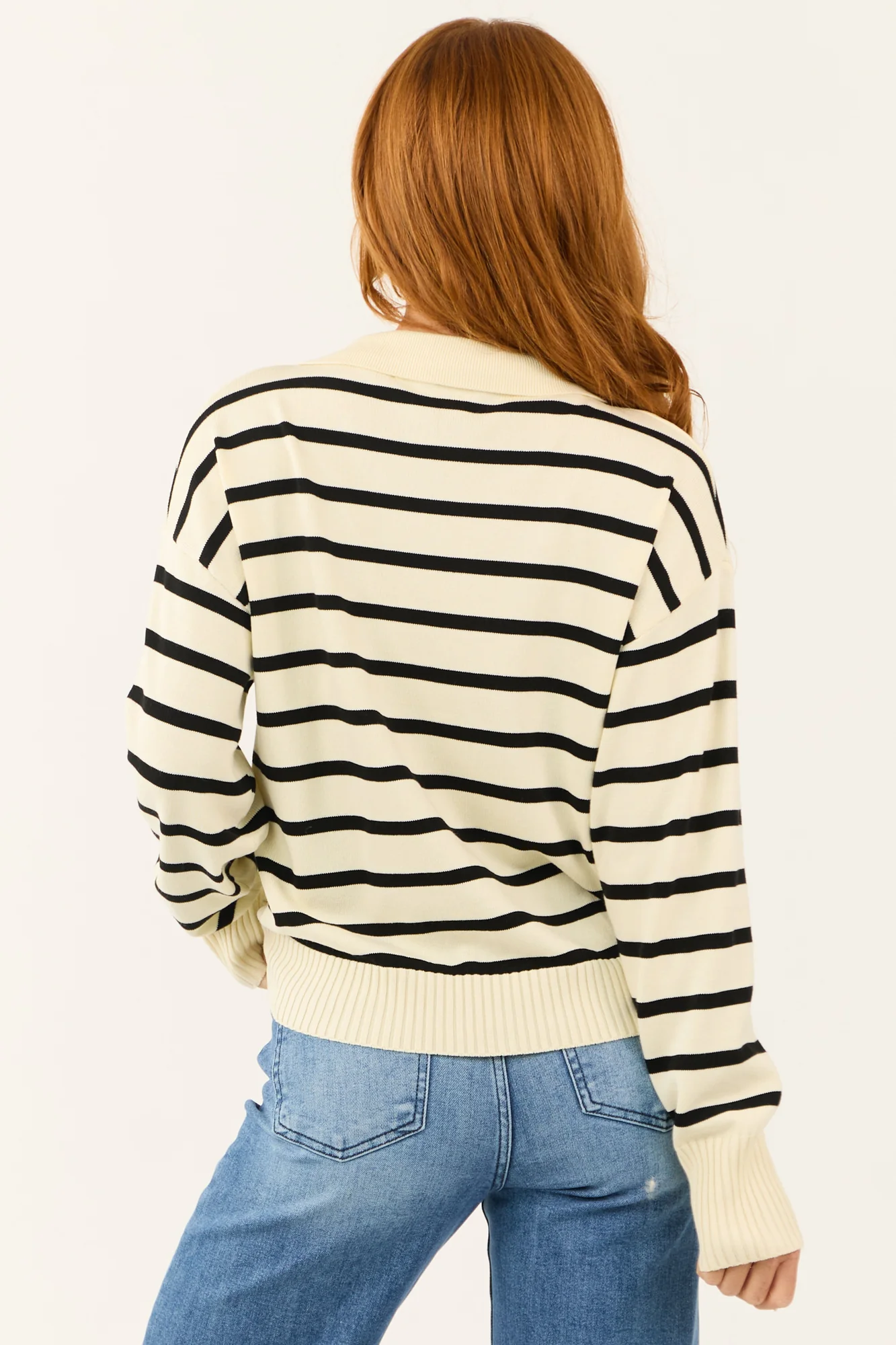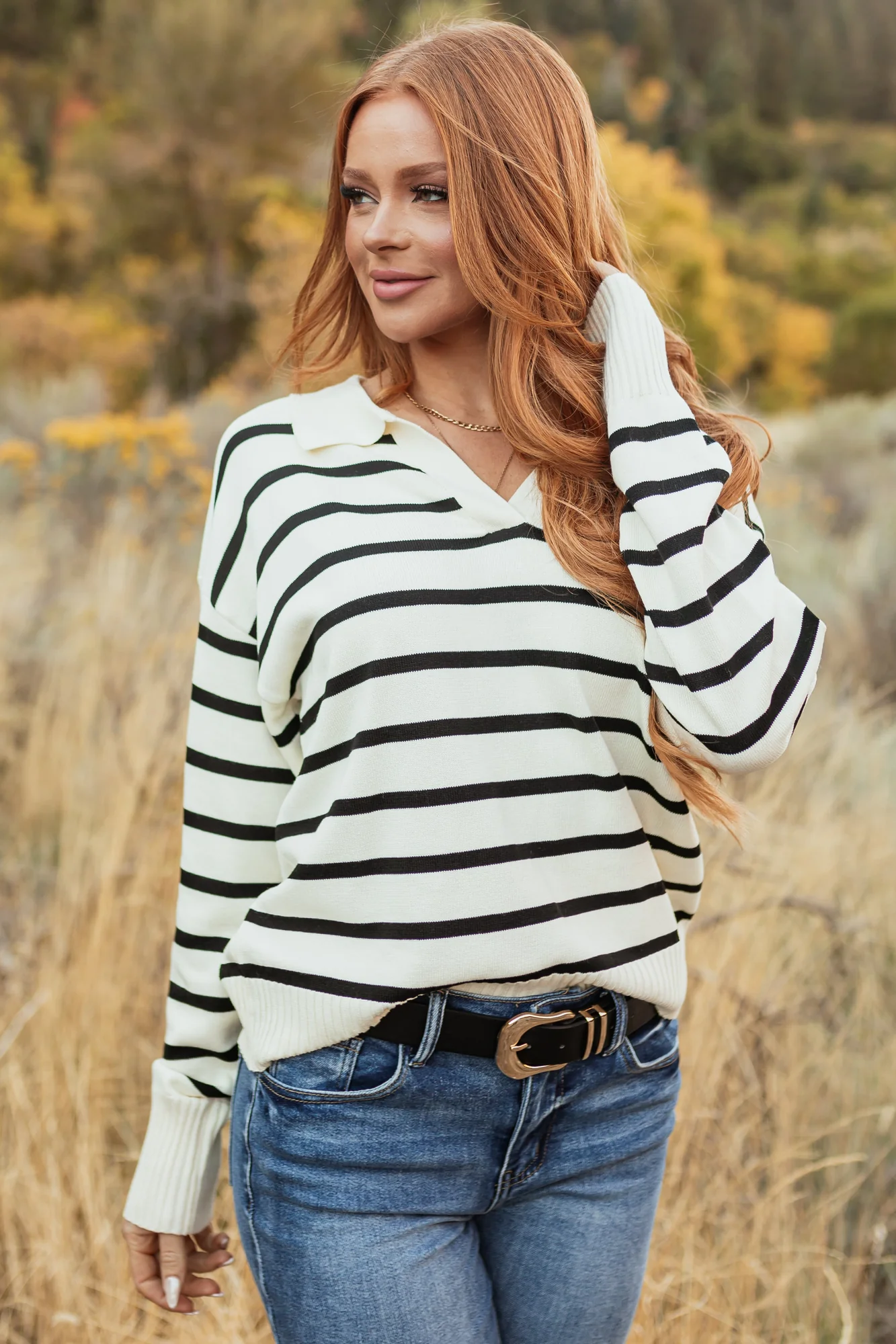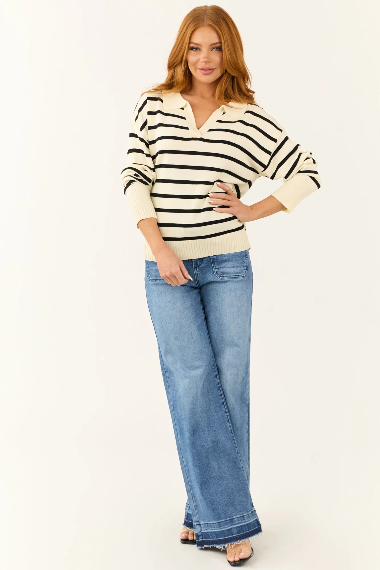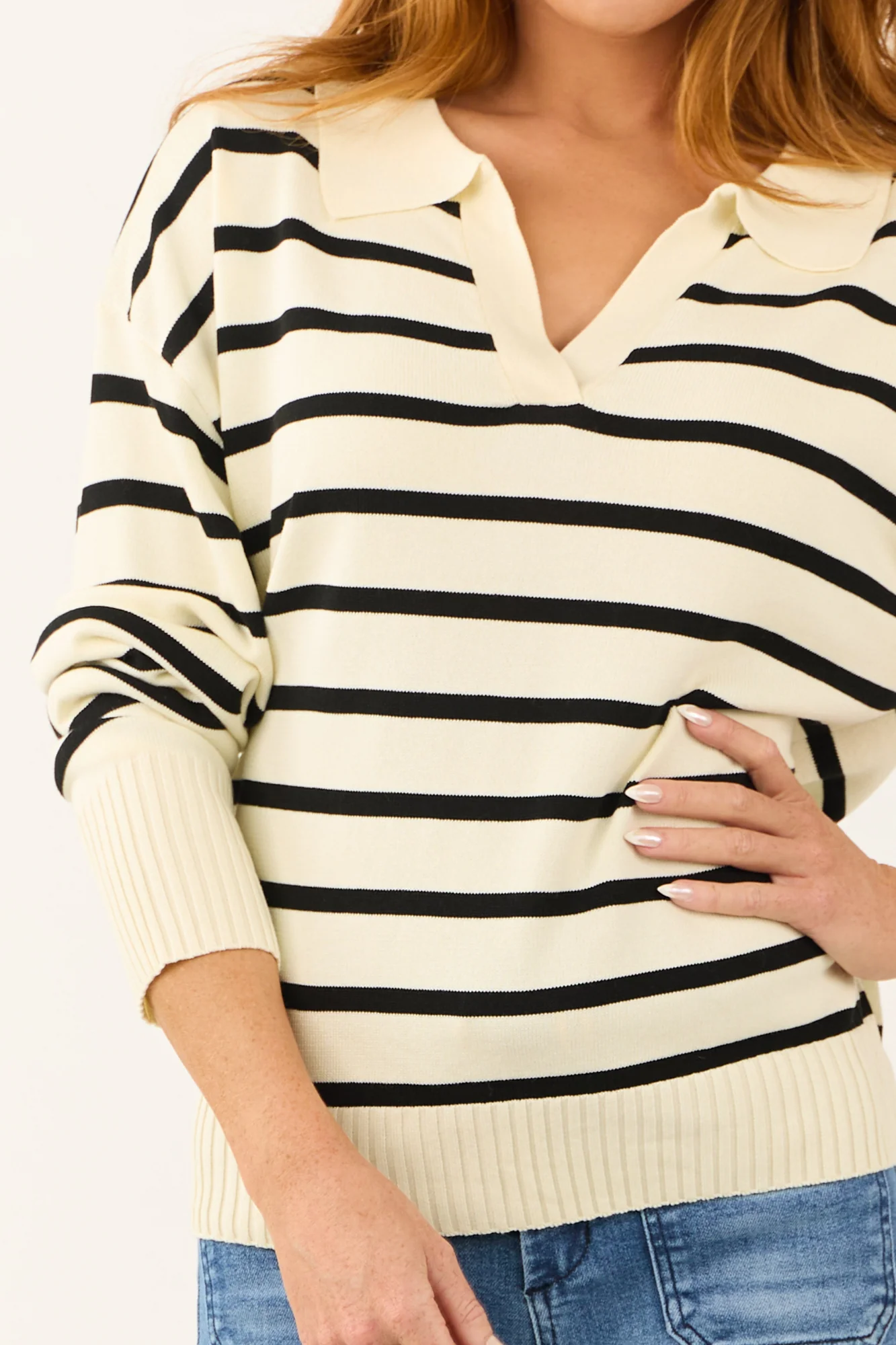 Indulge in timeless style with our Striped V-Neck Pullover Sweater, a classic, preppy essential exuding sophistication. Crafted from a stretchy rib knit blend of 85% Viscose and 15% Polyester, this sweater features ribbed banded cuffs and hem, long sleeves with a drop shoulder design, and comes in a versatile cream and black color combination. Available in sizes S, M, L, and XL, this piece offers both comfort and style, making it a wardrobe must-have for any fashion-forward individual. Imported.